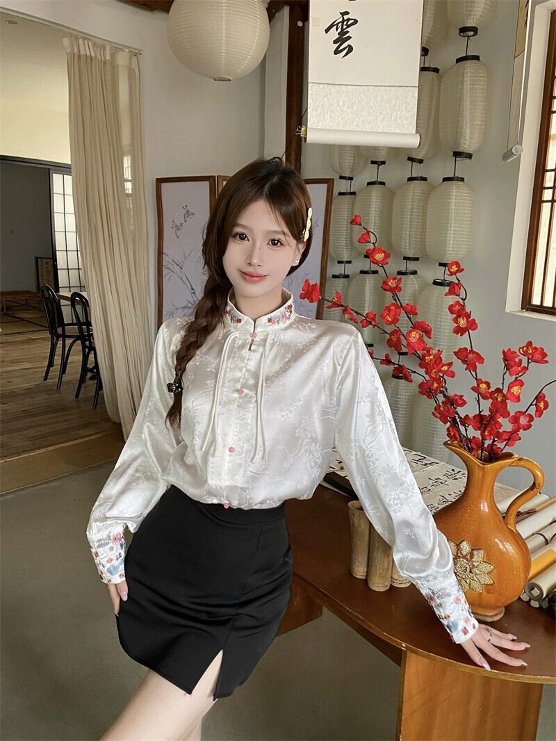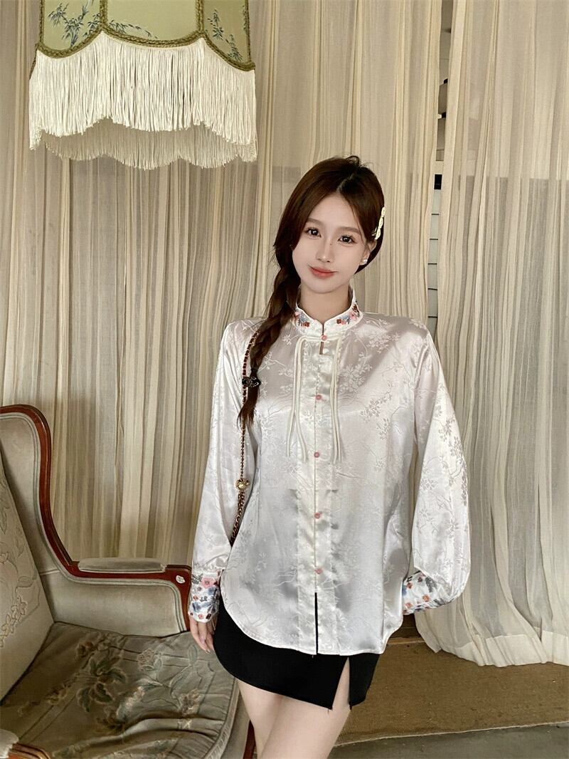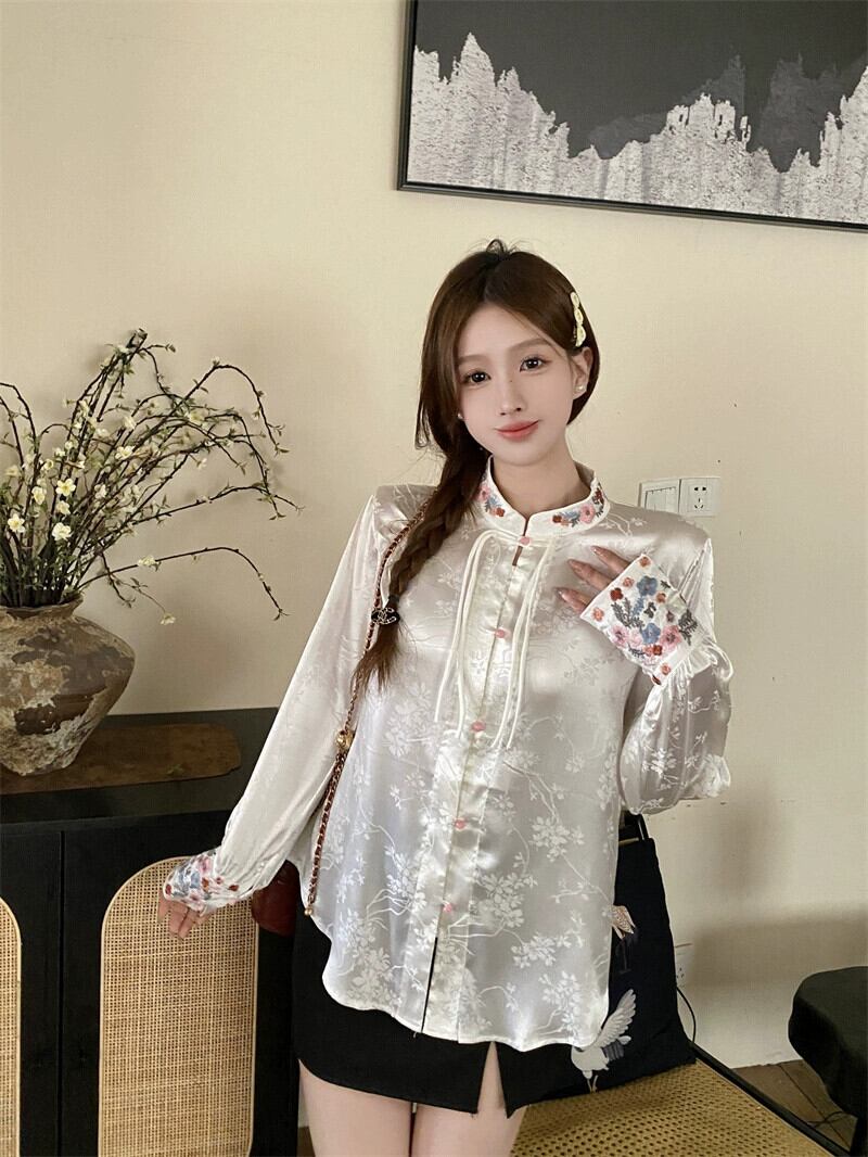 中国風国民風スタンドカラーシャツレディース春刺繍フラワーシャツゆったりシックな長袖トップ ロング レッド スプリング 春物 フラワーデザイン missk46077784246