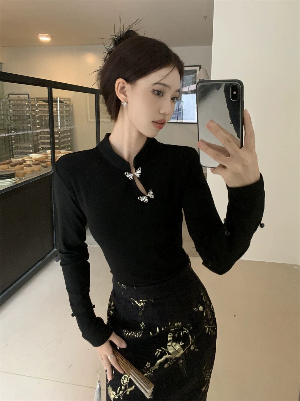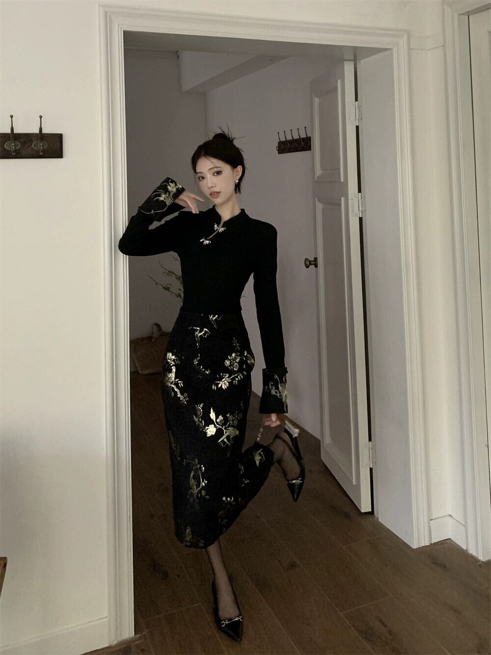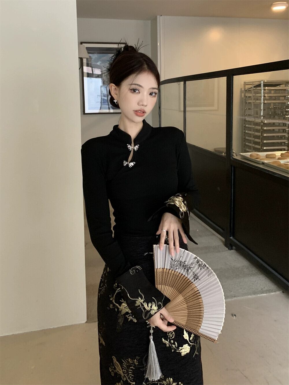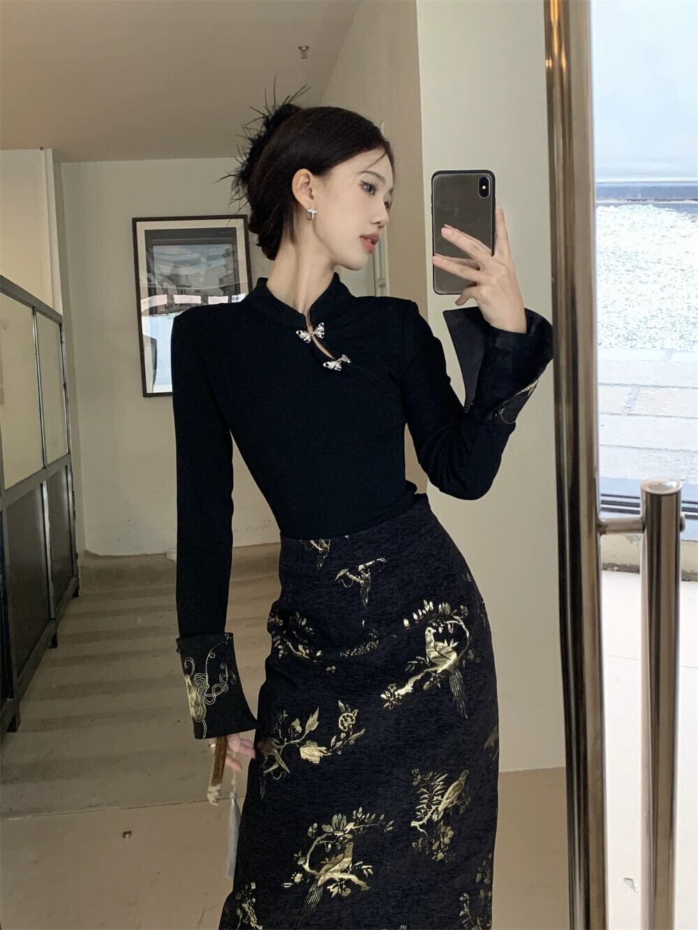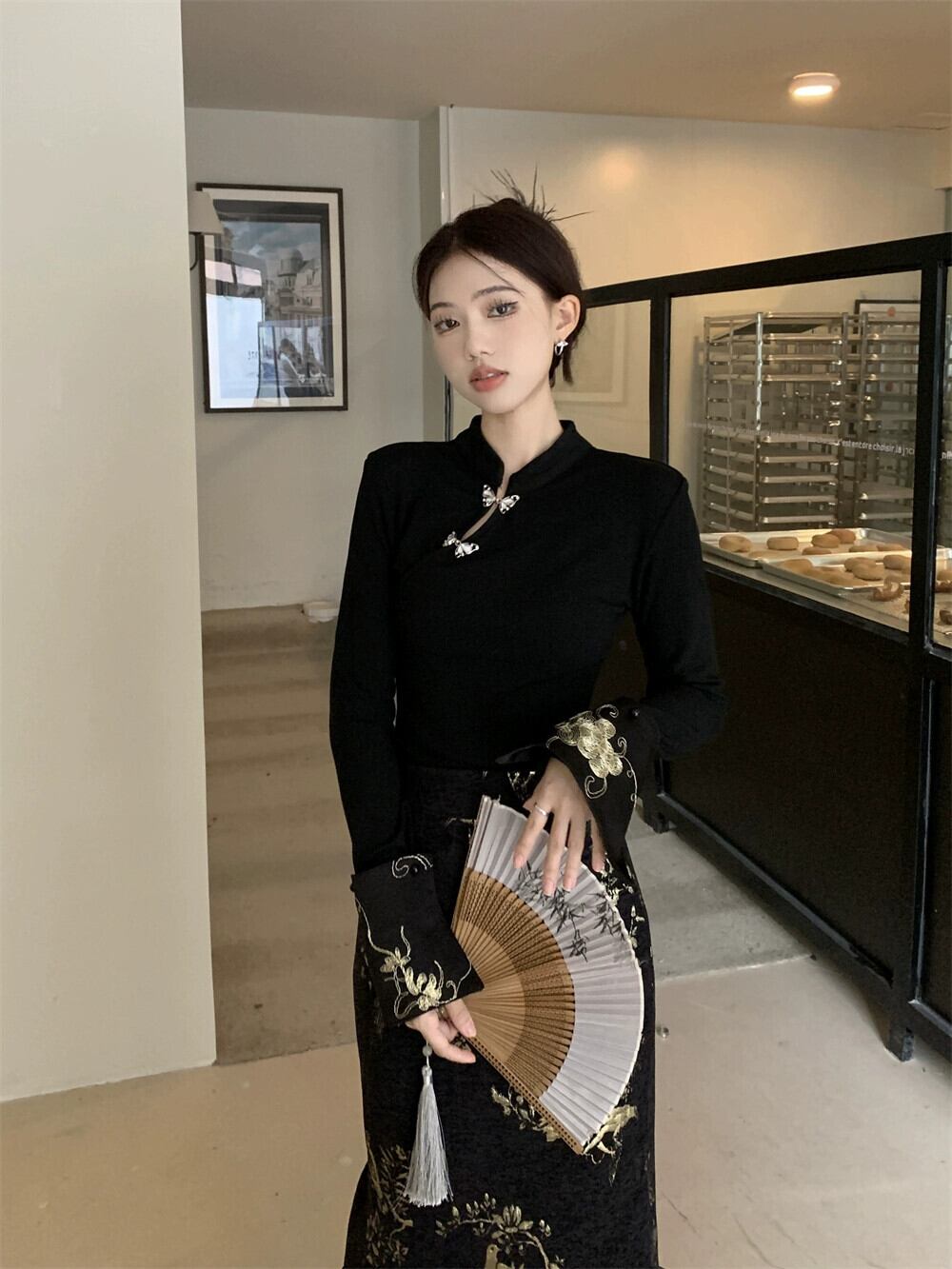 春先のチャイナスーツ女性、チャイナ風、ボタンダウン、スタンドカラー、長袖シャツ、ハイウエスト刺繍入りヒップカバースカート、2点セット ロング レッド スプリング 春物 missk56719955021