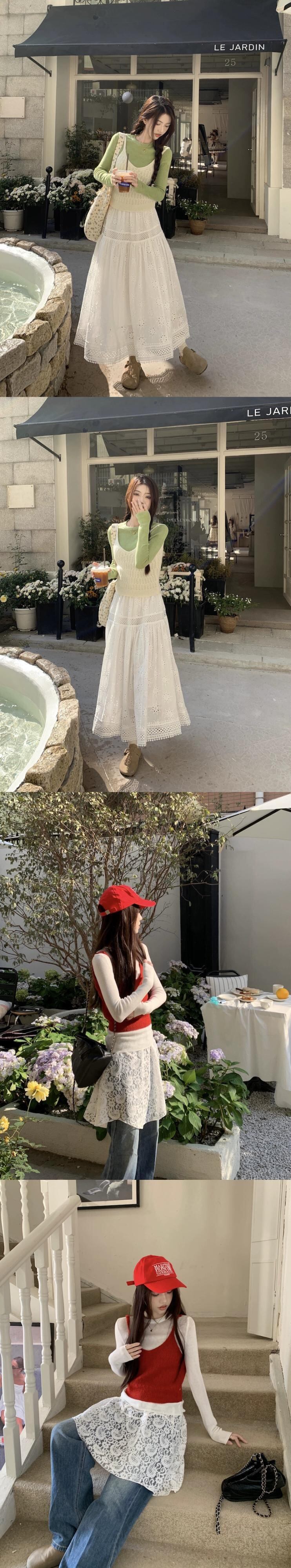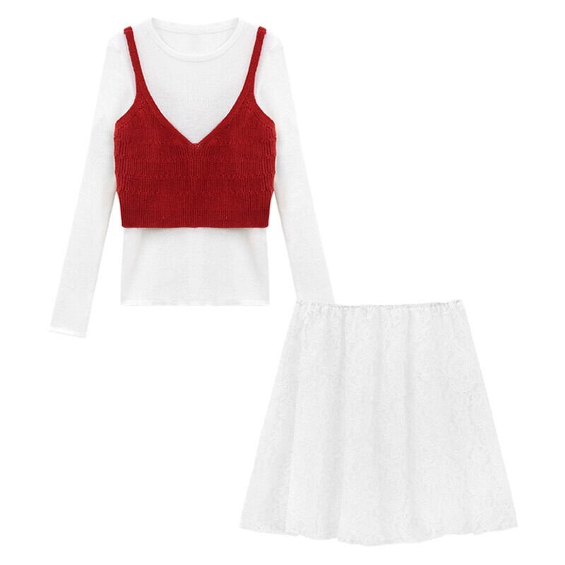 春先の女性向けスーツ、ショートニットキャミソールとボトリングシャツとレーススカートの3点セット レッド スプリング 春物 missk62584803428