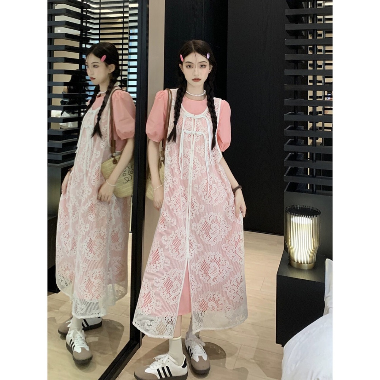 色:レースベスト,ピンクのシャツスカート