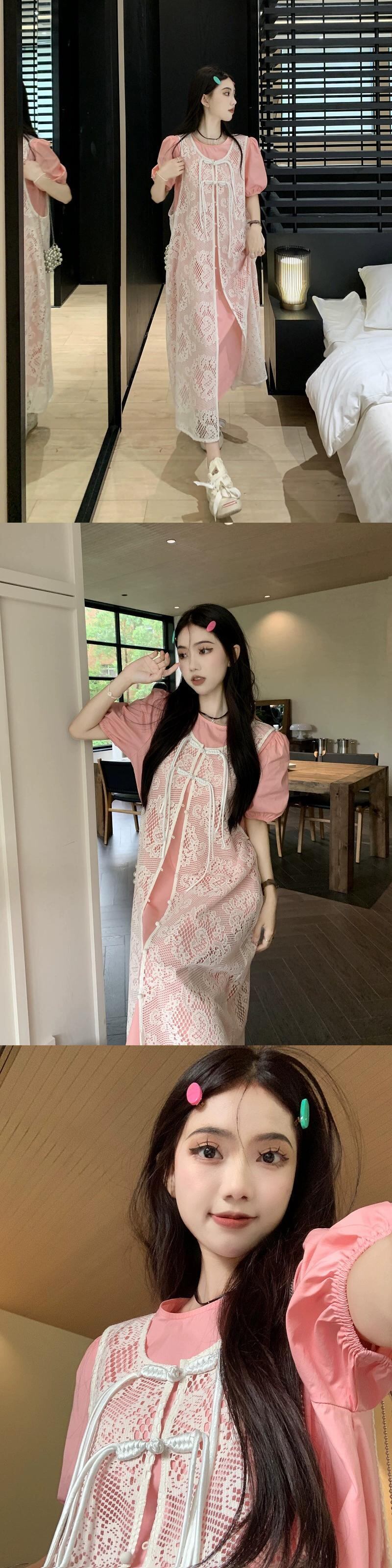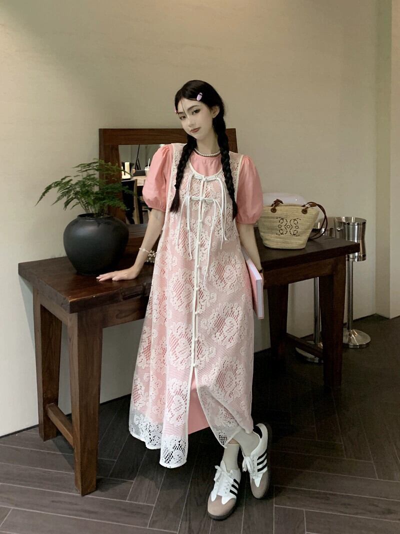 優しい風スーツの女性、夏の甘いピンクのパフスリーブドレス、レイヤードレースベストドレス、ファッショナブルな2点セット レッド 大人ガーリー スウィート キュート カジュアル サマー 夏物 missk62772487670
