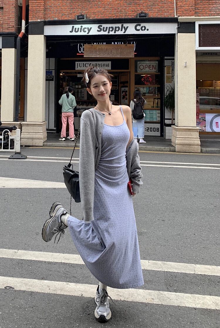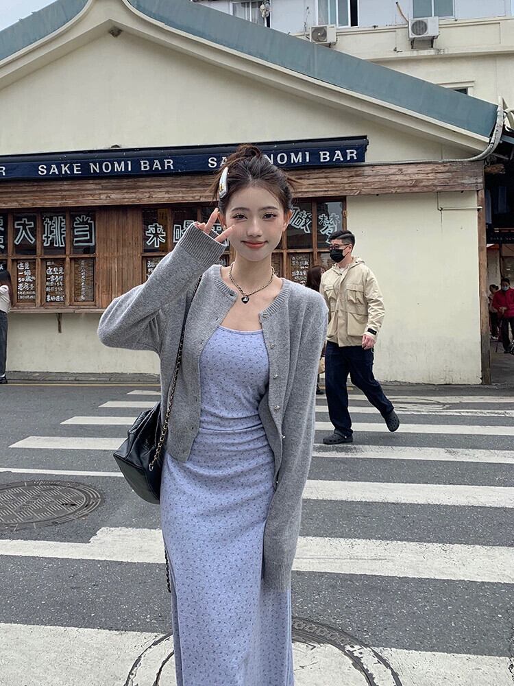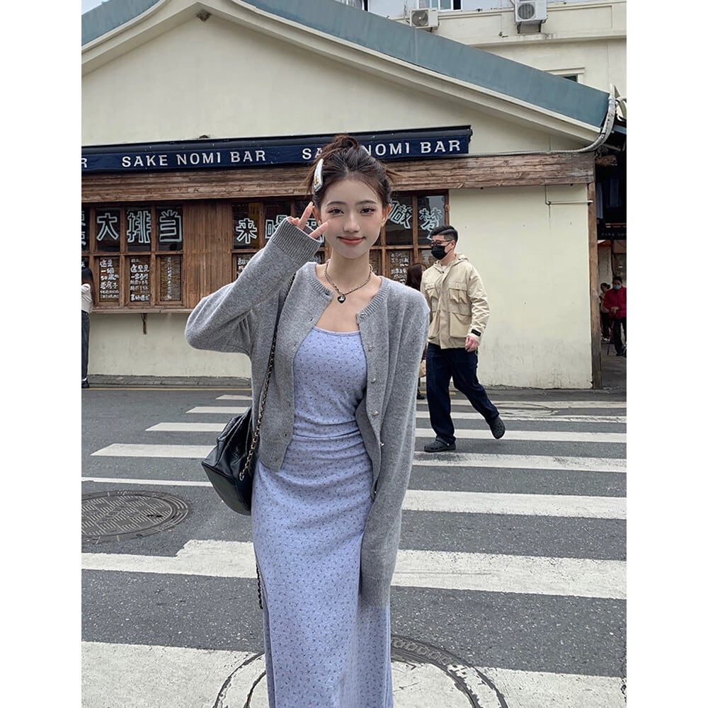 色:グレーのカーディガン,花柄ドレス
