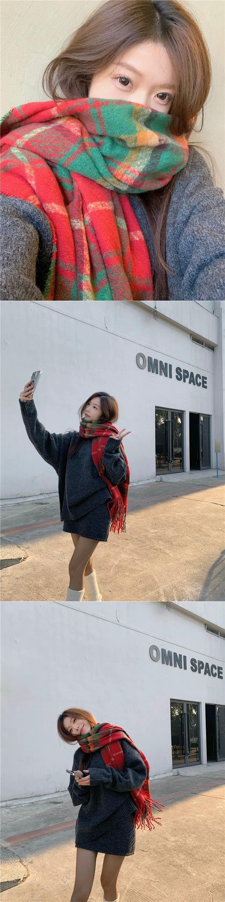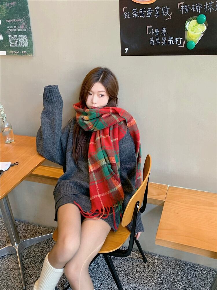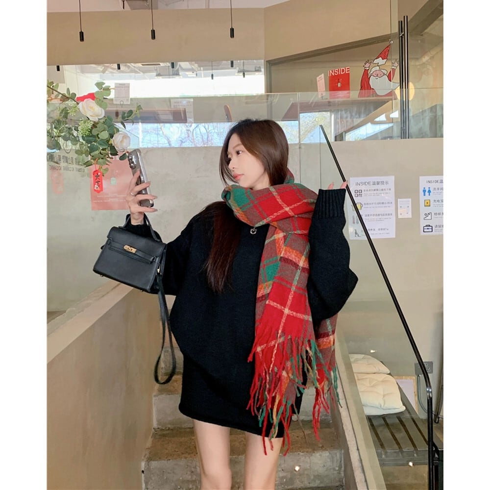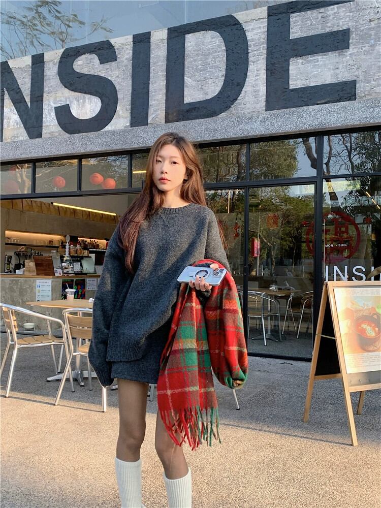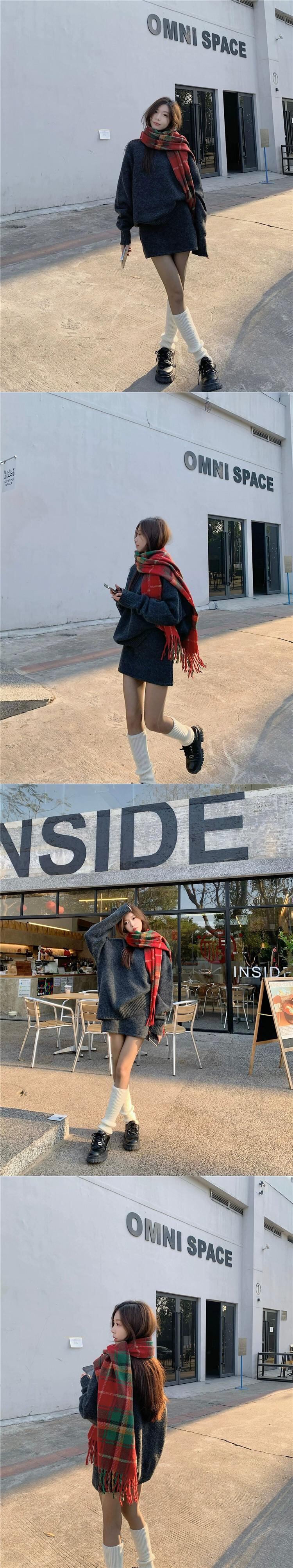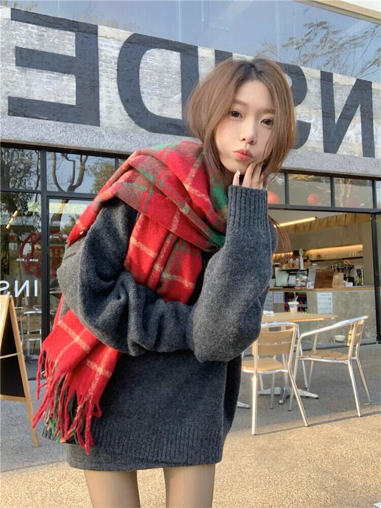 色:ダークグレーのセーター,黒いセーター,ダークグレーのスカート(裏地付き),黒スカート(裏地付き),赤い格子縞のスカーフ