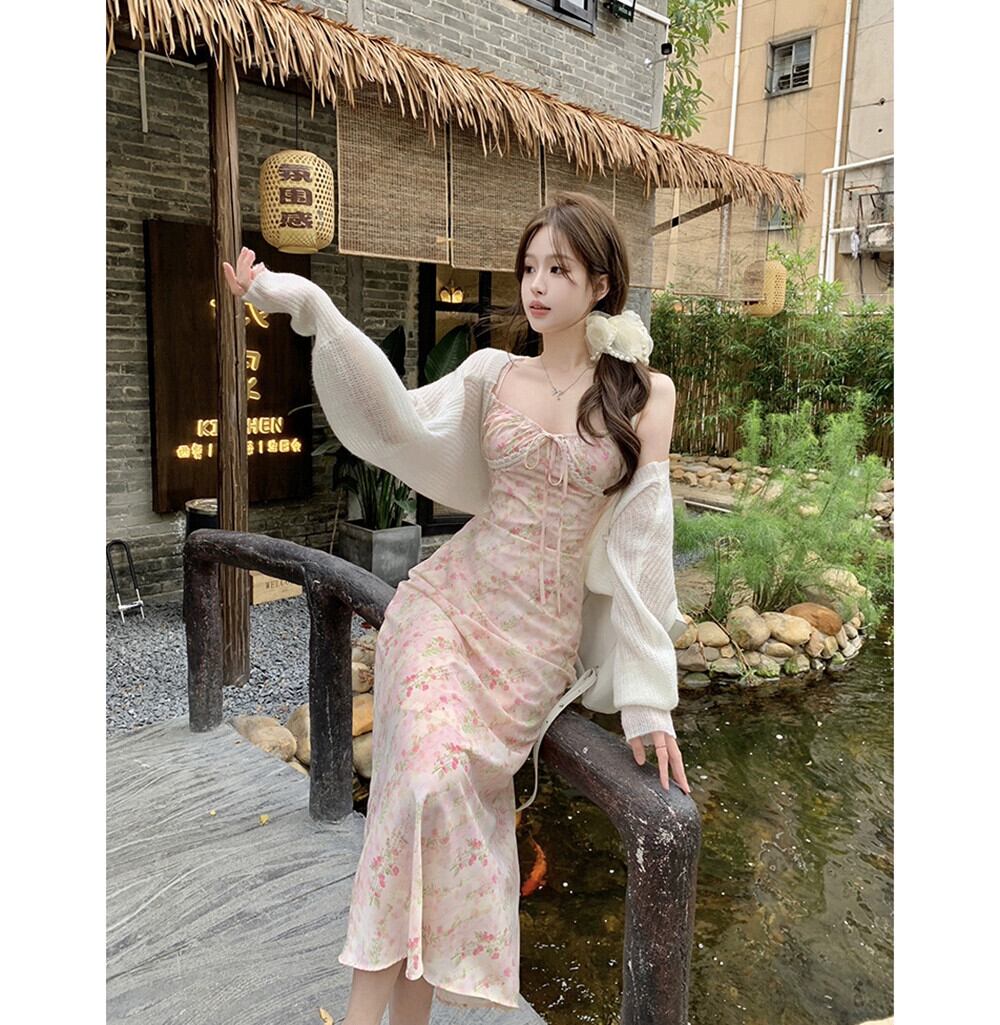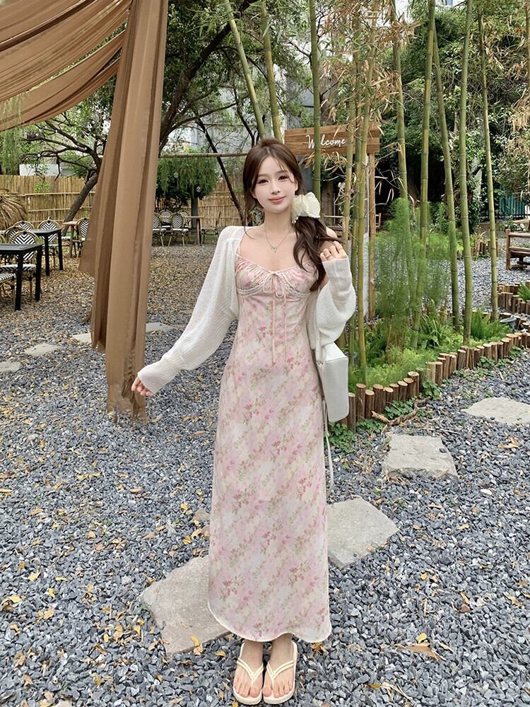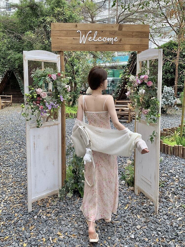 甘いピンクの花サスペンダードレス女性の夏の優しいスタイルハイエンドウエスト痩身 A ラインロングスカート 大人ガーリー スウィート キュート カジュアル サマー 夏物 花柄 Aライン missk89169937104
