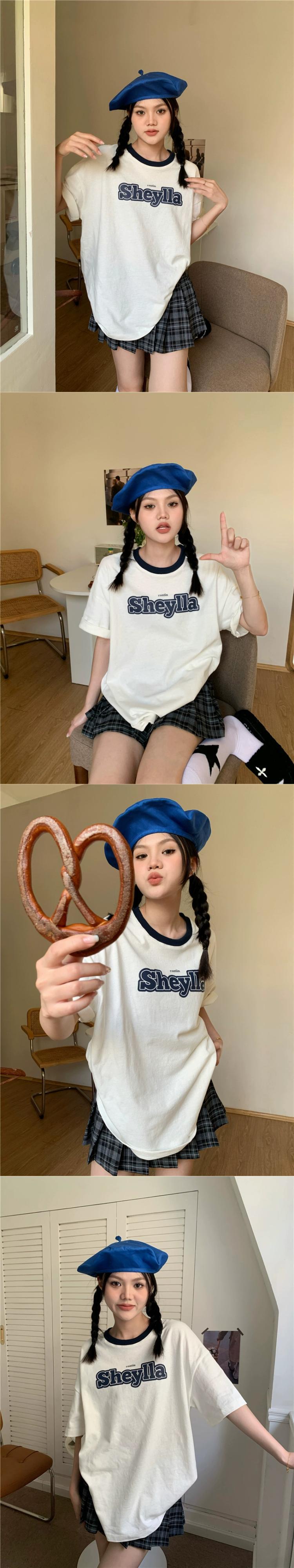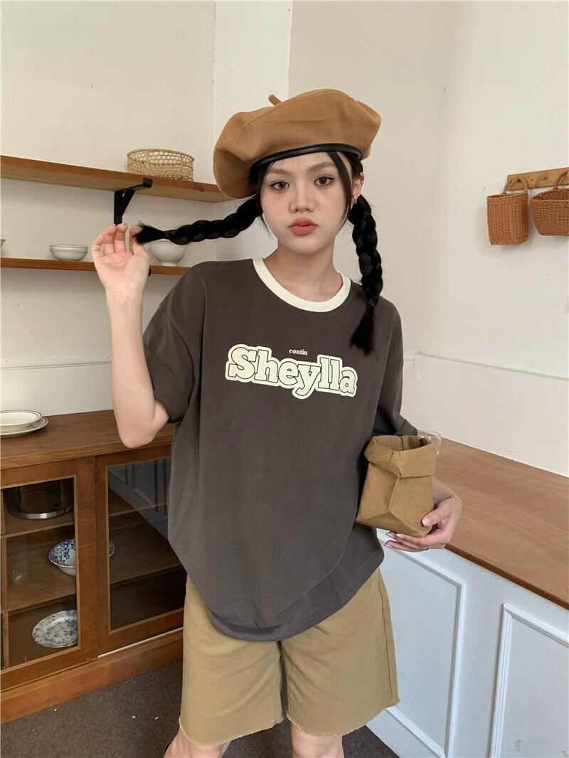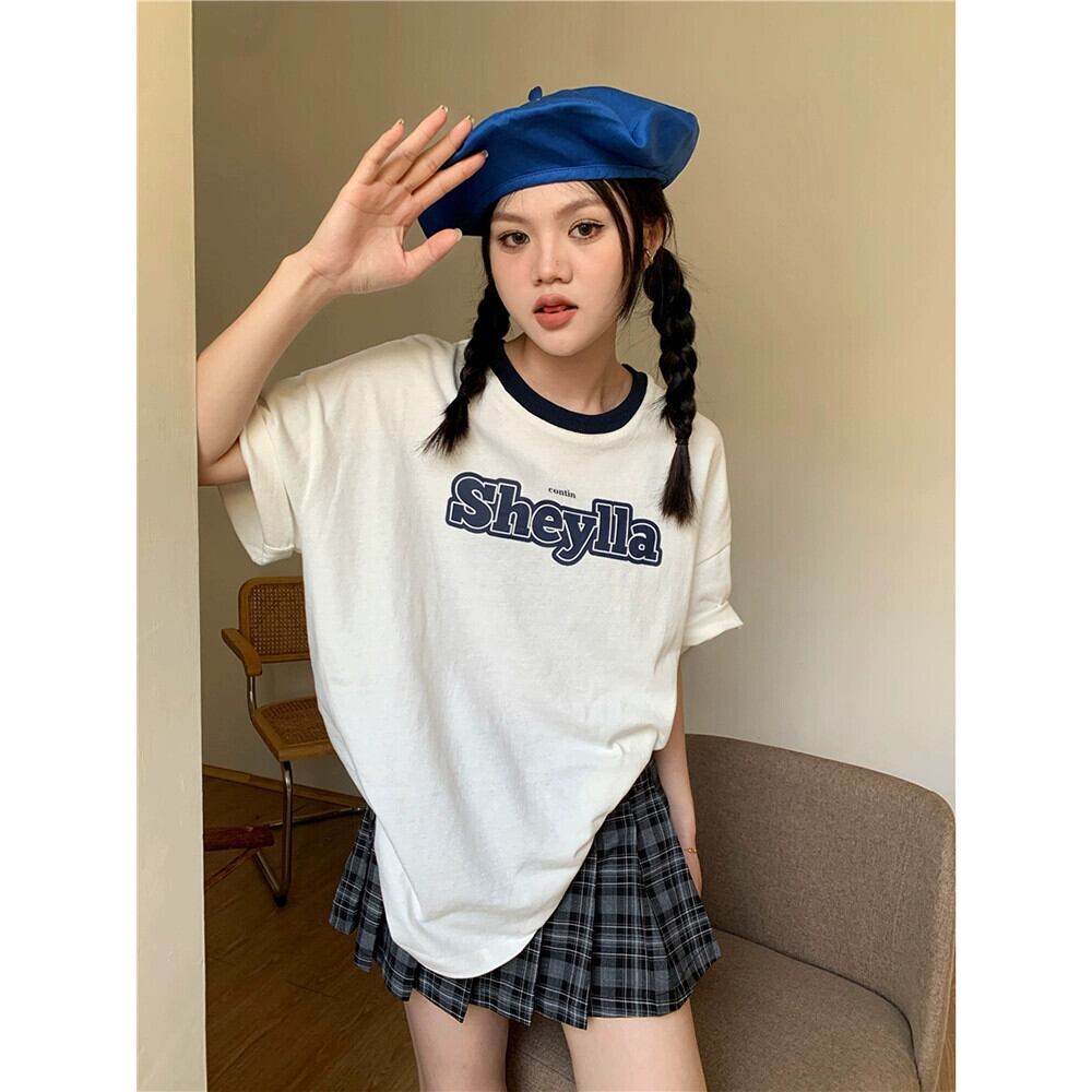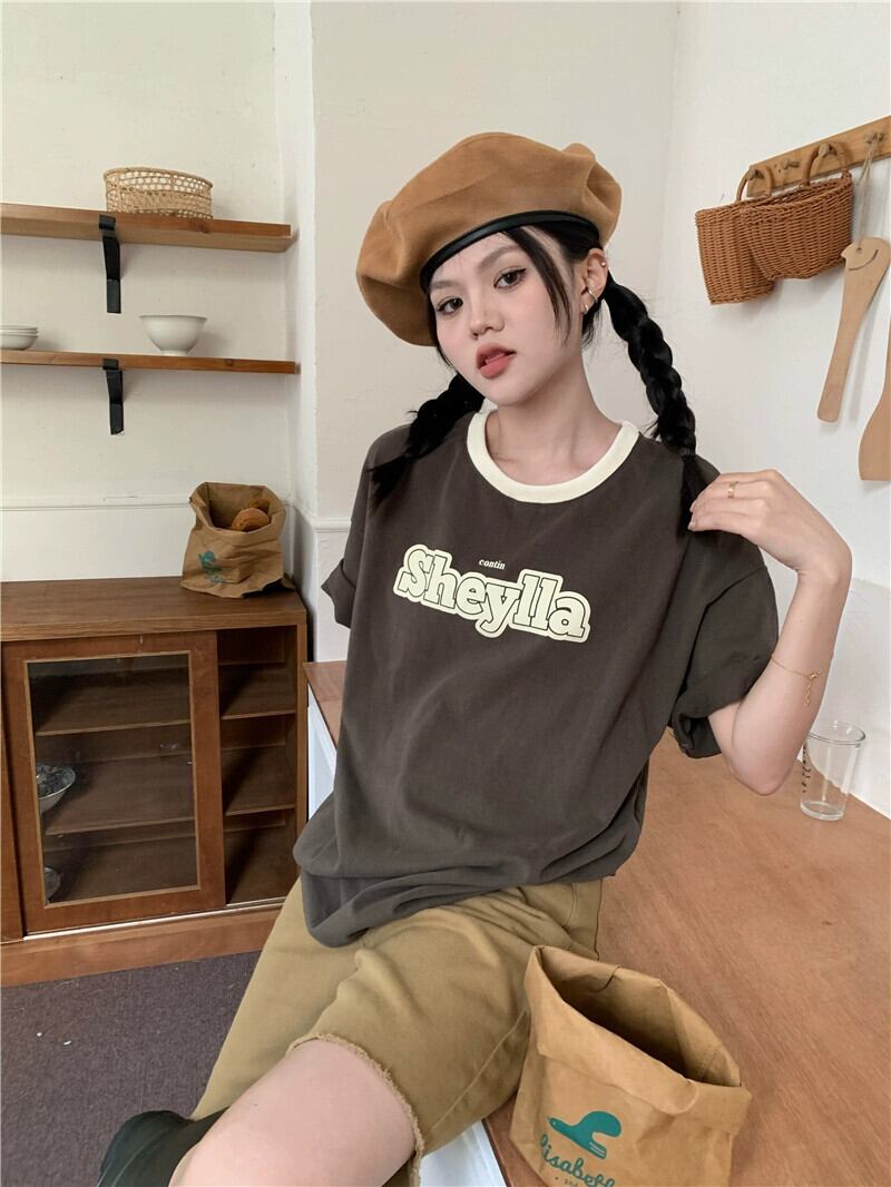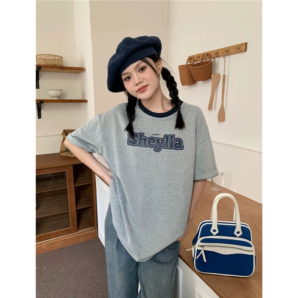 シックなコントラストカラー起毛半袖 Tシャツ女性 2024 年春の新デザインプリントルーズラウンドネックトップ スプリング 春物 Oネック missk4061063926