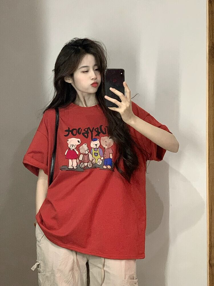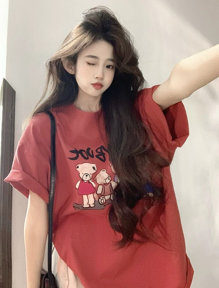 漫画プリントコットン半袖 Tシャツ女性 2024 春の新デザインルーズカジュアルラウンドネック半袖トップ スプリング 春物 Oネック missk11689814574