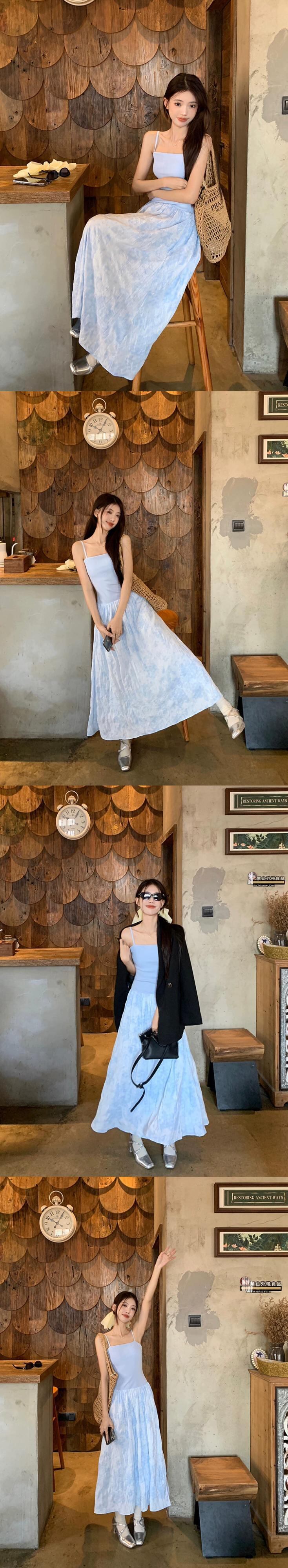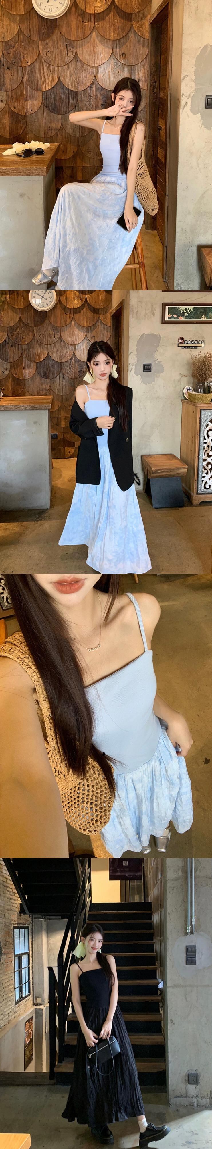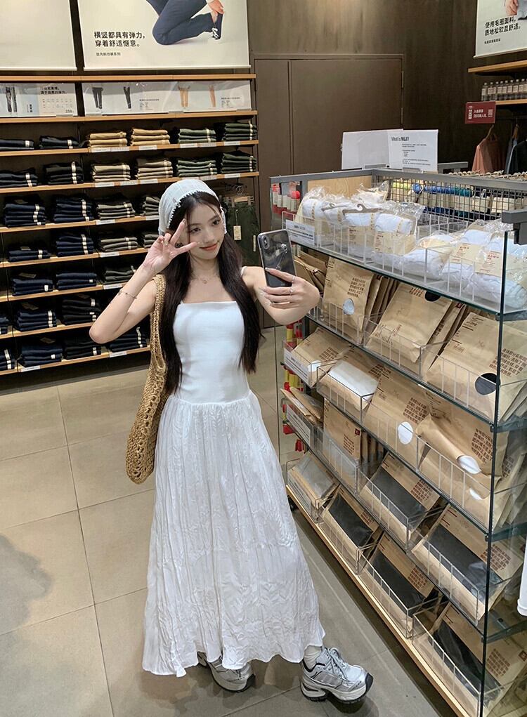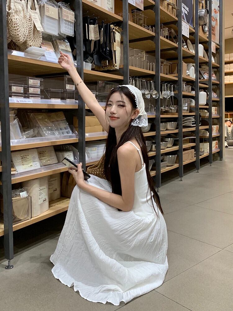 優しいスタイルの白いサスペンダードレスの女性の夏フレンチスタイルウエスト痩身海辺の休暇初恋ロングスカート ホワイト サマー 夏物 missk93189925736