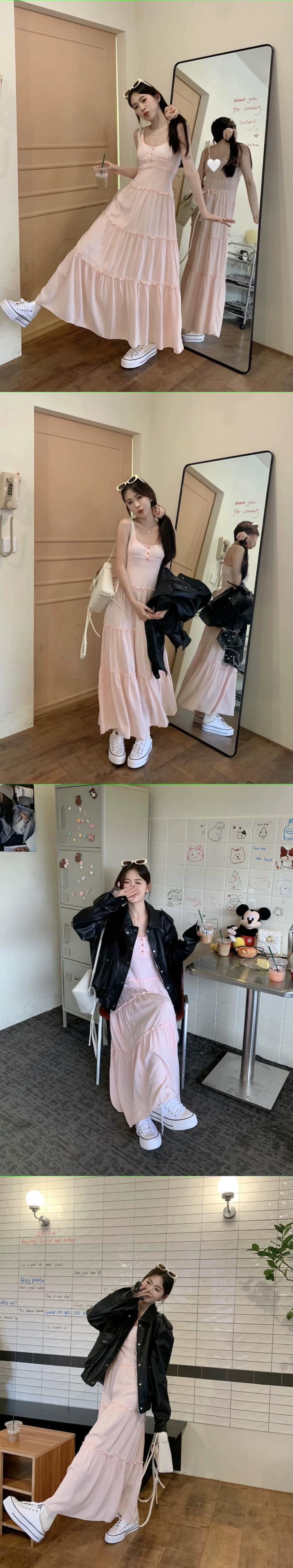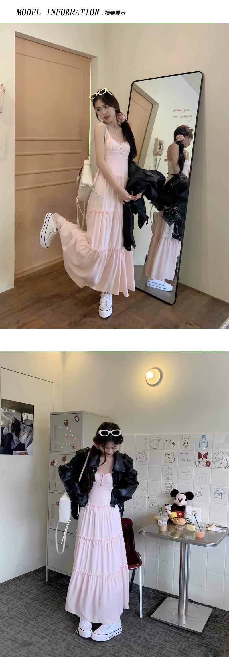 春の優しいピンクのサスペンダードレスの女性、甘い菌類のエッジ、ウエストスリム、Aラインスカート、気質のあるロングスカート 大人ガーリー スウィート キュート カジュアル スプリング 春物 missk51746056834