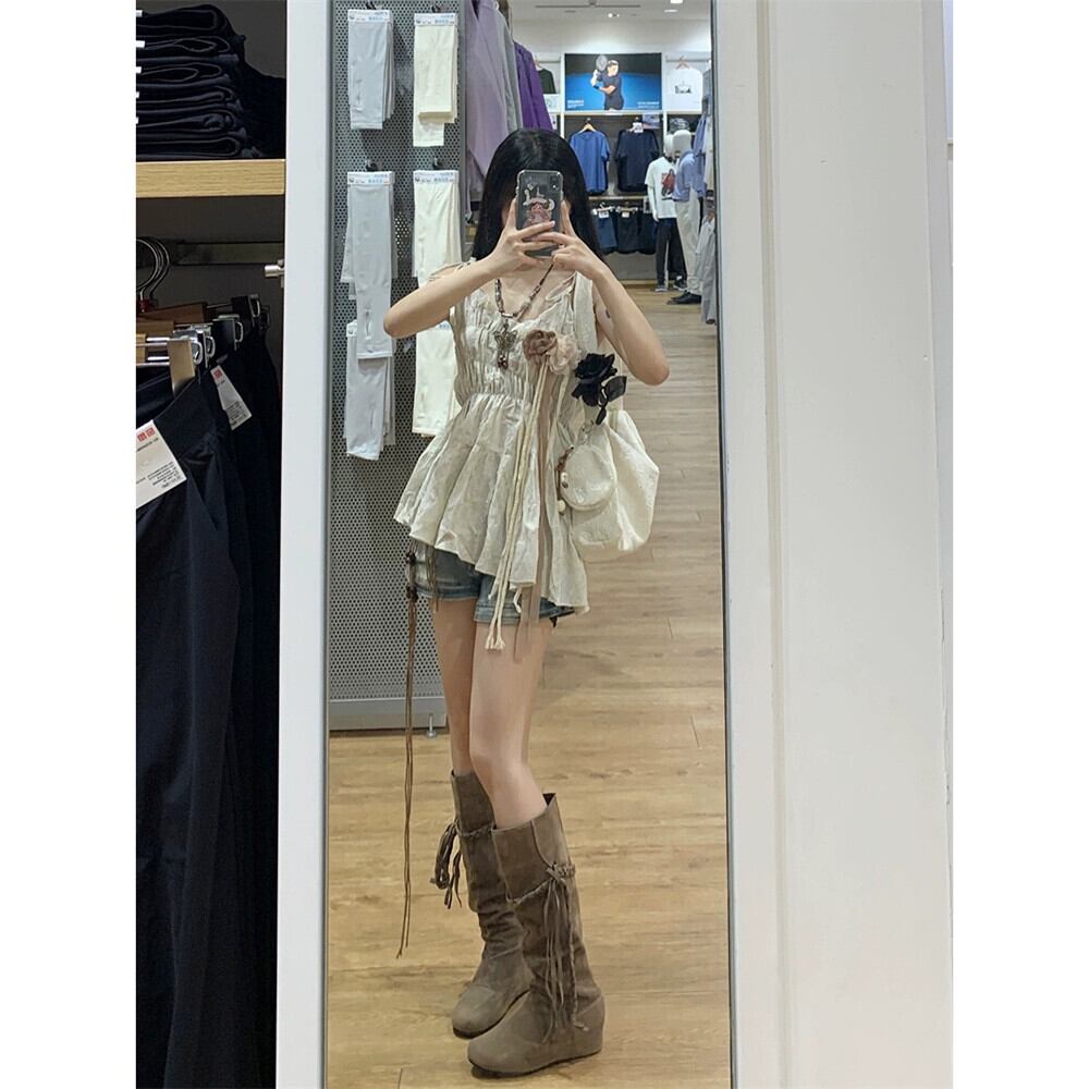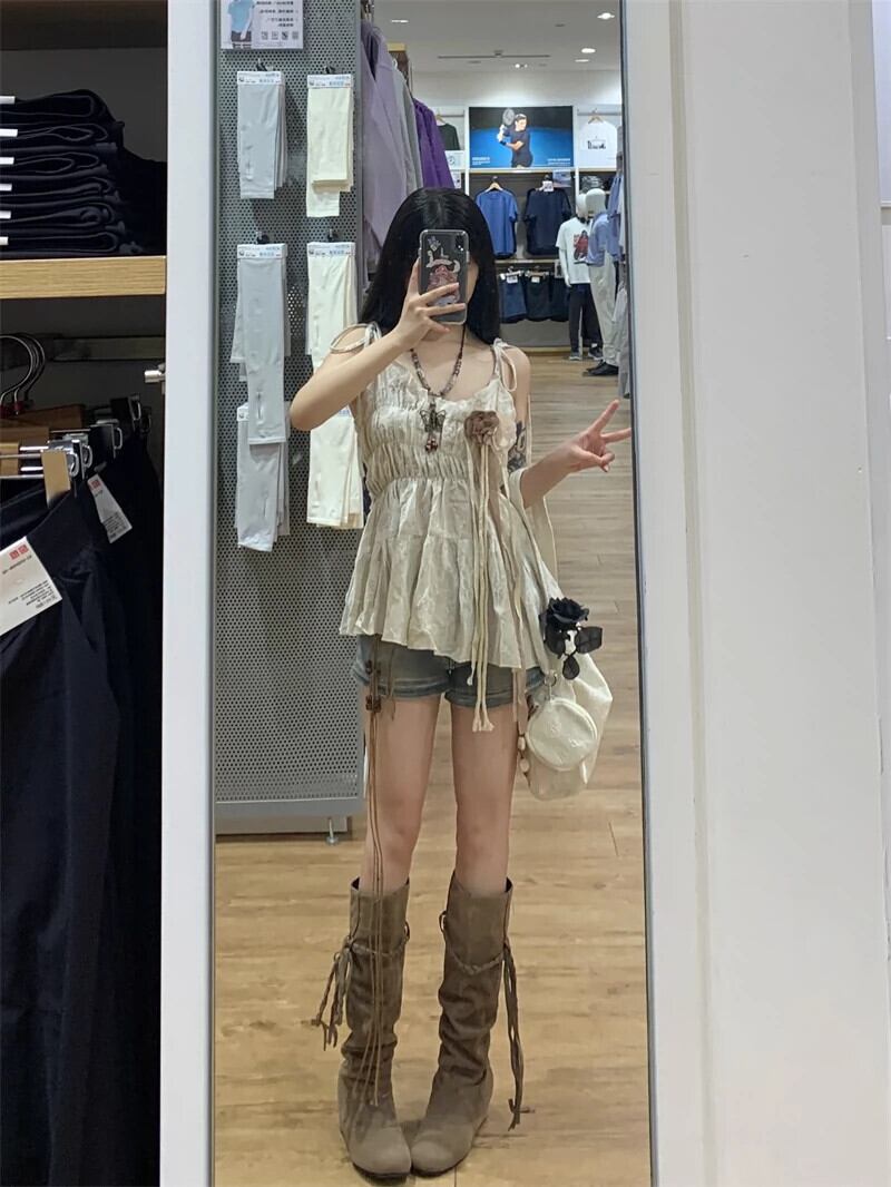甘い小さなキャミソールレディースアウターウェア 2024 春の新しいスタイルのフレンチデザインプリーツインナーノースリーブトップ 大人ガーリー スウィート キュート カジュアル スプリング 春物 missk73409276564