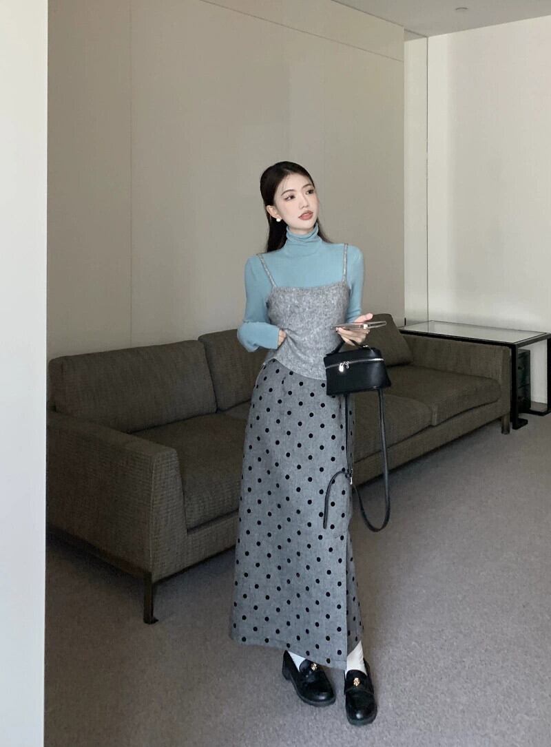 スーツレディース、春スタイル、ニットベスト、重ねタートルネック、ボトムシャツ、Tシャツ、水玉スカート、3点セット スプリング 春物 missk51726719167