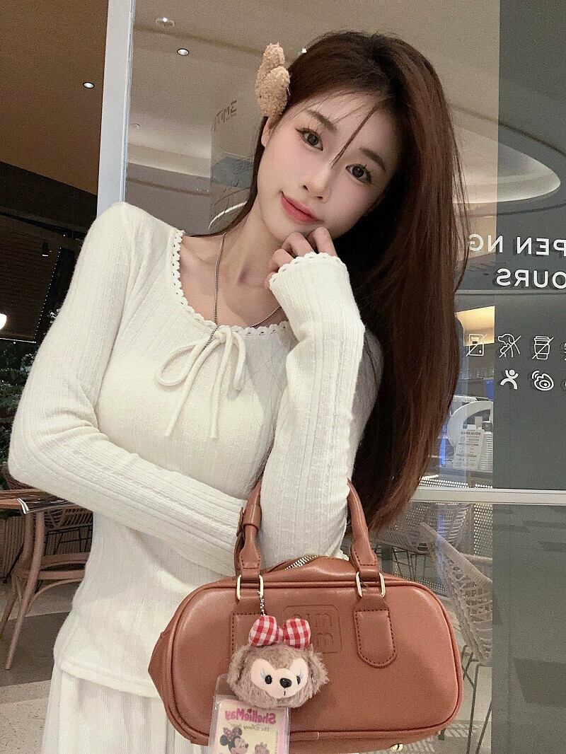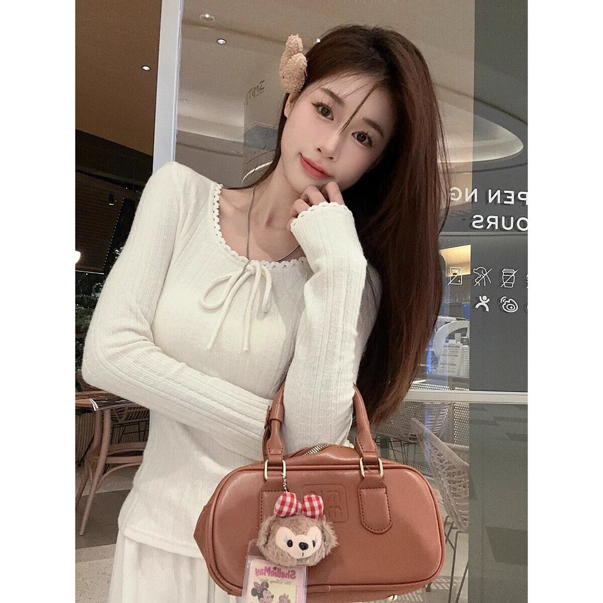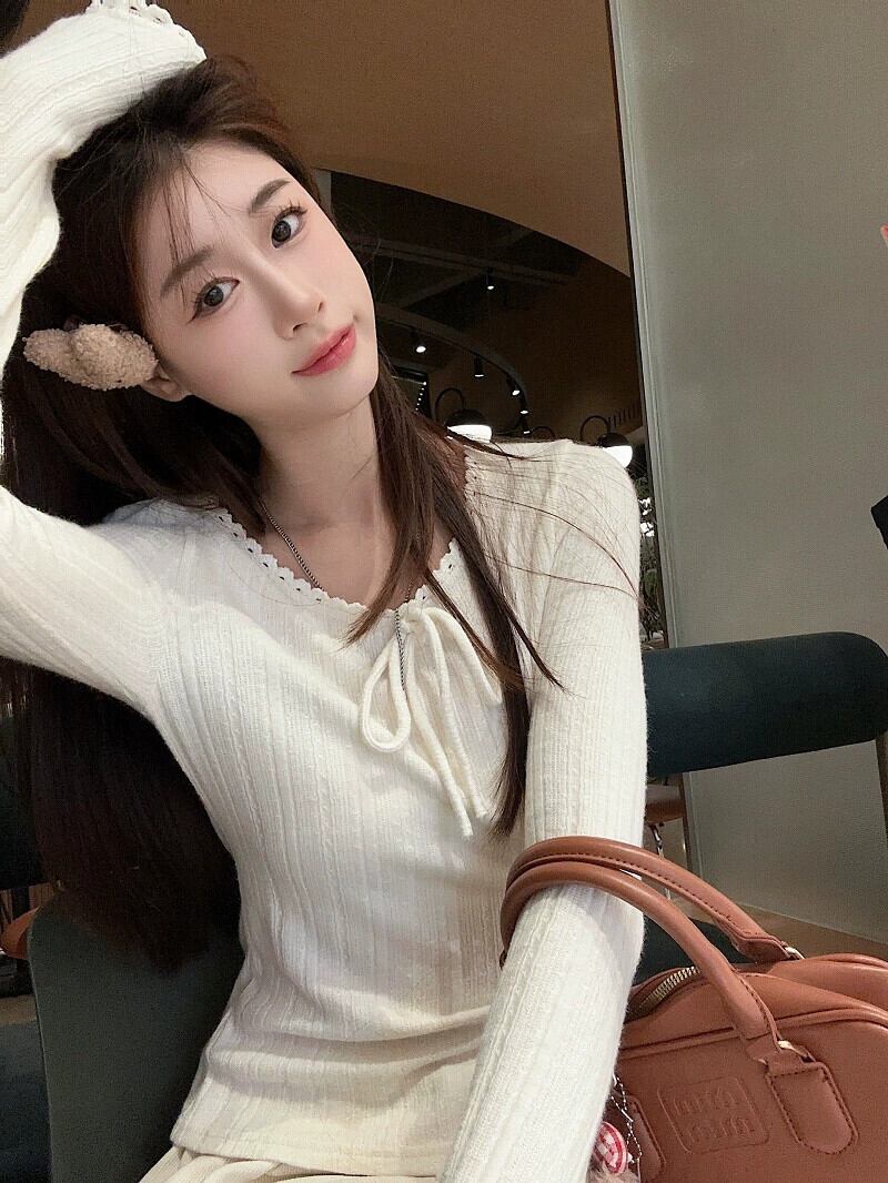 弓ジャカード長袖セーター春と秋 2024 新しいフレンチアプリコットラウンドネックインナー多用途トップス女性 ロング スプリング 春物 オータム 秋物 Oネック missk54017679312