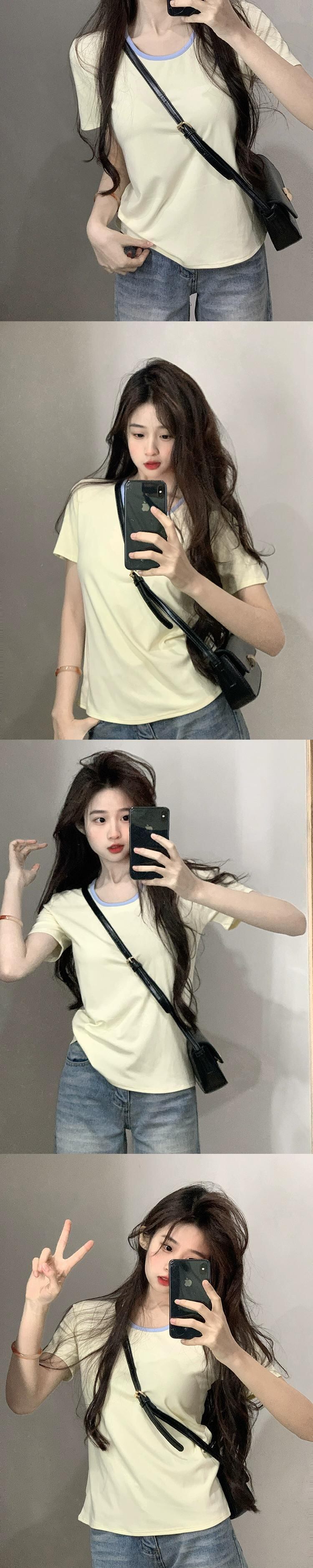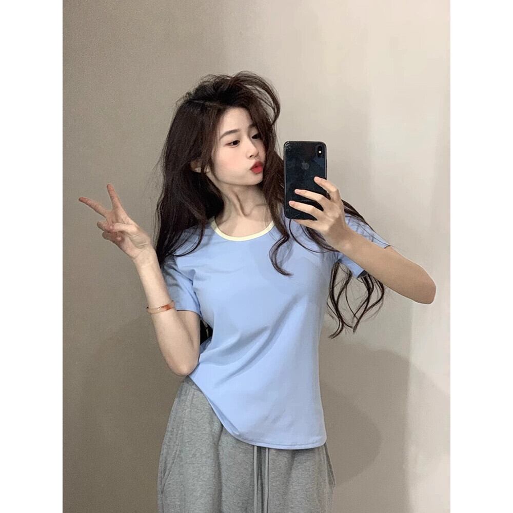 右肩スリム半袖 T シャツの女性の 2024 年春の新デザインの対照的なラウンドネックとシックなトップス スプリング 春物 Oネック Tシャツ missk71156391332