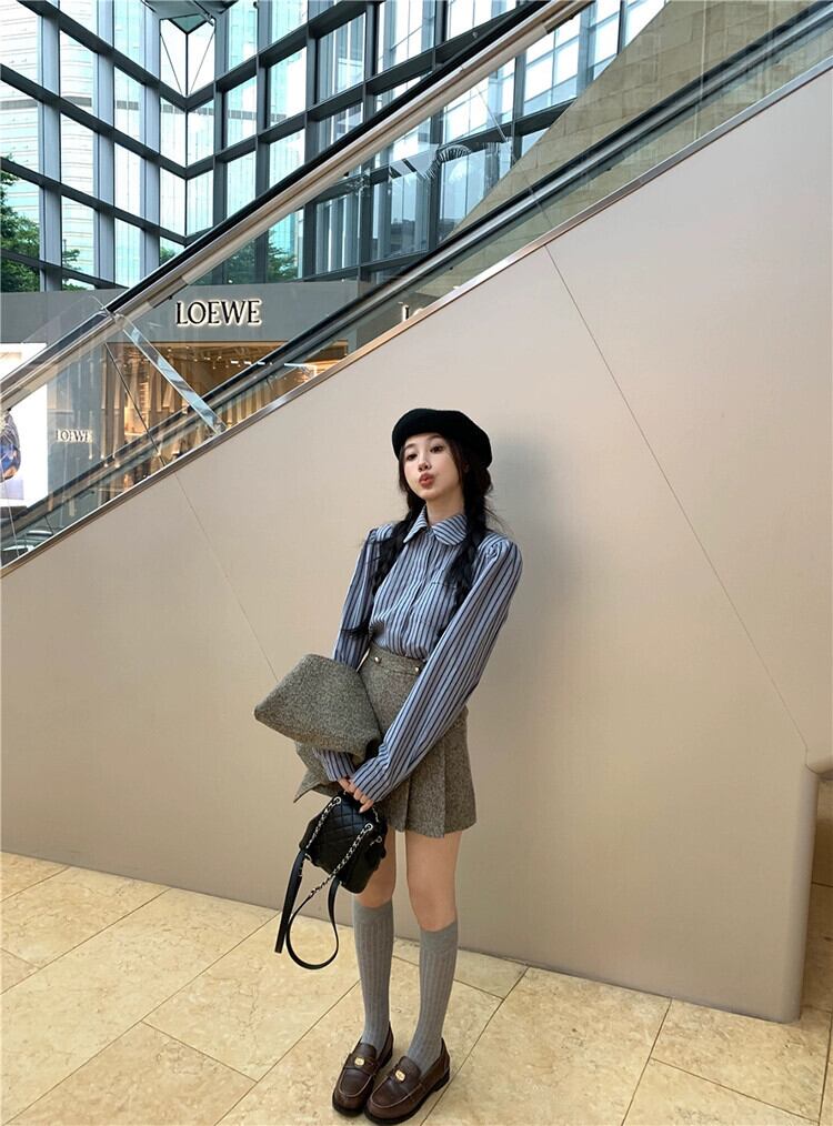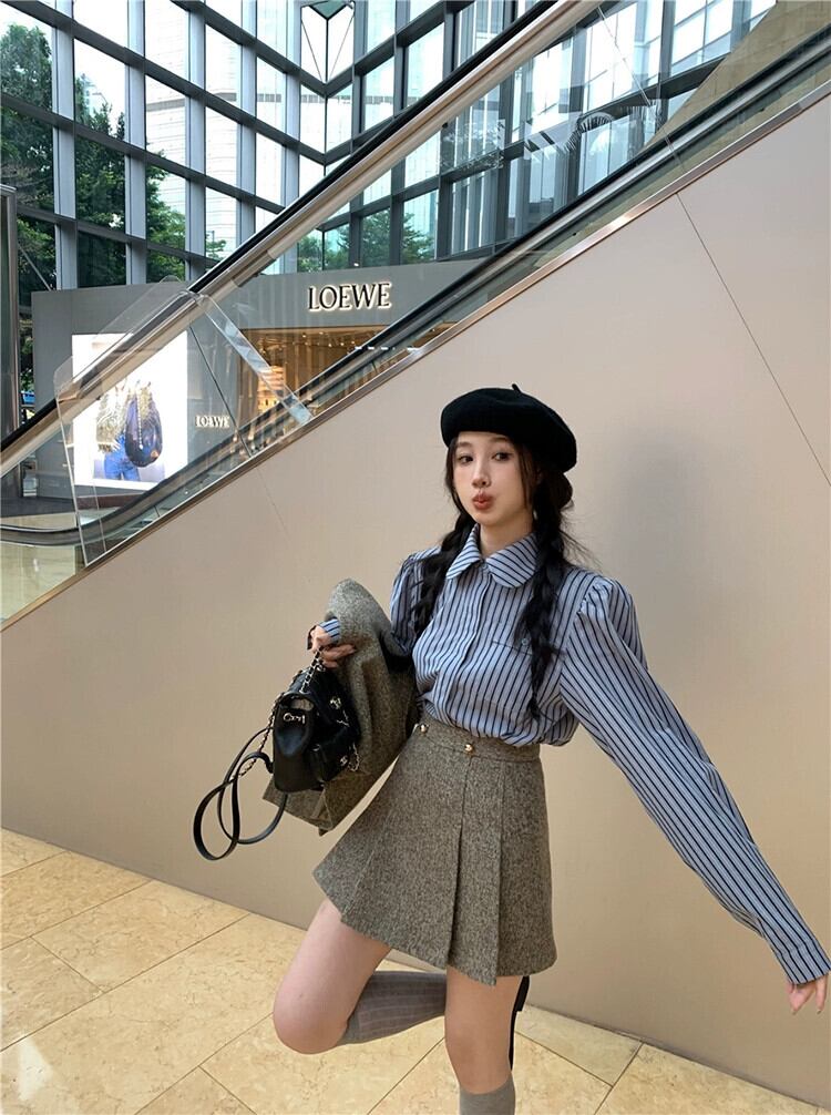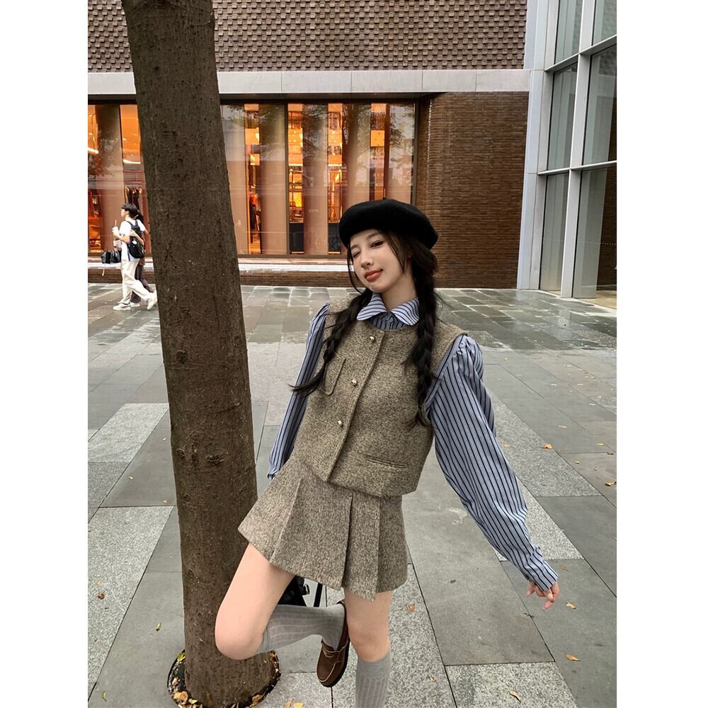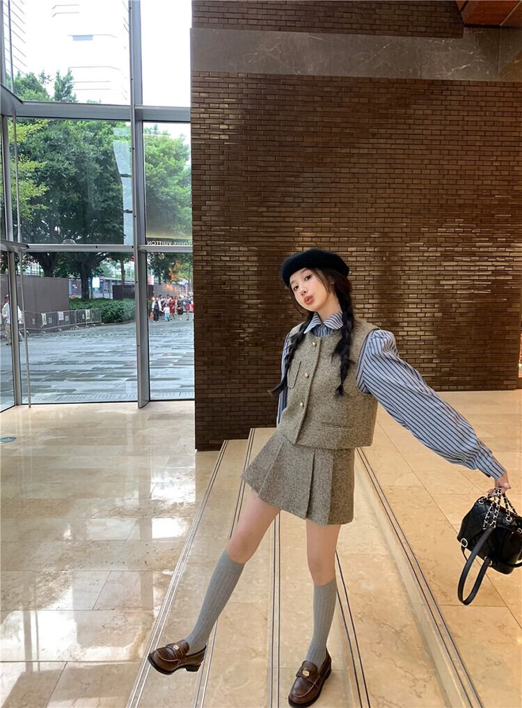 スタイルスーツレディース、春レトロベスト、レイヤードストライプシャツ、プリーツスカート、ドラマ3点セット レッド スプリング 春物 missk52172545593