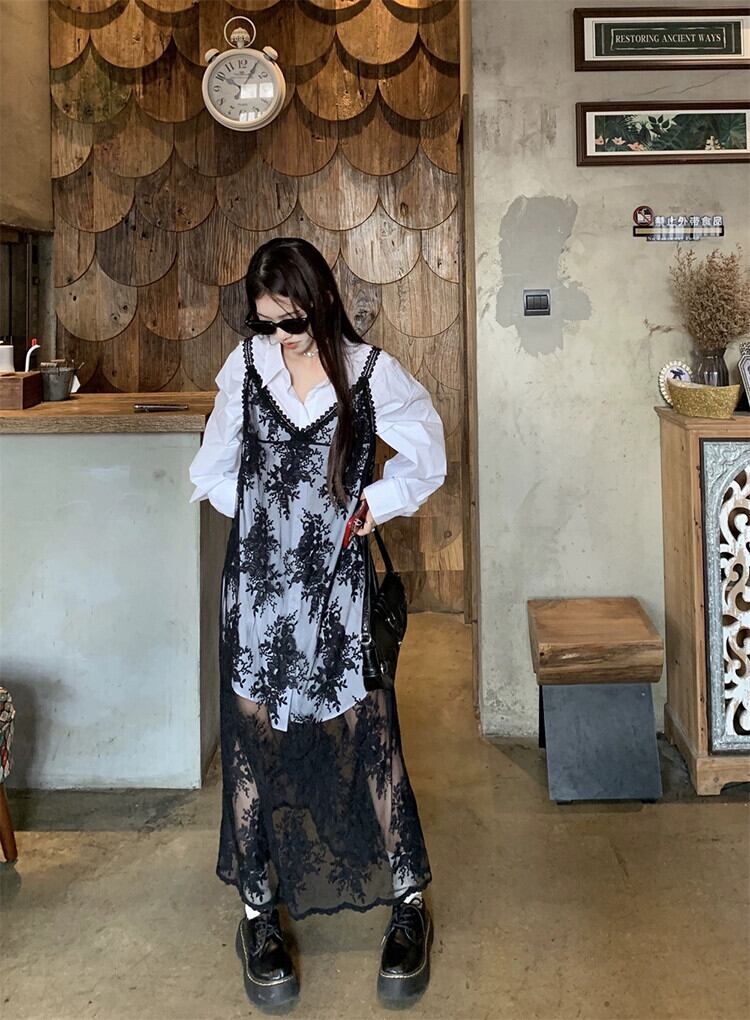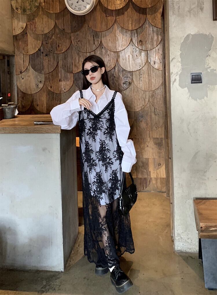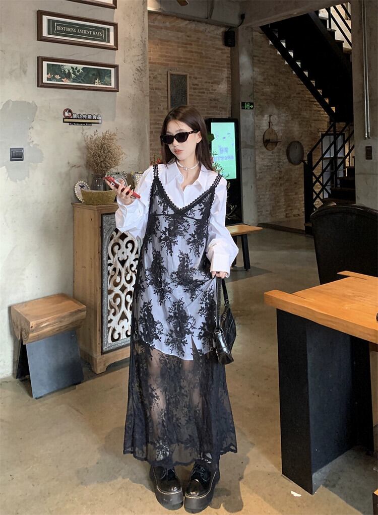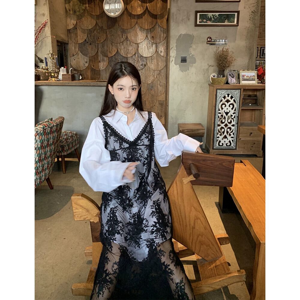優しい風スーツ レディース 春のフレンチ刺繍レースサスペンダードレスと白シャツの重ね着2点セット ホワイト レッド スプリング 春物 missk3897833378