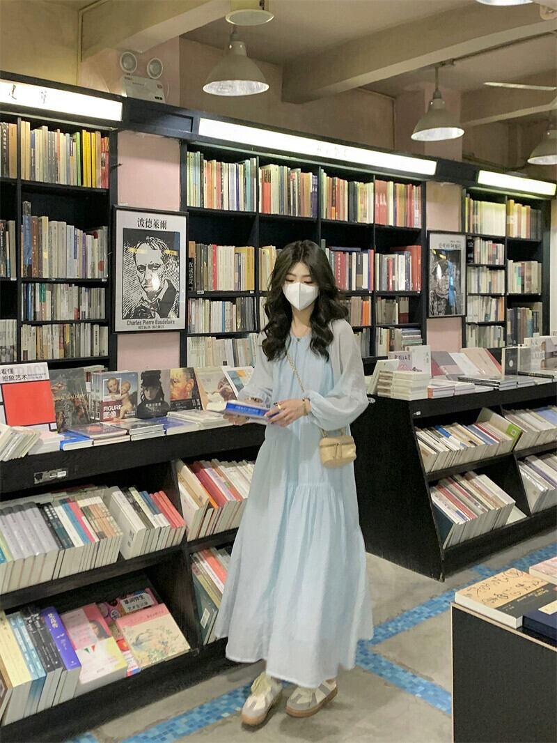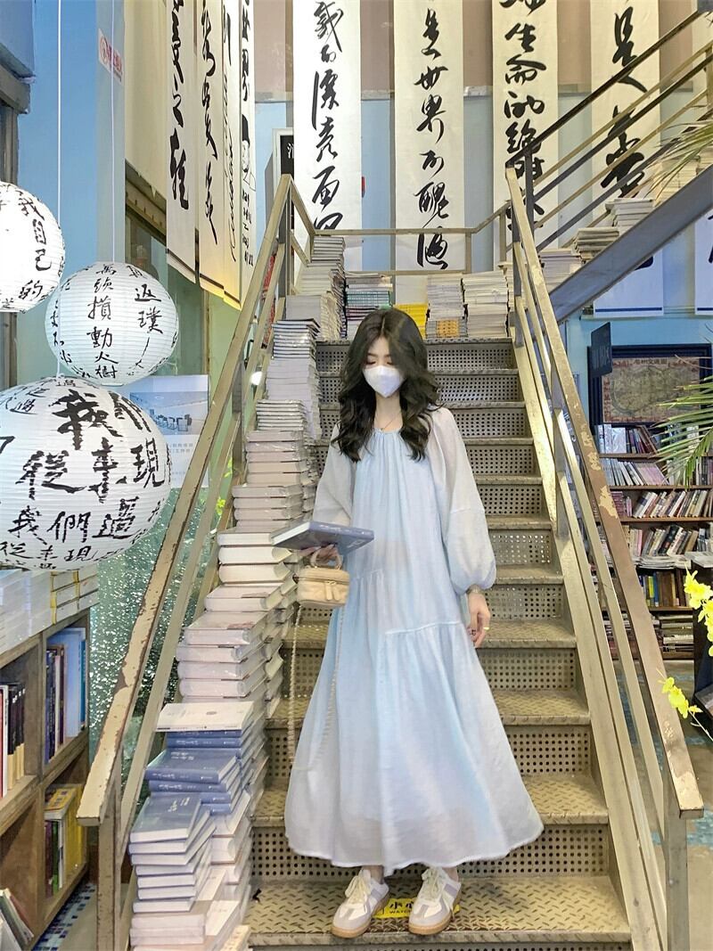 優しいスタイルのブルー長袖ドレス女性春フレンチスタイル不規則なスプライシング緩い痩身Aラインロングスカート スプリング 春物 missk49115415540