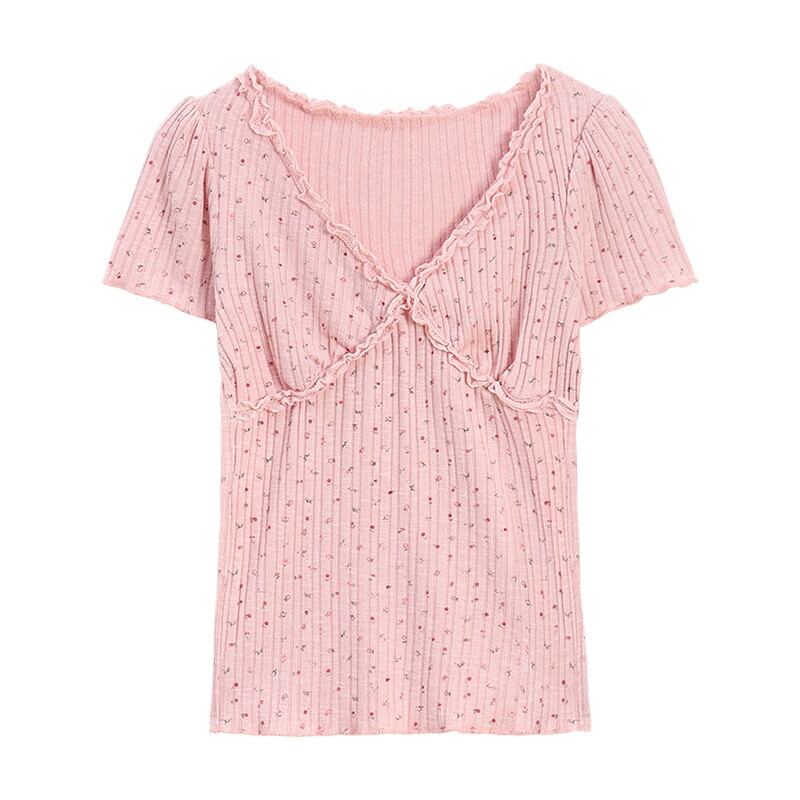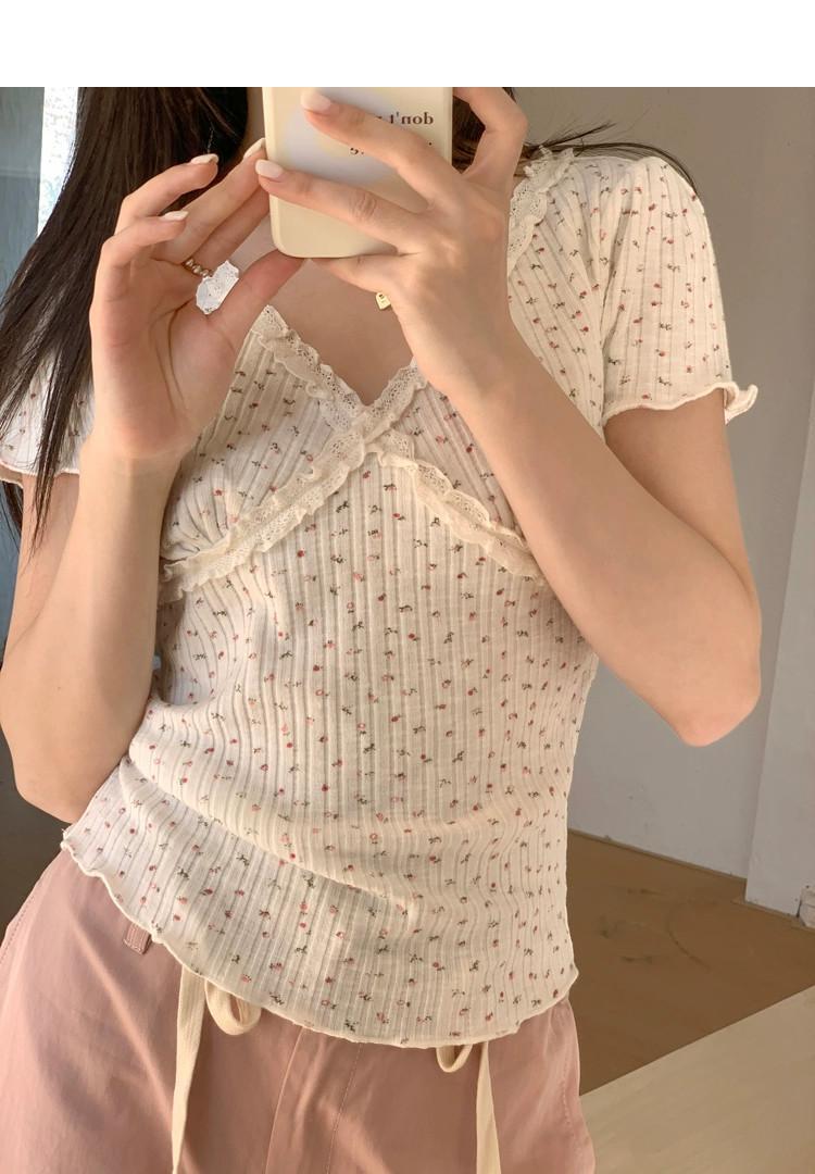 甘い菌半袖 Tシャツ女性の夏の 2024 新デザイン花柄 V ネックシックなスリムショートトップ 大人ガーリー スウィート キュート カジュアル サマー 夏物 Vネック missk67160978180