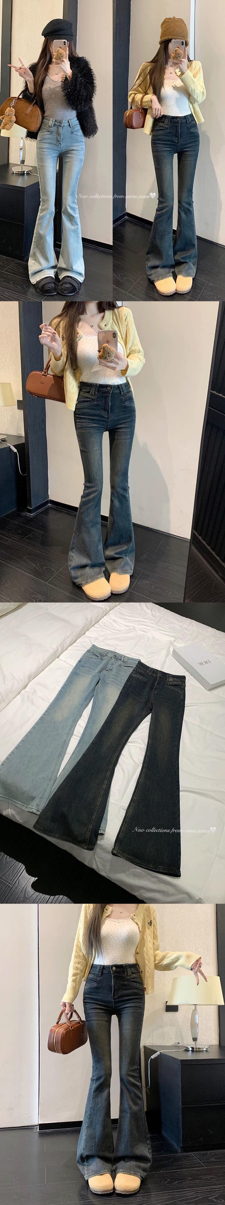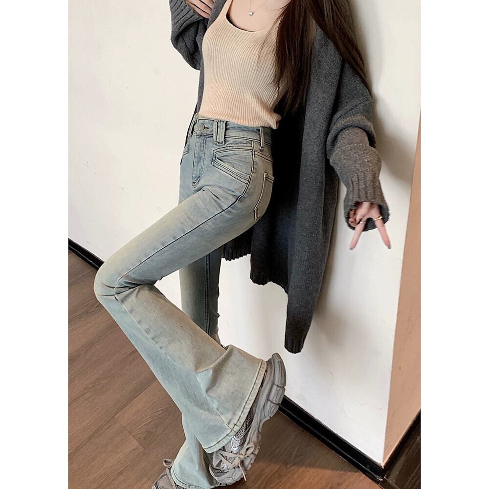 レトロブルーブーツカットジーンズレディース、スプリングアメリカンタイハイウエストストレートパンツ、スリムホースフーフパンツ、フロアレングスパンツ 春物 missk45882456448