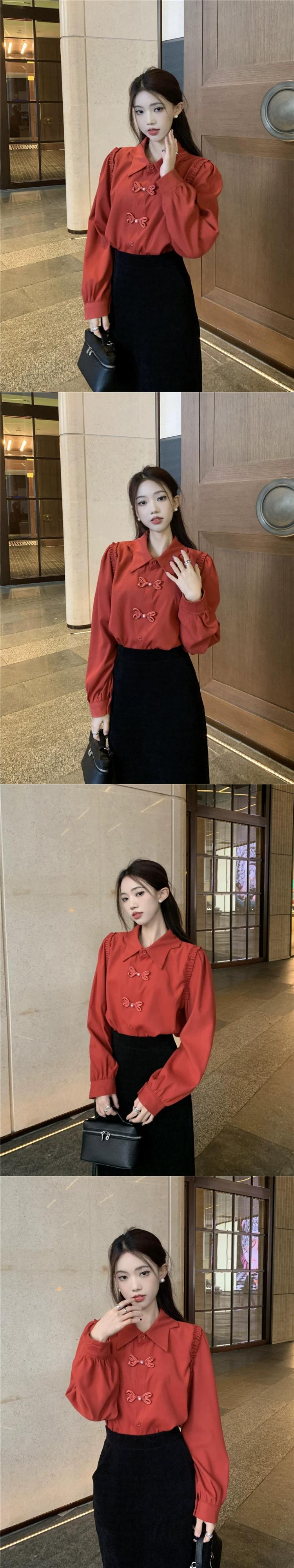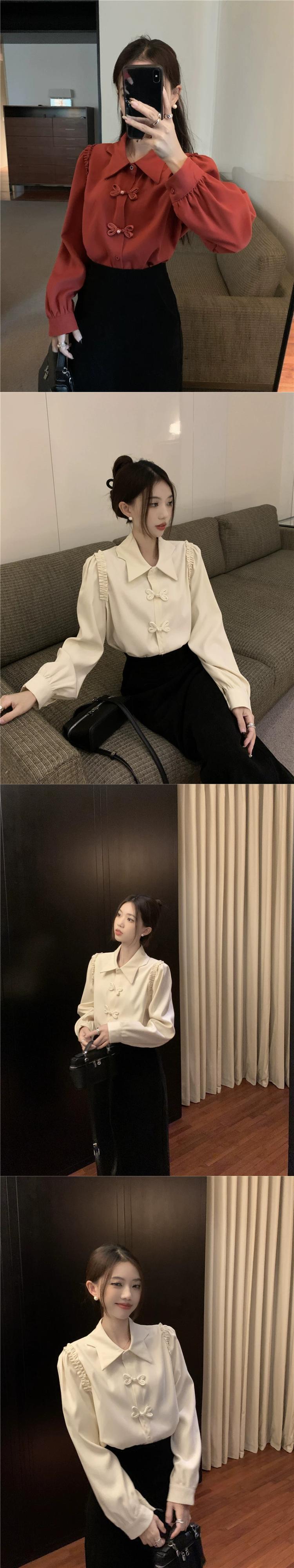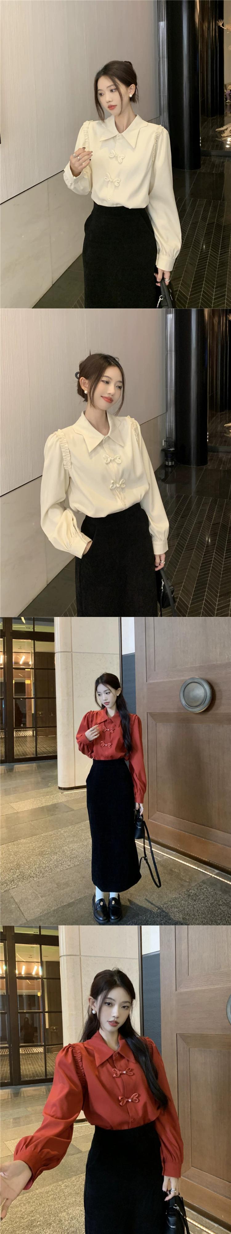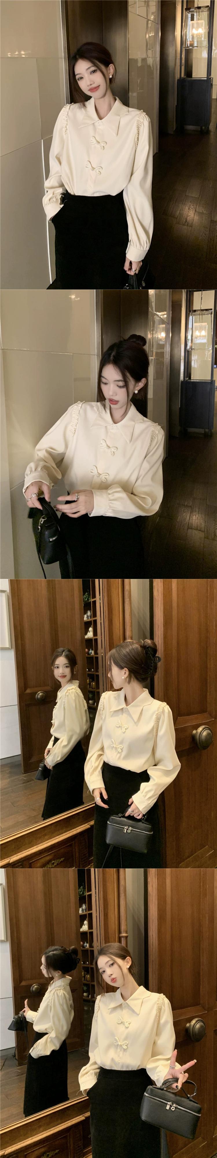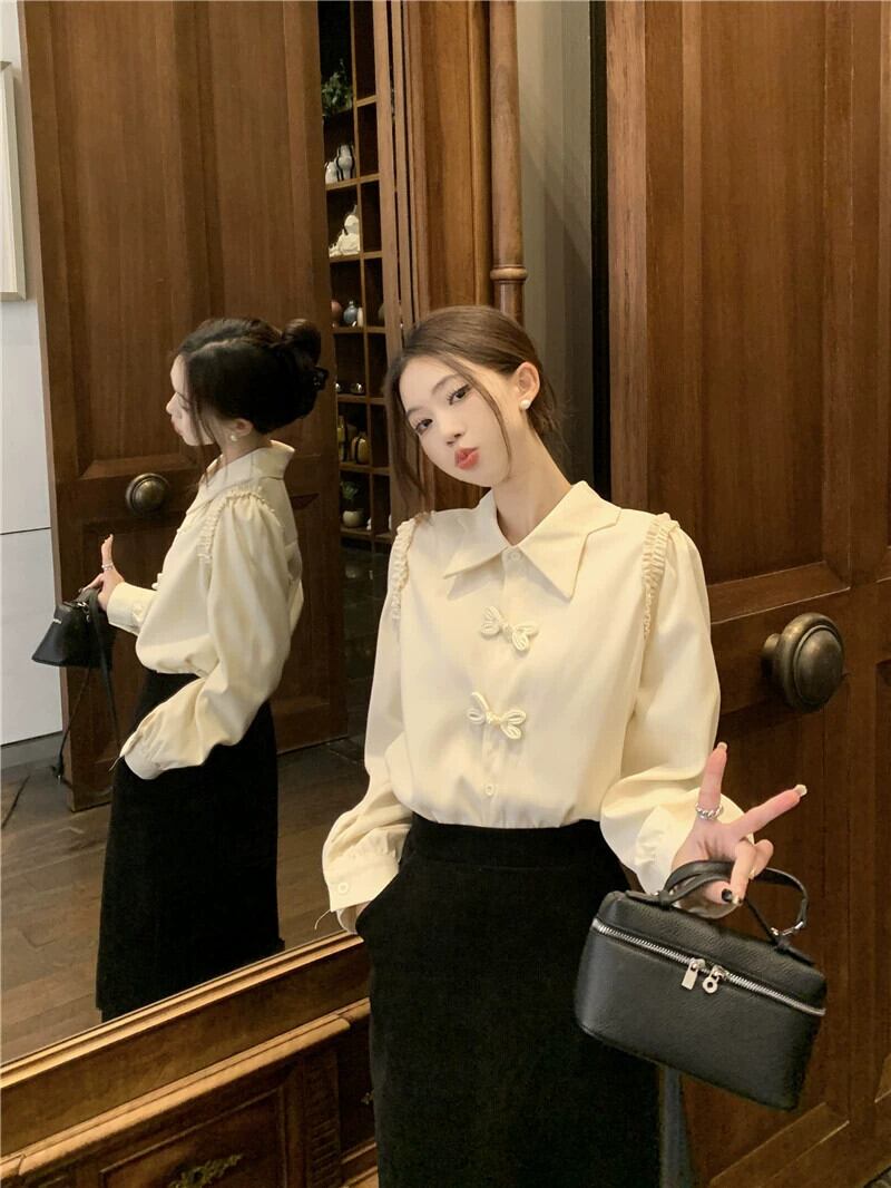 新しい中国風シャツ女性春 2024 新しいレトロパールボタン長袖シャツルーズシックなトップ ロング スプリング 春物 真珠 missk94683947278