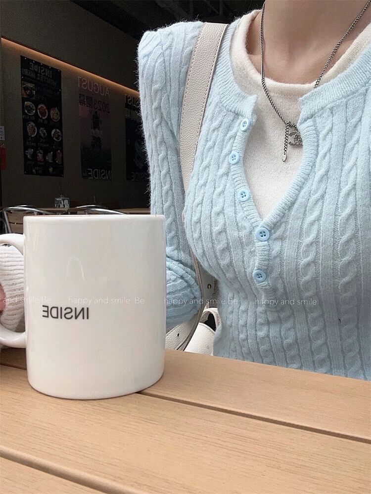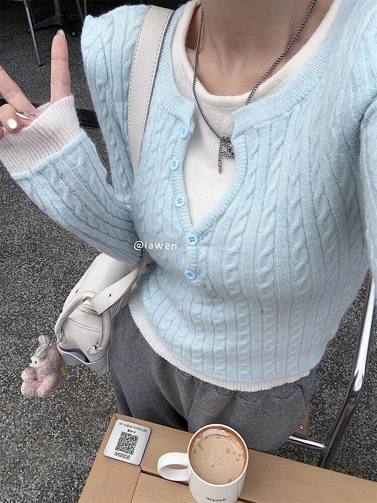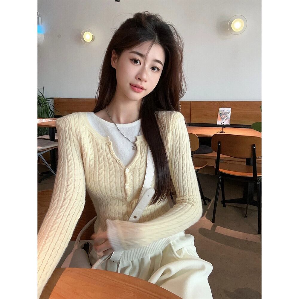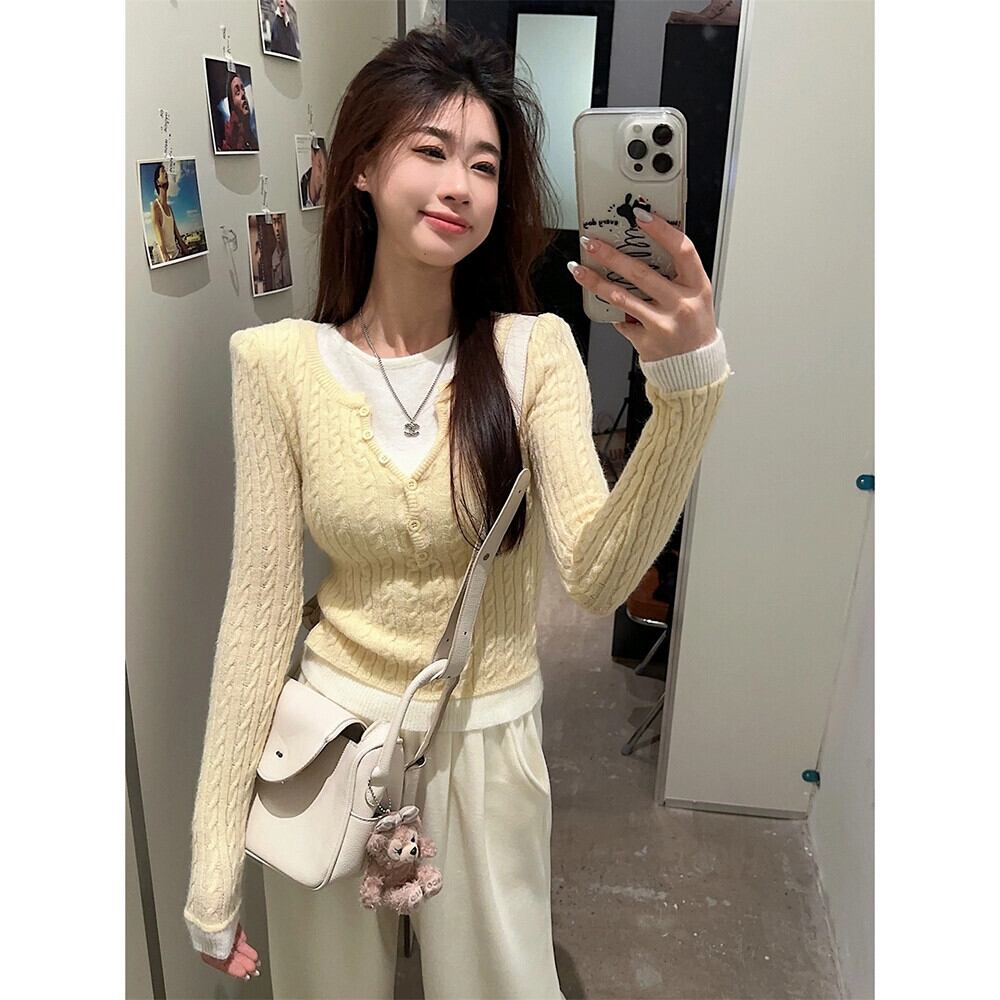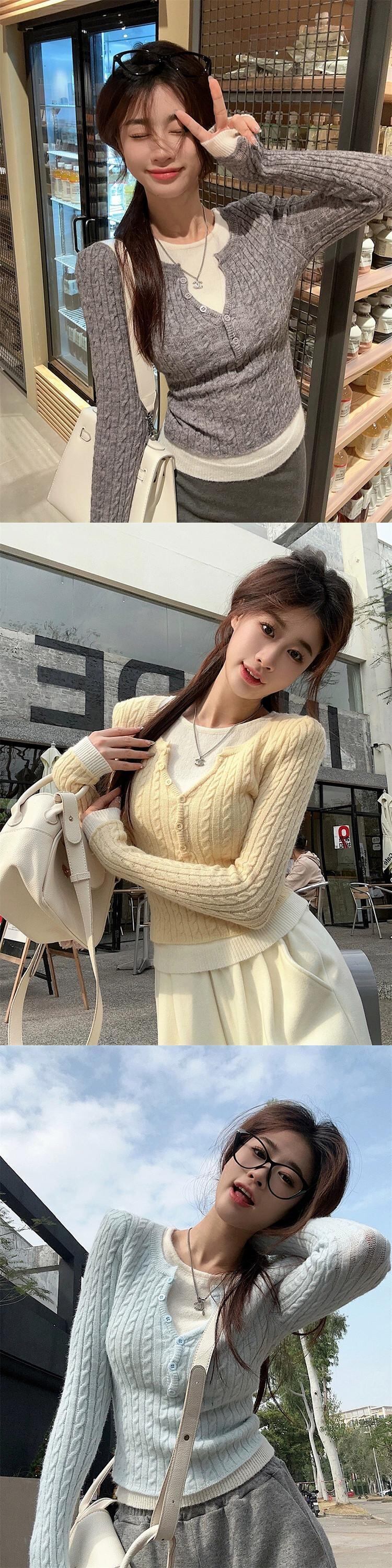 フェイクツーピースVネックツイストニットウェアレディース春デザインコントラストカラー痩身ボトムシャツショートトップ スプリング 春物 missk13353195101