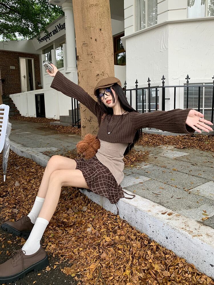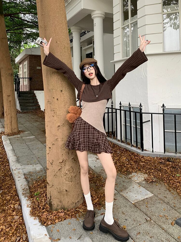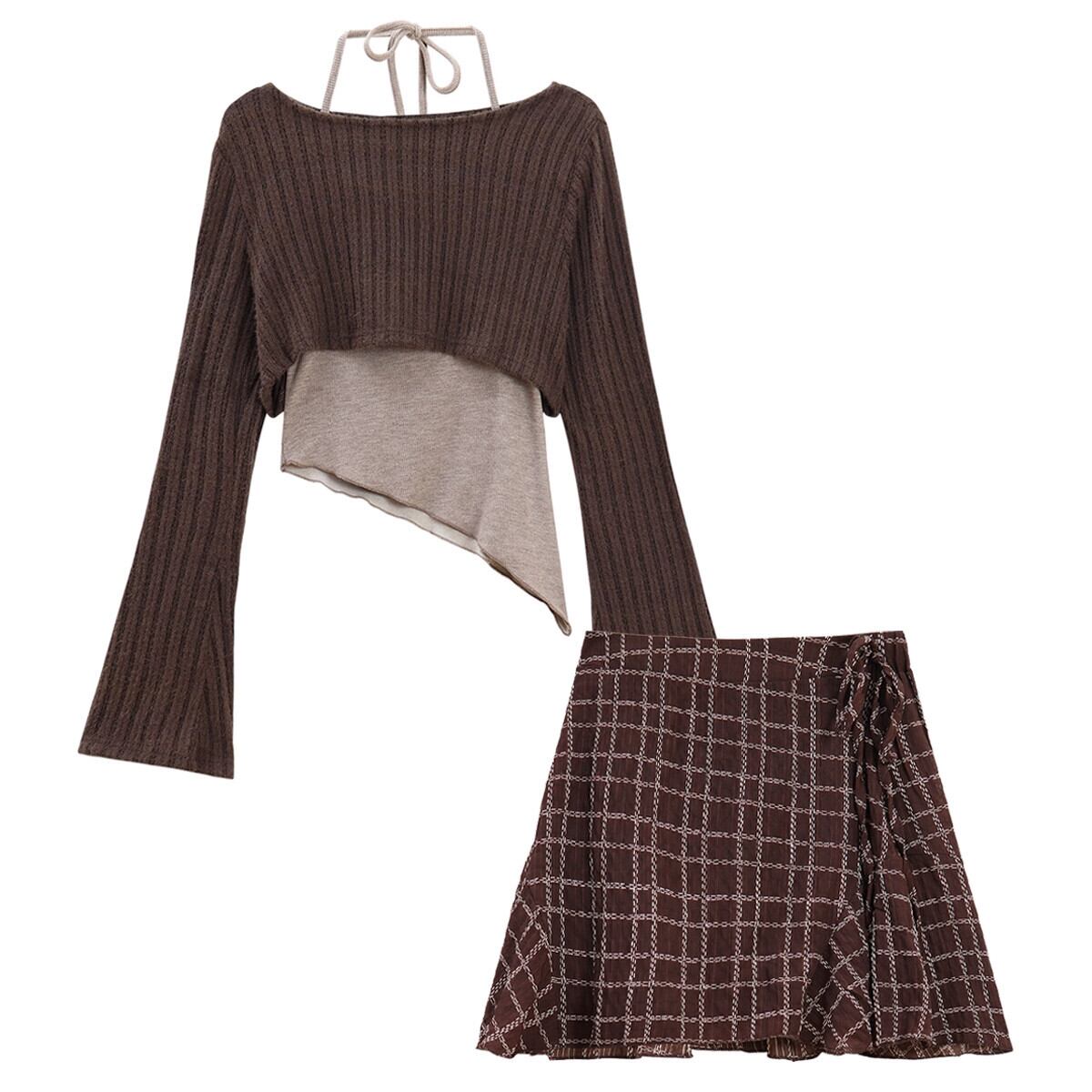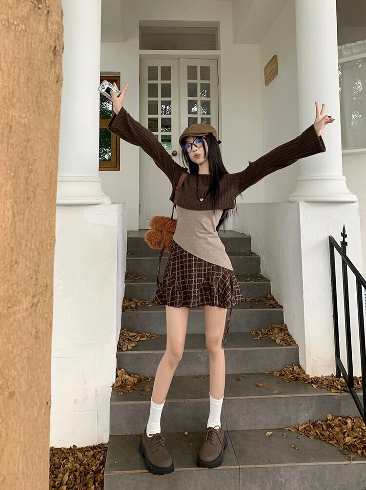 色:茶色のニットアウター,ブラウンチェックスカート,コーヒースーツパンツ,ライトコーヒーサスペンダーベルト