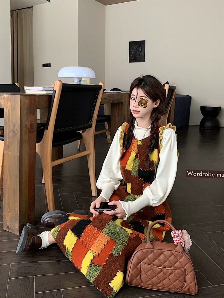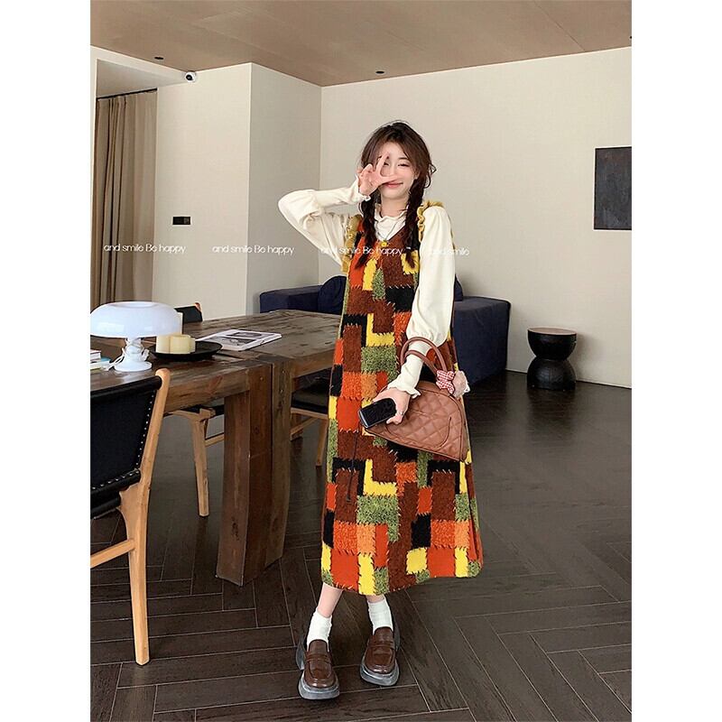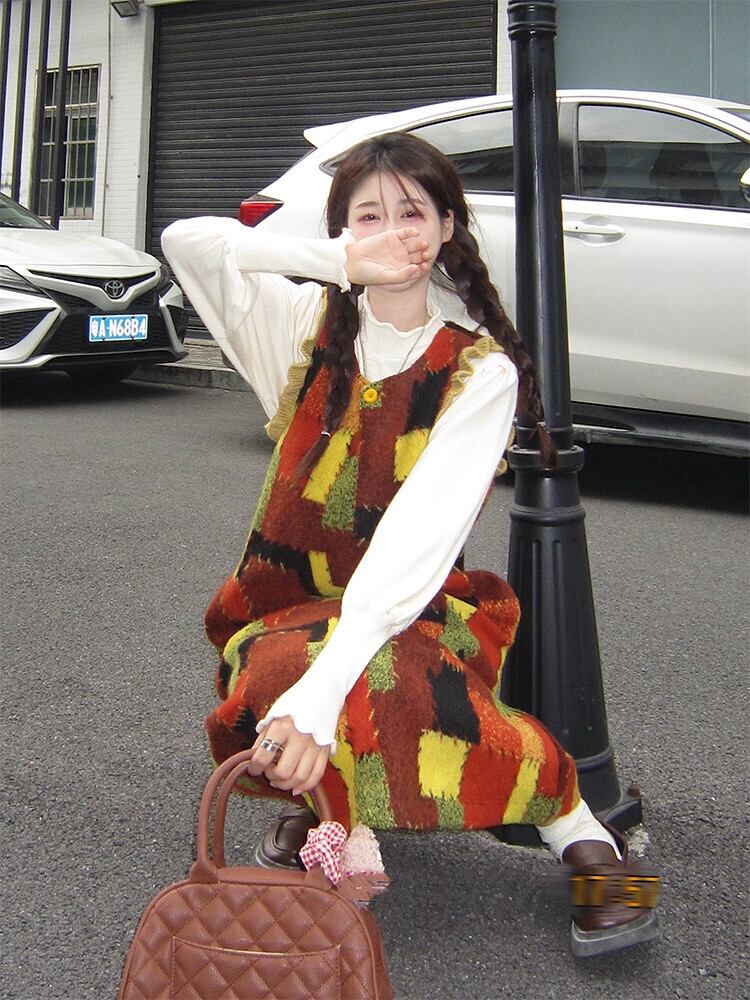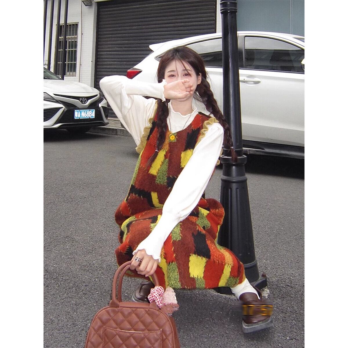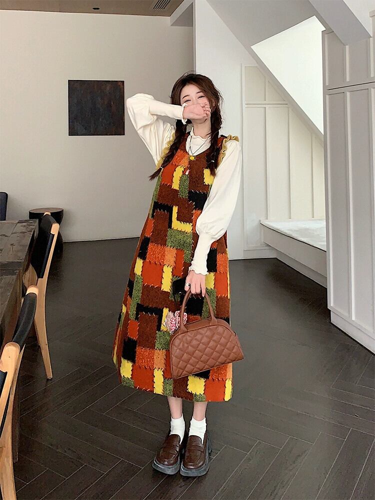 レトロなカラフルなチェック柄ウールベストドレスレディース春フランスの高級超素敵なミドル丈スカート スプリング 春物 missk53454108037