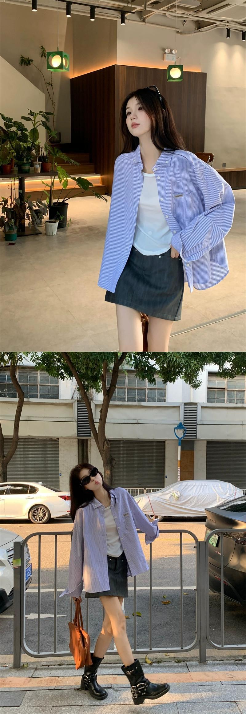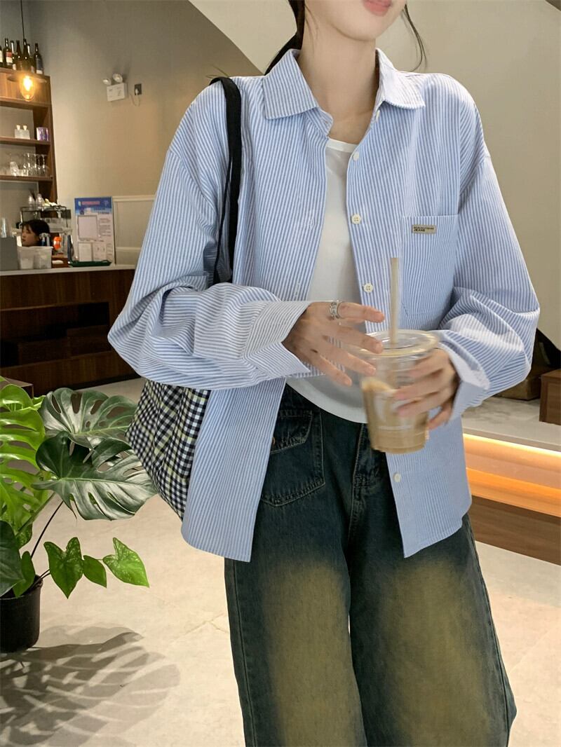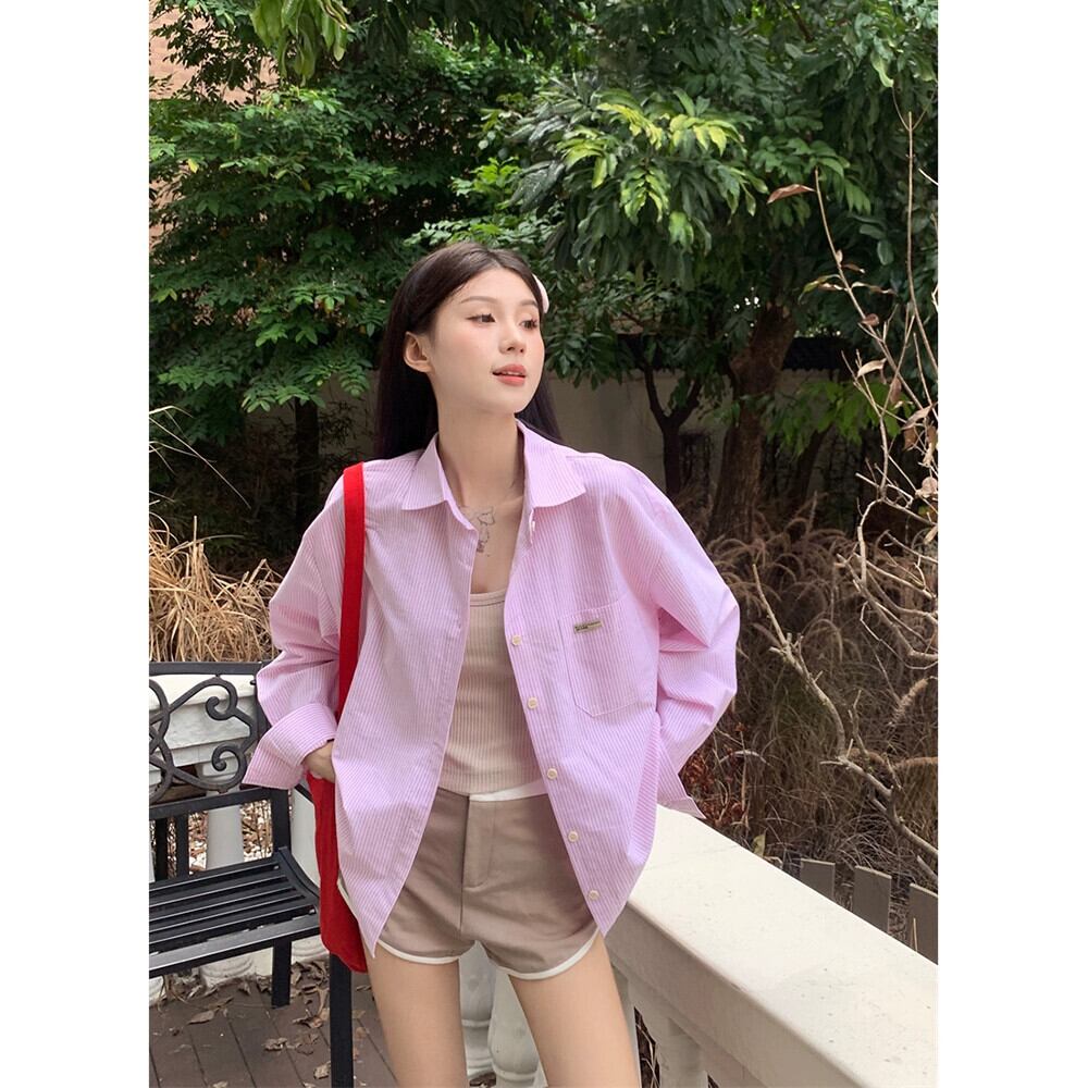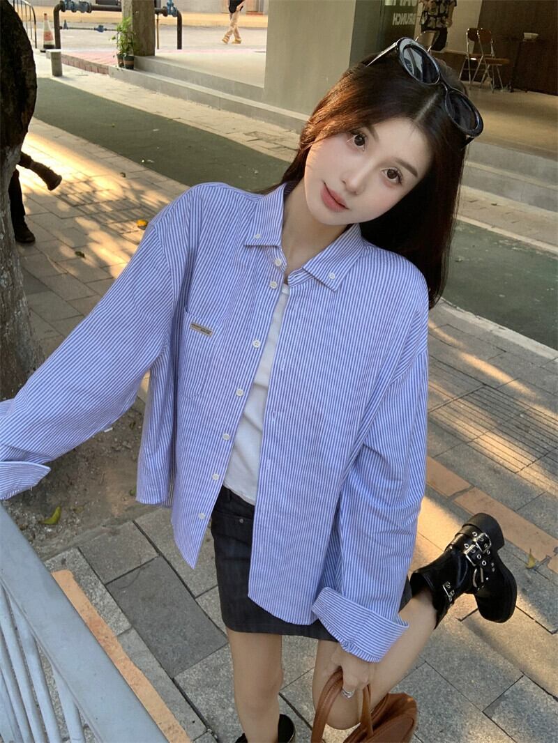 ストライプ長袖シャツ女性春ルーズレイヤードポロカラーシャツジャケットカジュアルシックなニッチトップ ロング レッド スプリング 春物 missk11805907650