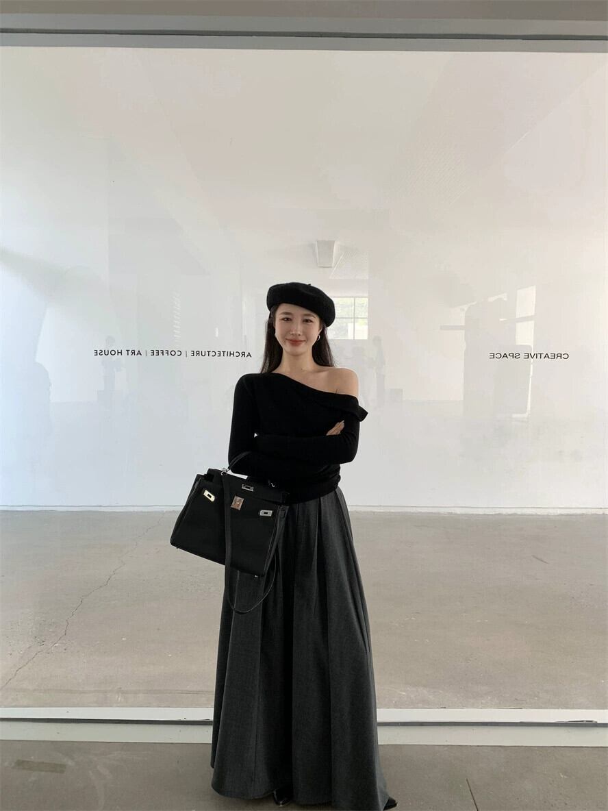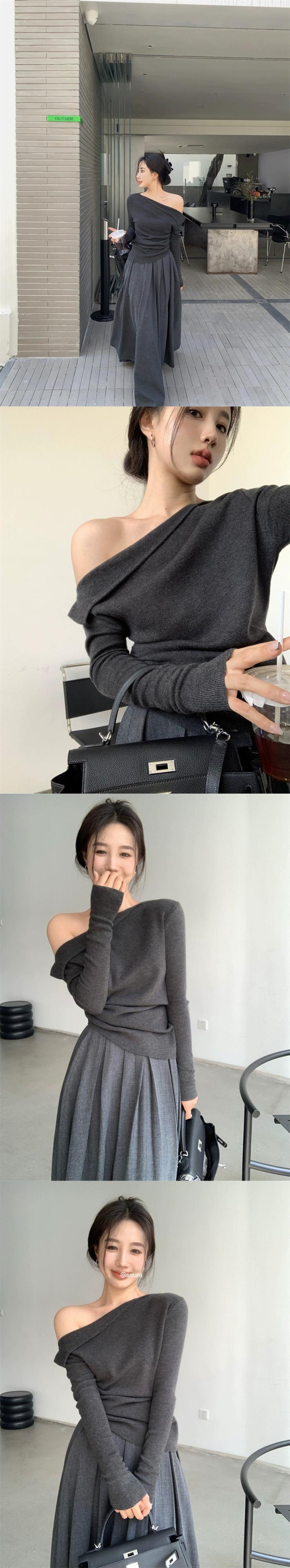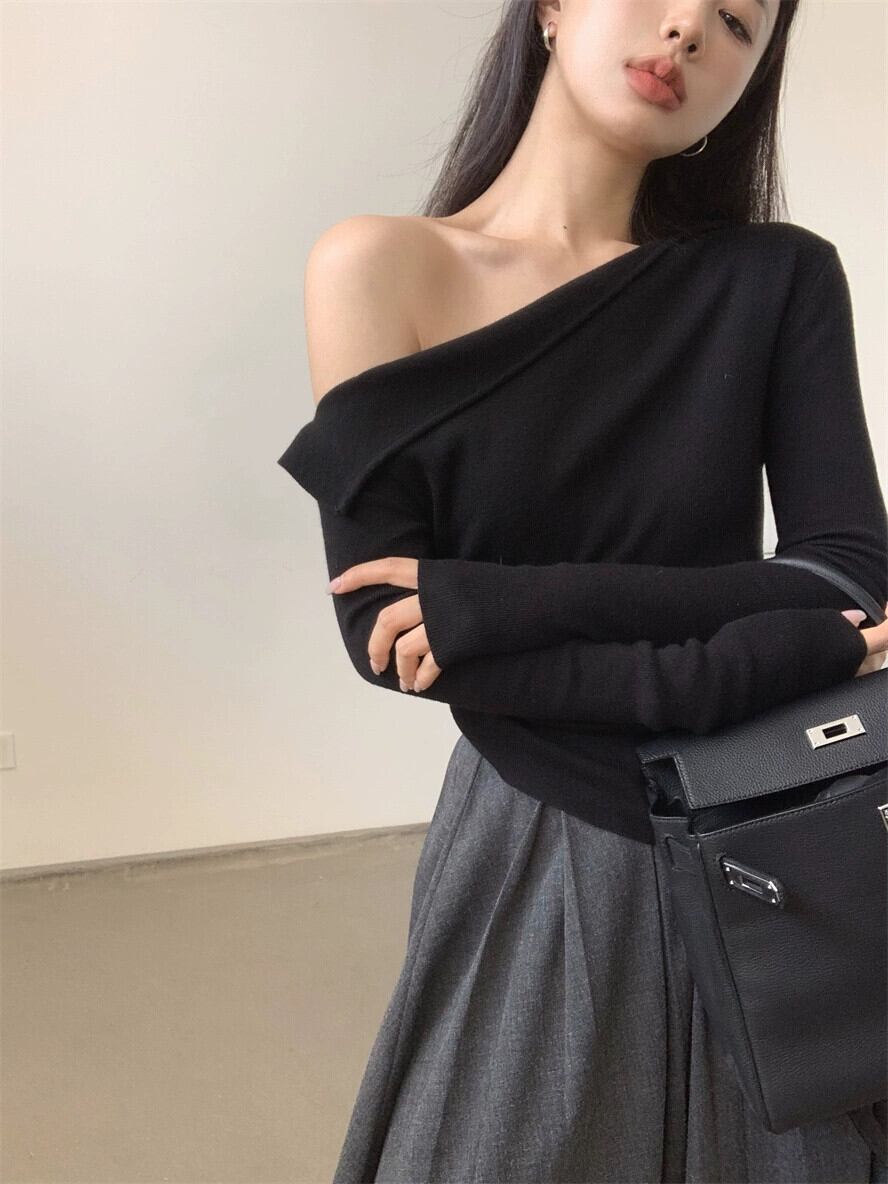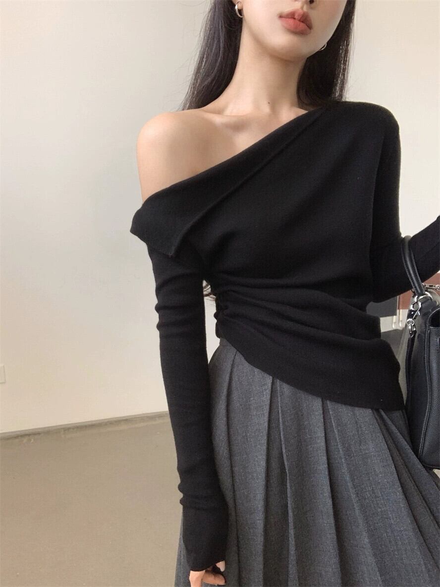ED 斜めショルダー グレー セーター レディース、春の気質、スリム フィット、長袖ボトリング シャツ、ニッチ トップス ロング スプリング 春物 missk48033549998