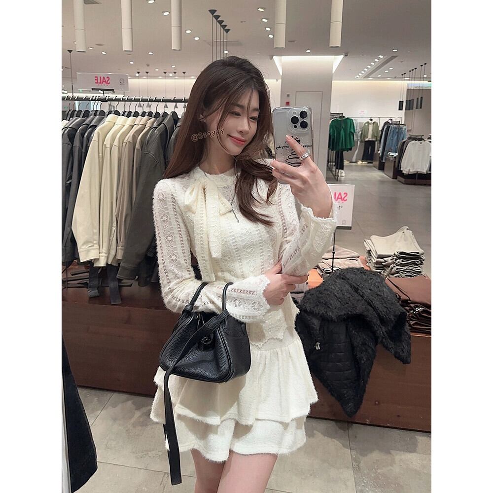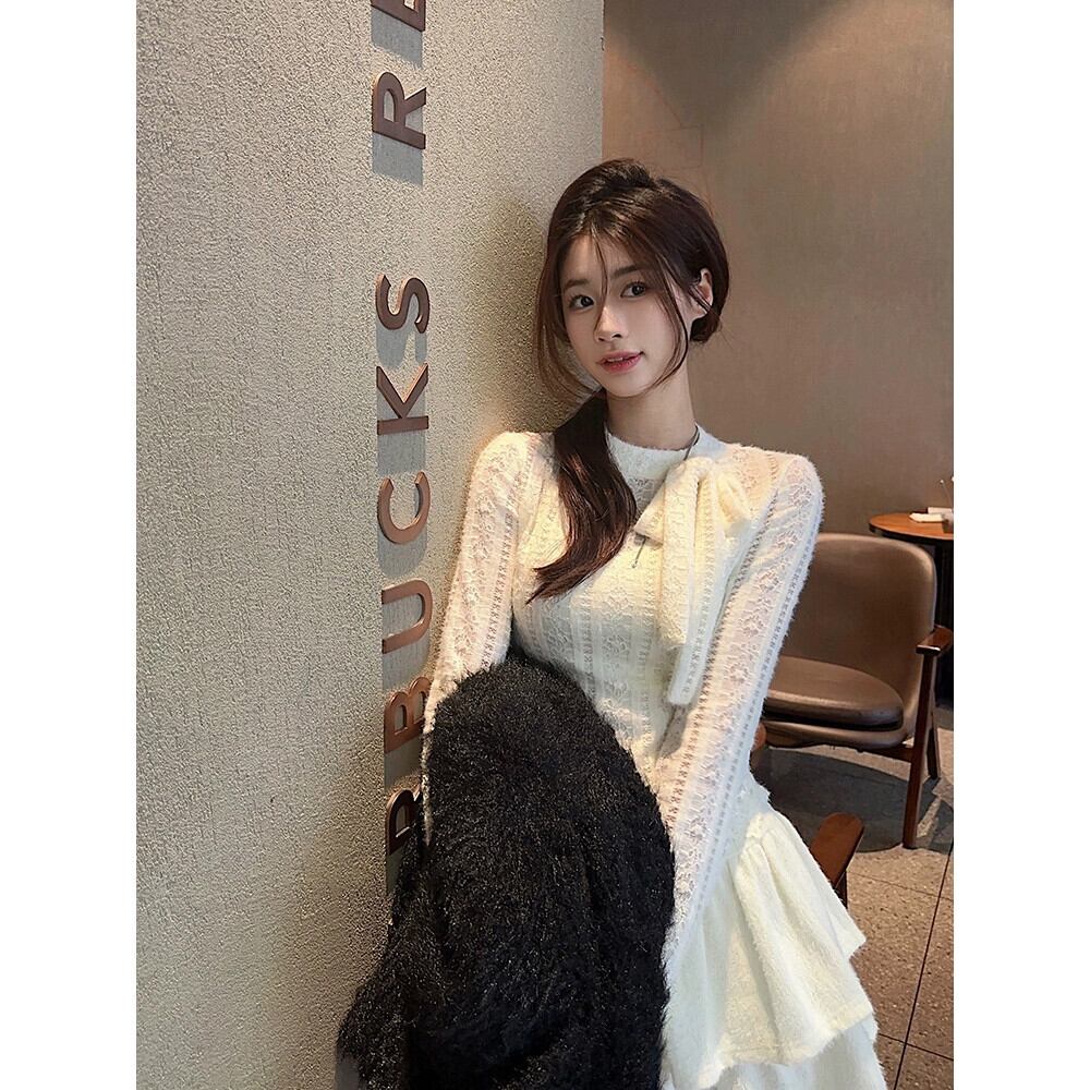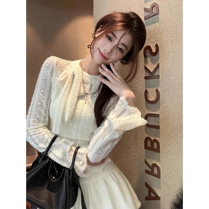 フレンチスタイル不規則レースブラウスレディース、春デザイン、レースアップリボン、トランペットスリーブトップ、シックなブラウス スプリング 春物 missk96991342310