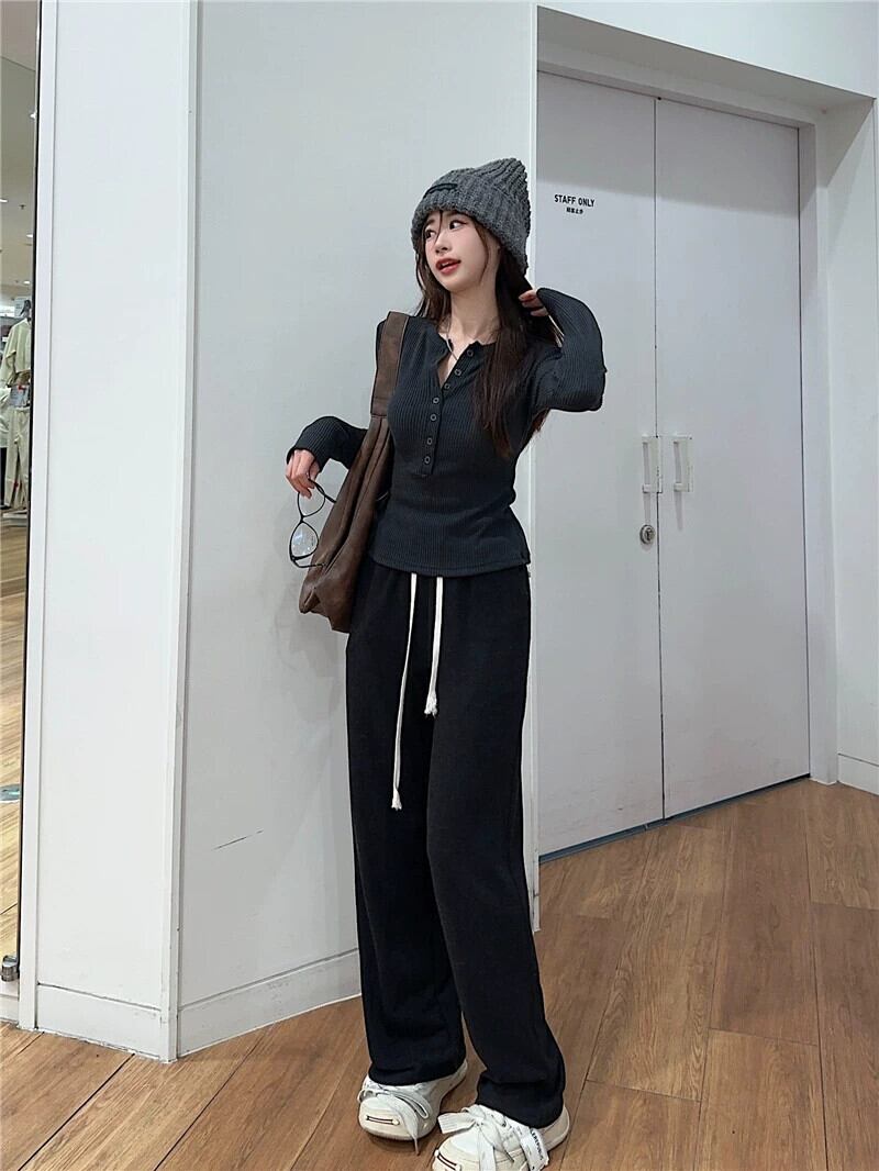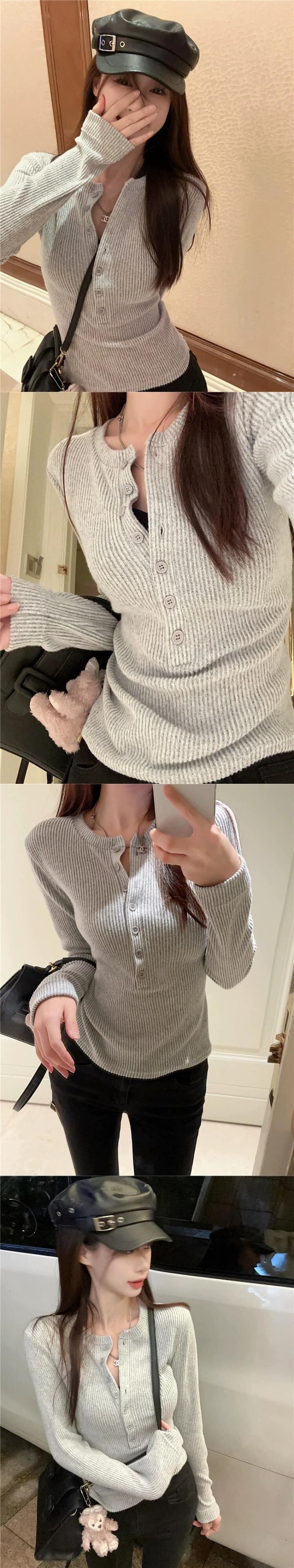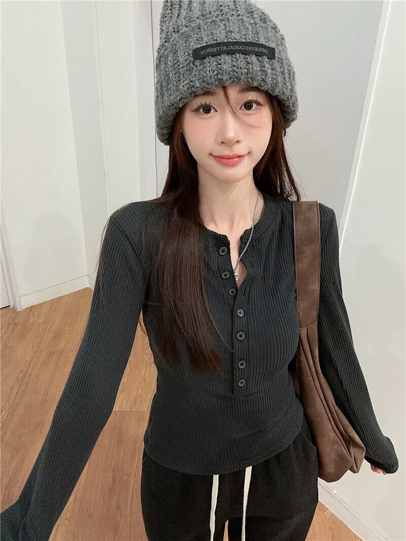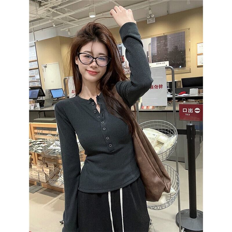 ホットガール右肩長袖 Tシャツ女性の春ハーフボタンスリムフィットボトリングシャツシックなショートトップ ロング スプリング 春物 missk53468081086