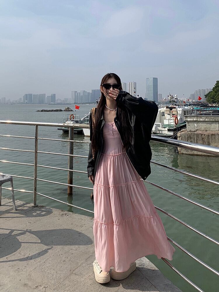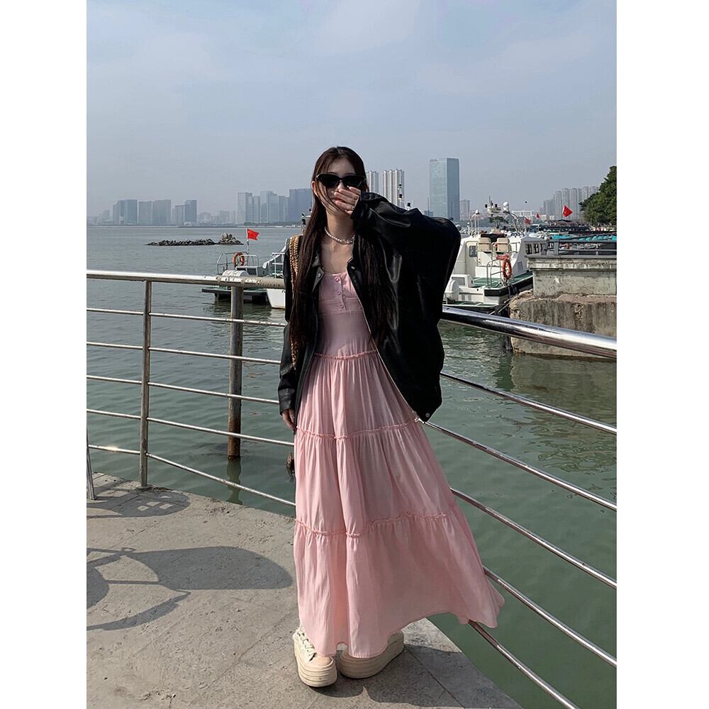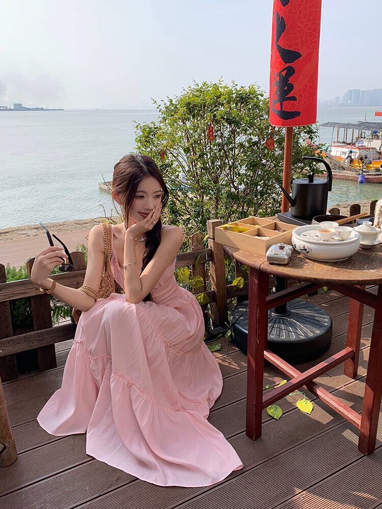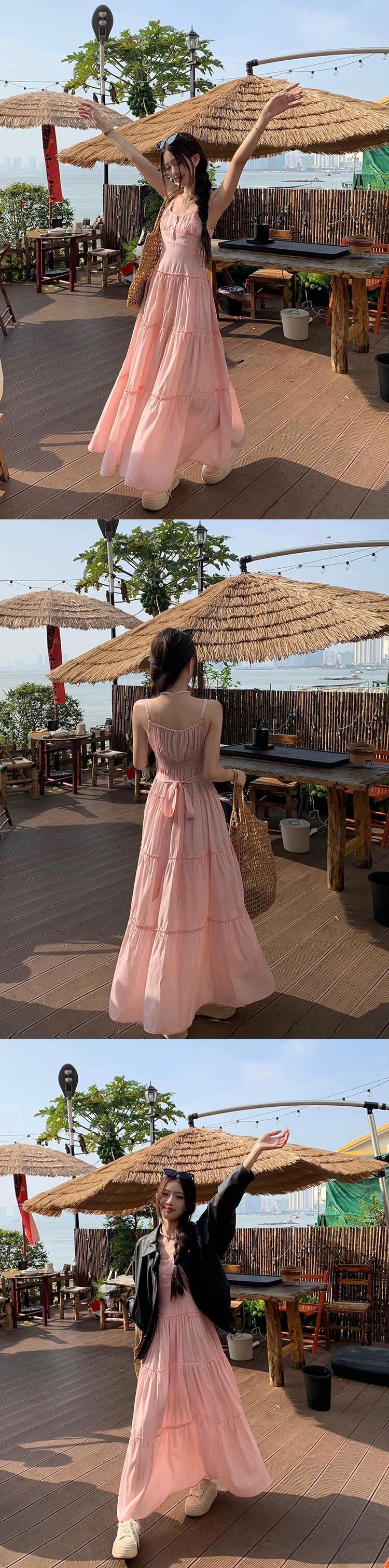 優しいスタイルのブルーサスペンダードレス女性の夏フレンチスタイルウエスト痩身海辺の休暇 A ラインロングスカート サマー 夏物 Aライン missk28659194742