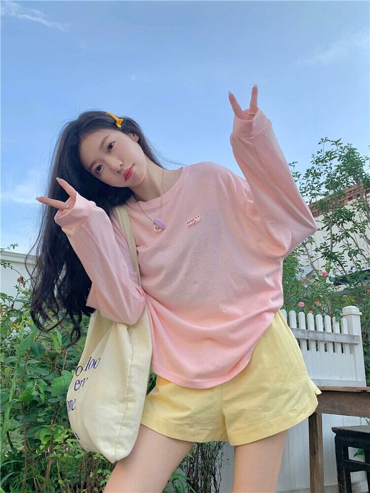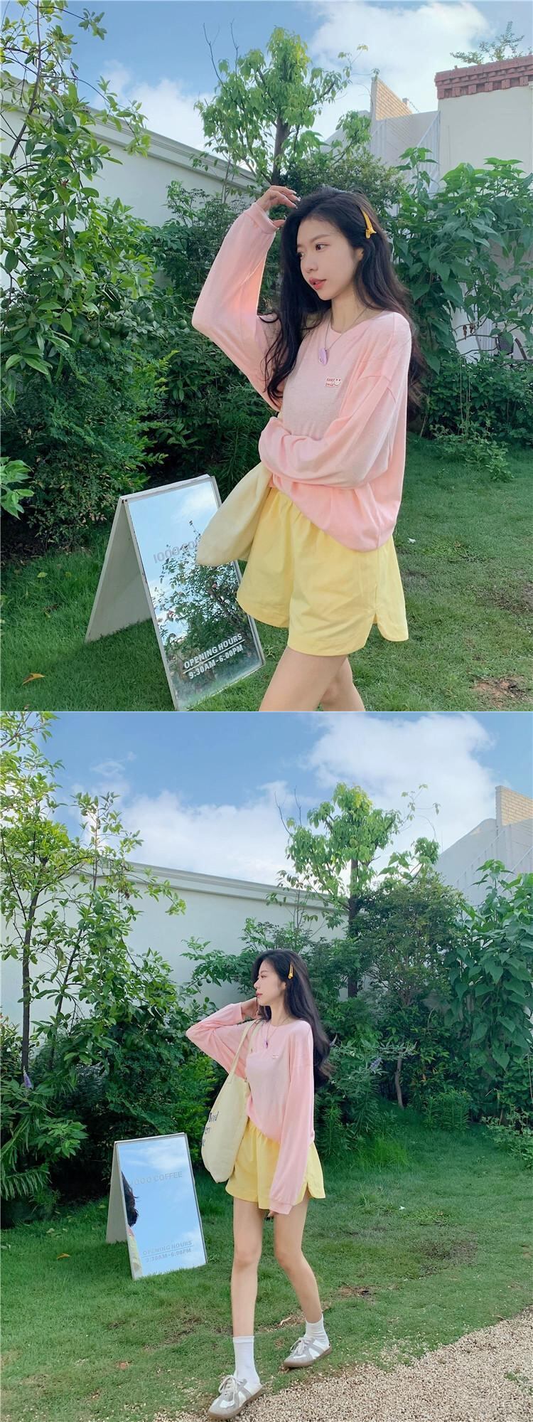 怠惰なスタイルのスーツの女性、春のデザイン、薄手の日焼け防止ピンクの長袖 T シャツ、カジュアルなショートパンツ、おしゃれな 2 点セット ロング スプリング 春物 ショーツ ブルマー Tシャツ missk16041297203
