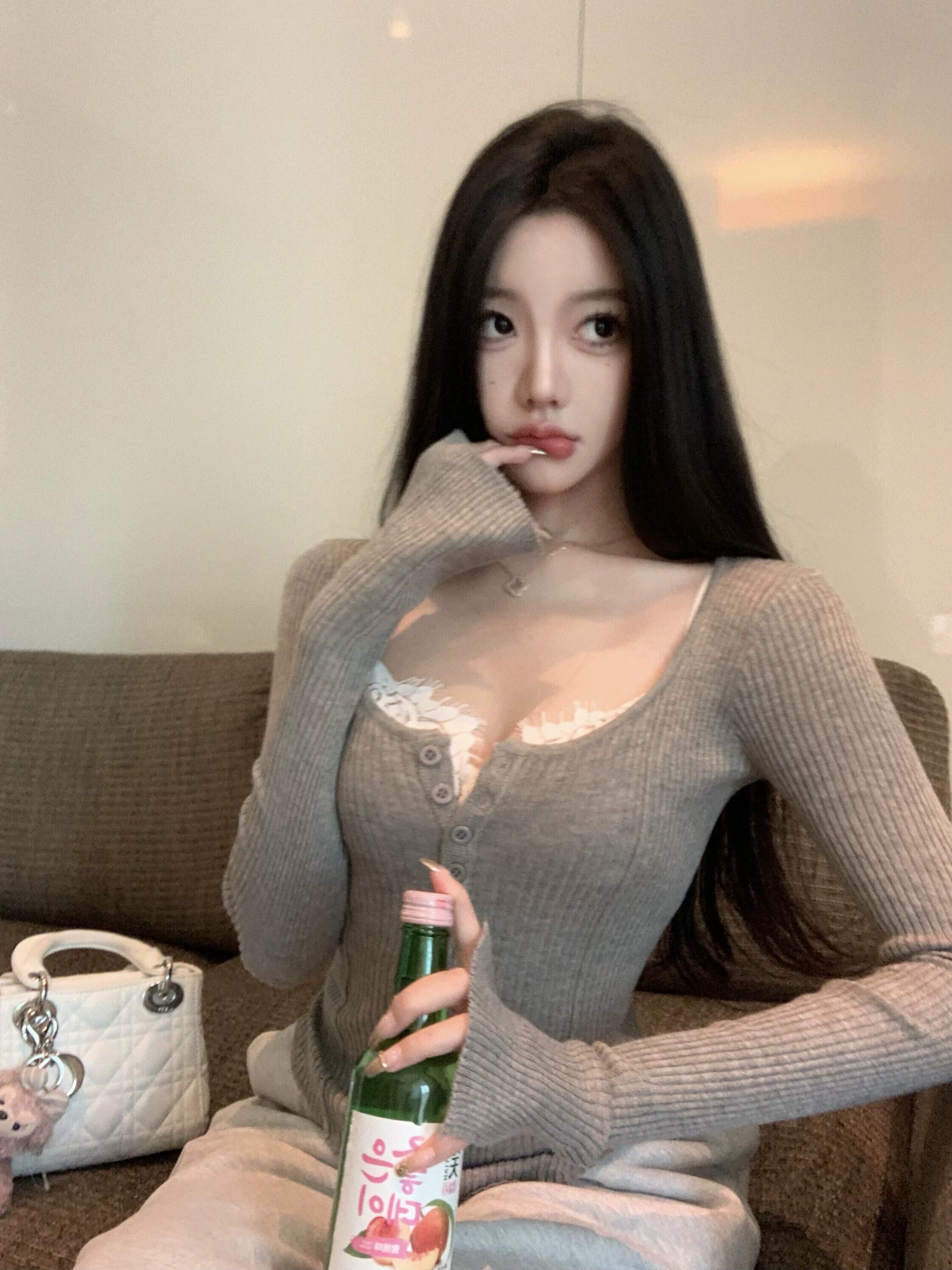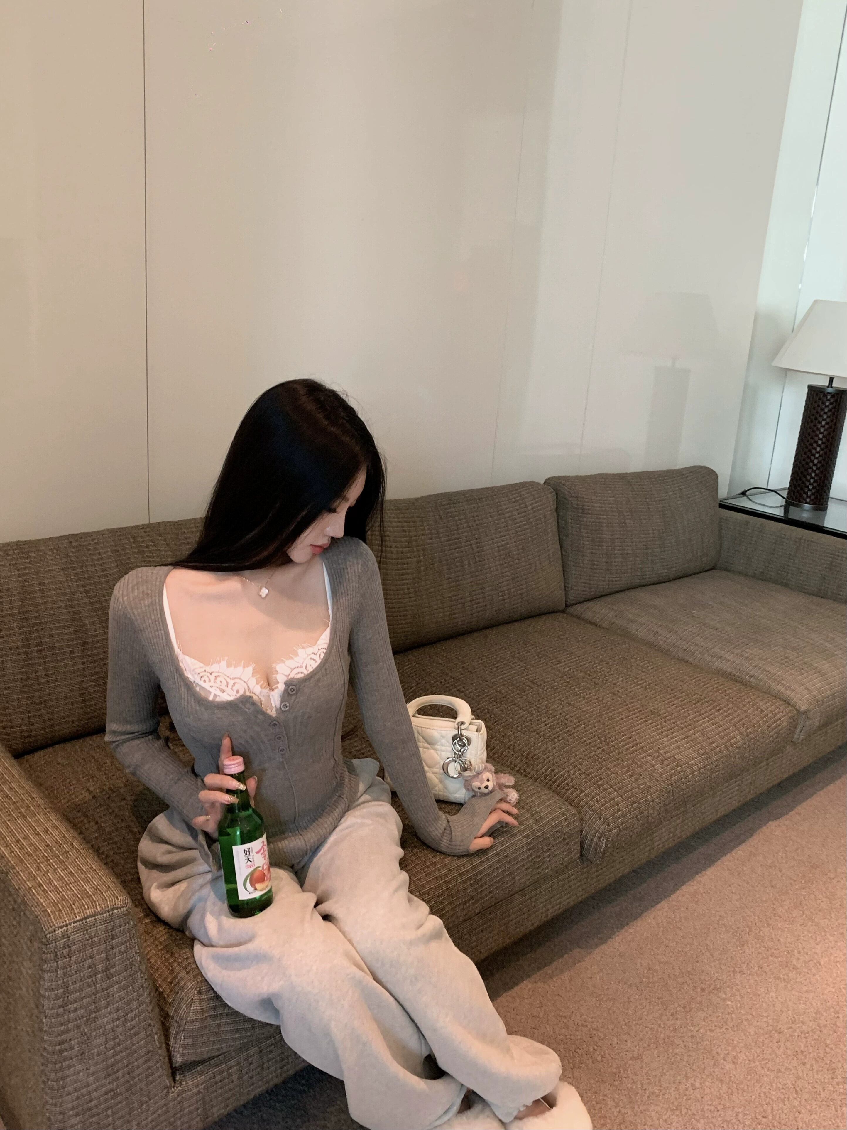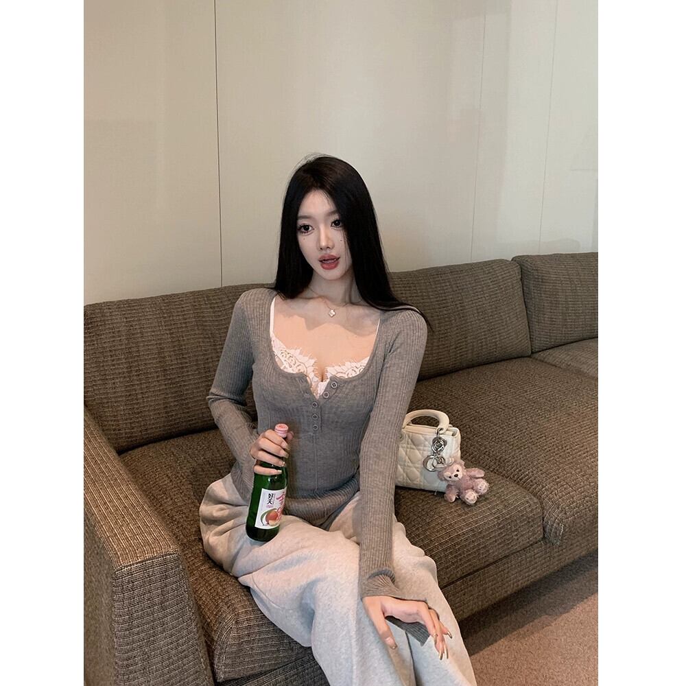 グレーピットストリップスリムスクエアカラー長袖セーター女性春純粋な欲望ボトミングシャツサスペンダートップ 2 点セット ロング スプリング 春物 ピュア スクウェア missk57075624341