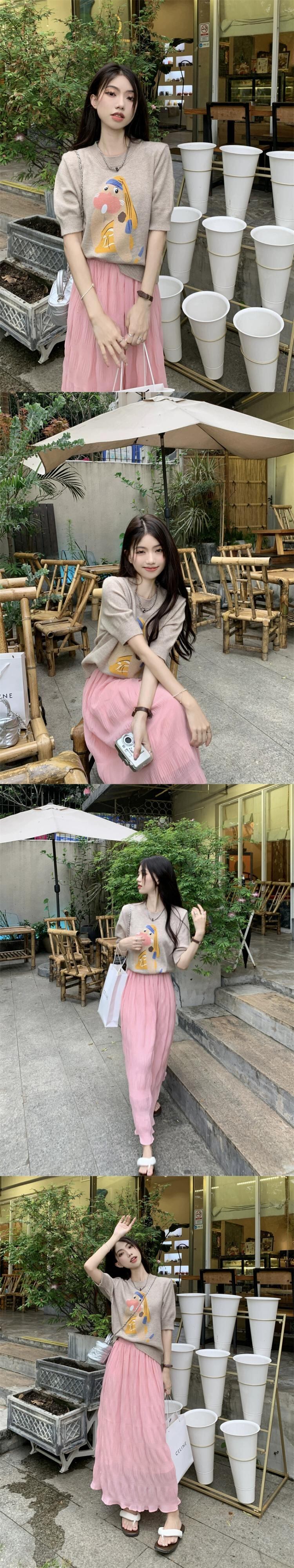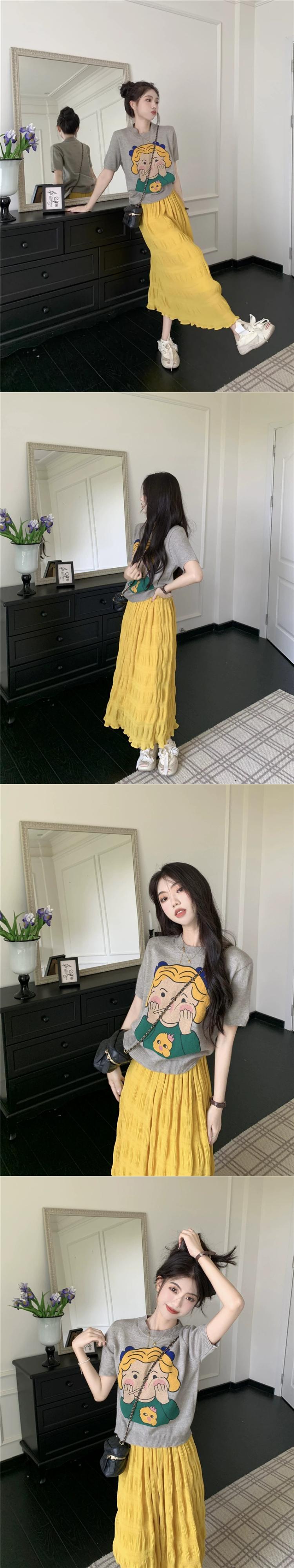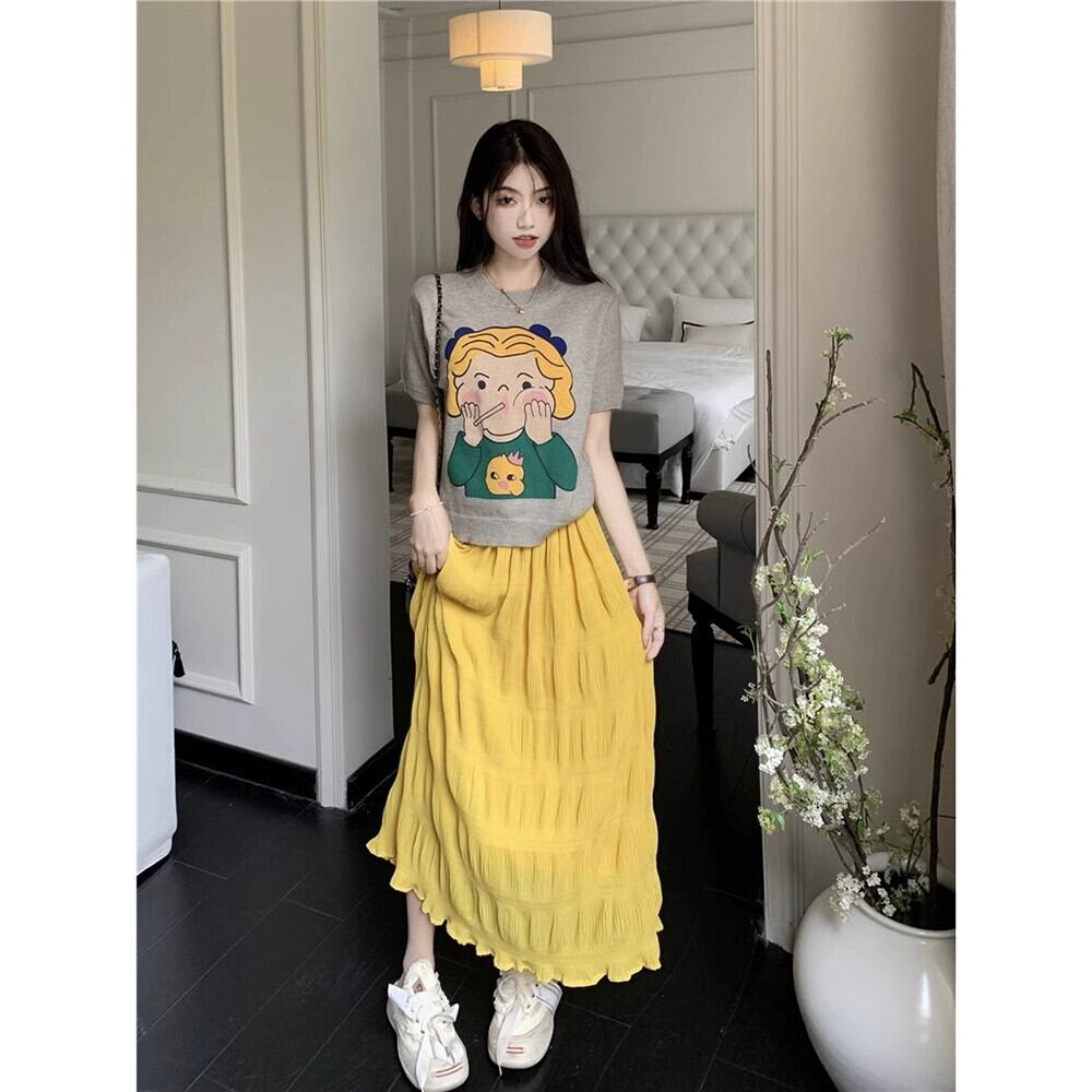 夏の女性スーツ、かわいい漫画プリント半袖セーター、ハイウエストプリーツスカート、ファッショナブルなツーピースセット 大人ガーリー スウィート キュート カジュアル サマー 夏物 missk91953672205