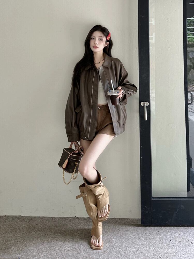 メイラードレトロレザージャケット女性春甘いクールハイエンドオートバイの摩耗 PU レザールーズ長袖トップ ロング 大人ガーリー スウィート キュート カジュアル スプリング 春物 missk8929816973