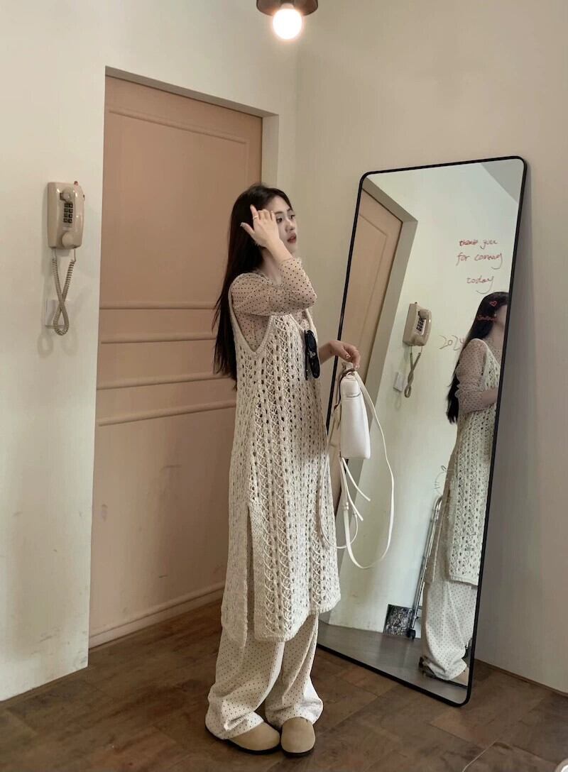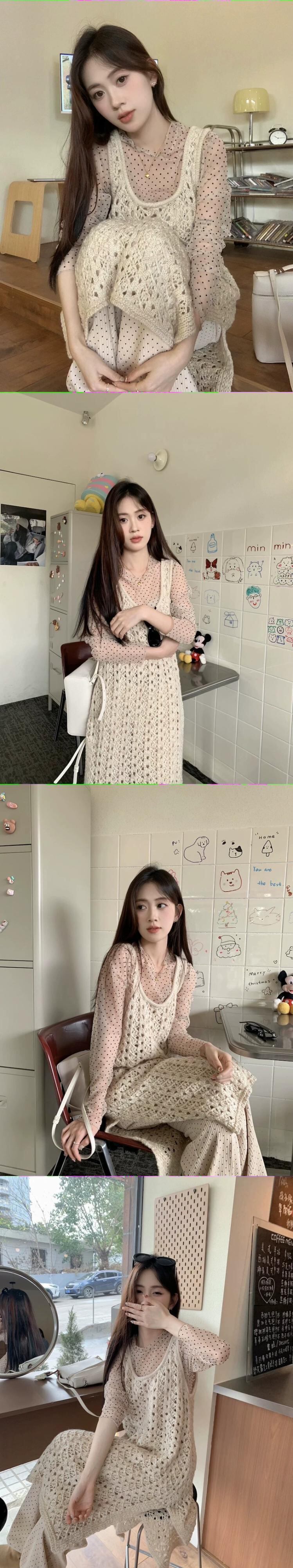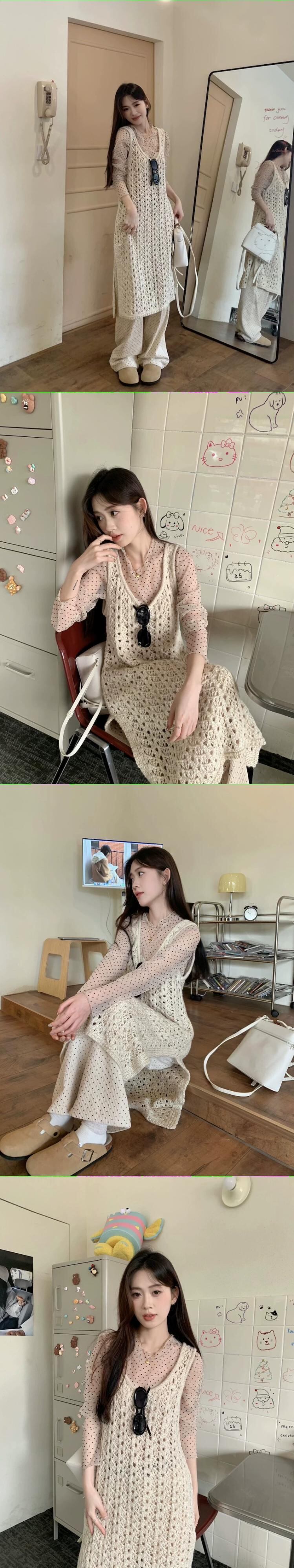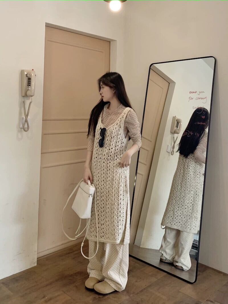 優しい風レイヤードニットドレスレディース春スタイル中空ベストドレス気質スリットミッドレングススカート レッド スプリング 春物 missk78292453453
