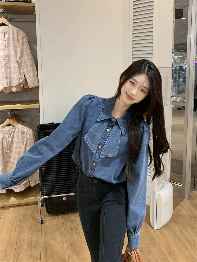 レトロリボンデニムシャツレディース春可能レイヤード長袖シャツジャケットシックなトップ ロング レッド スプリング 春物 missk64482981817