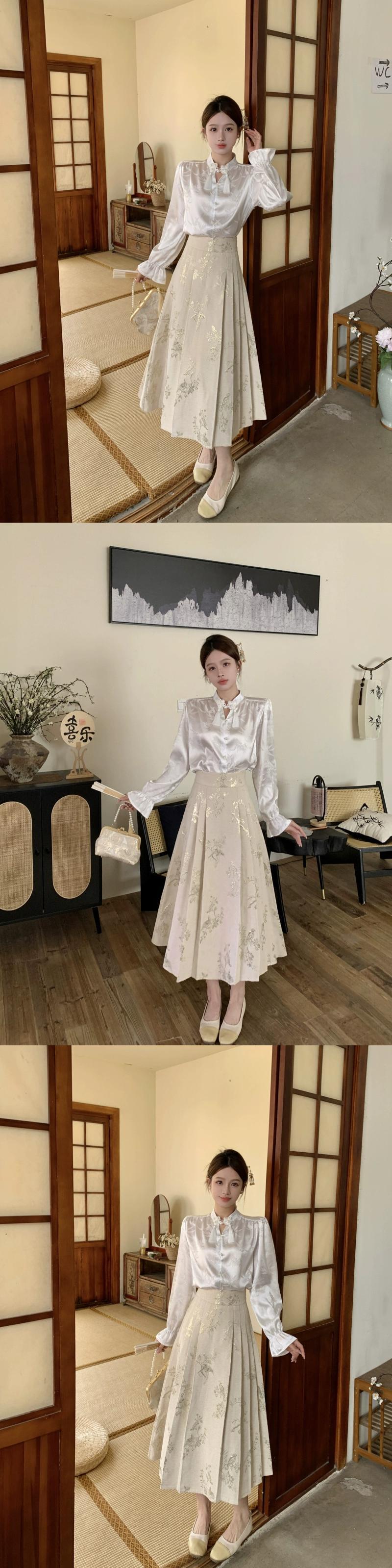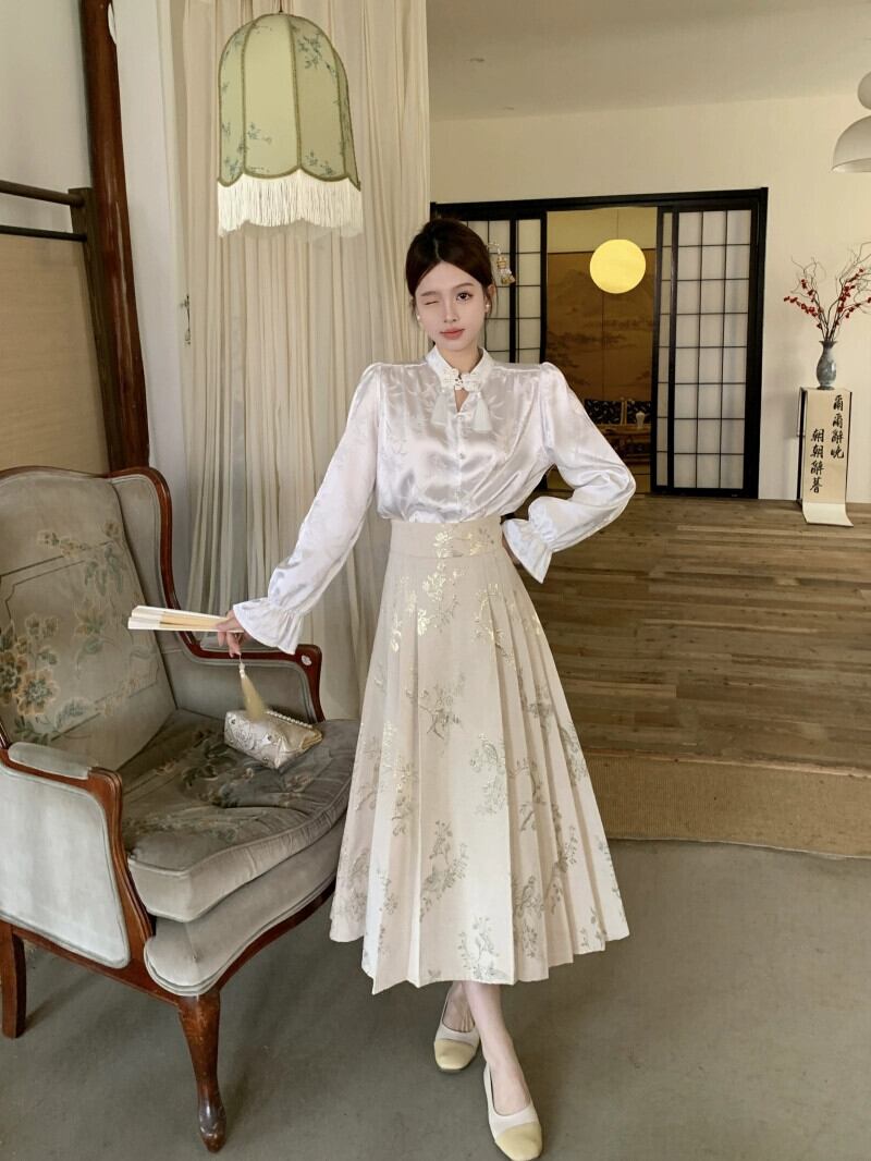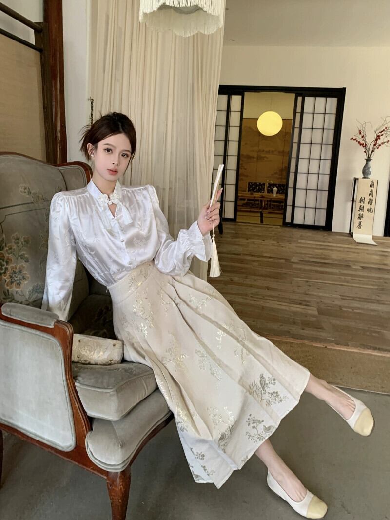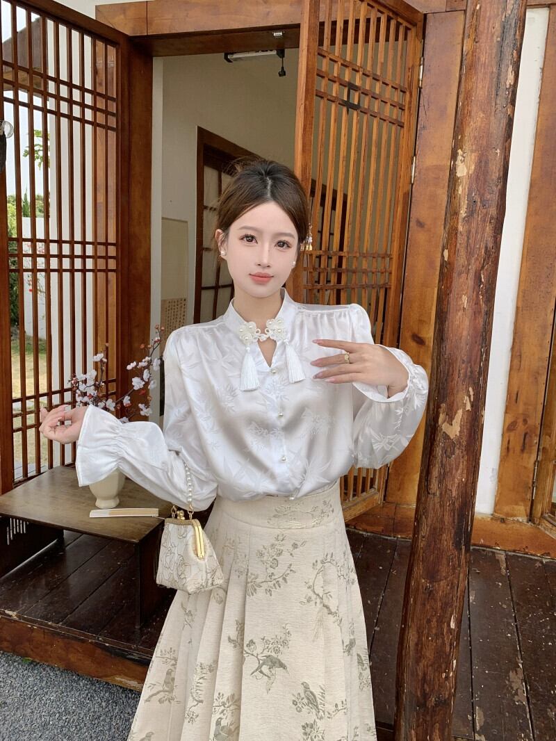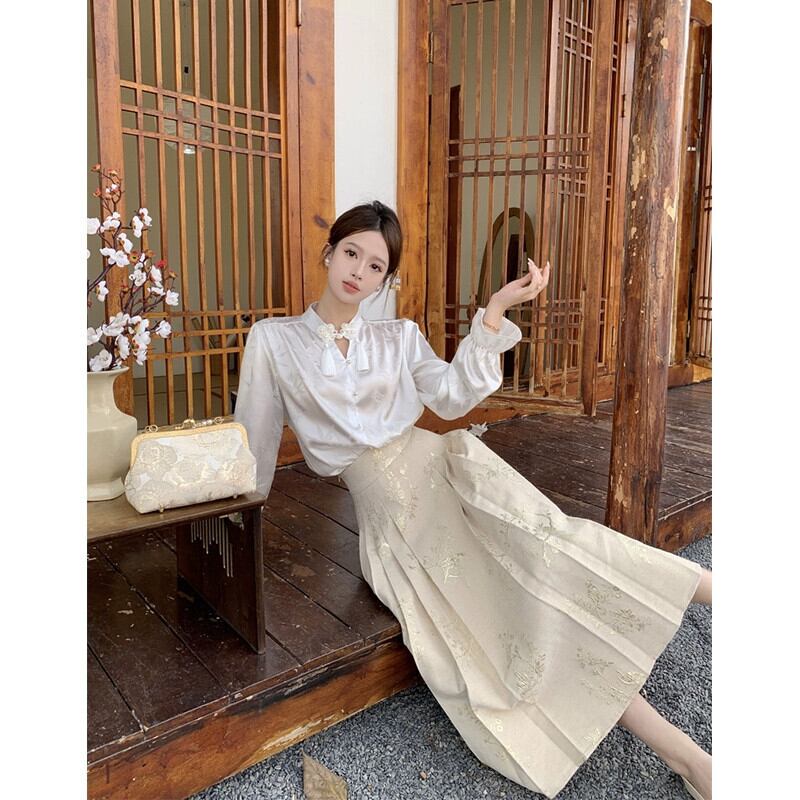 国民的なスタイルの新中国スーツ女性春レトロボタン付きスタンドカラーシャツヘビージャカード馬の顔スカートファッショナブルなツーピースセット スプリング 春物 missk81144046785