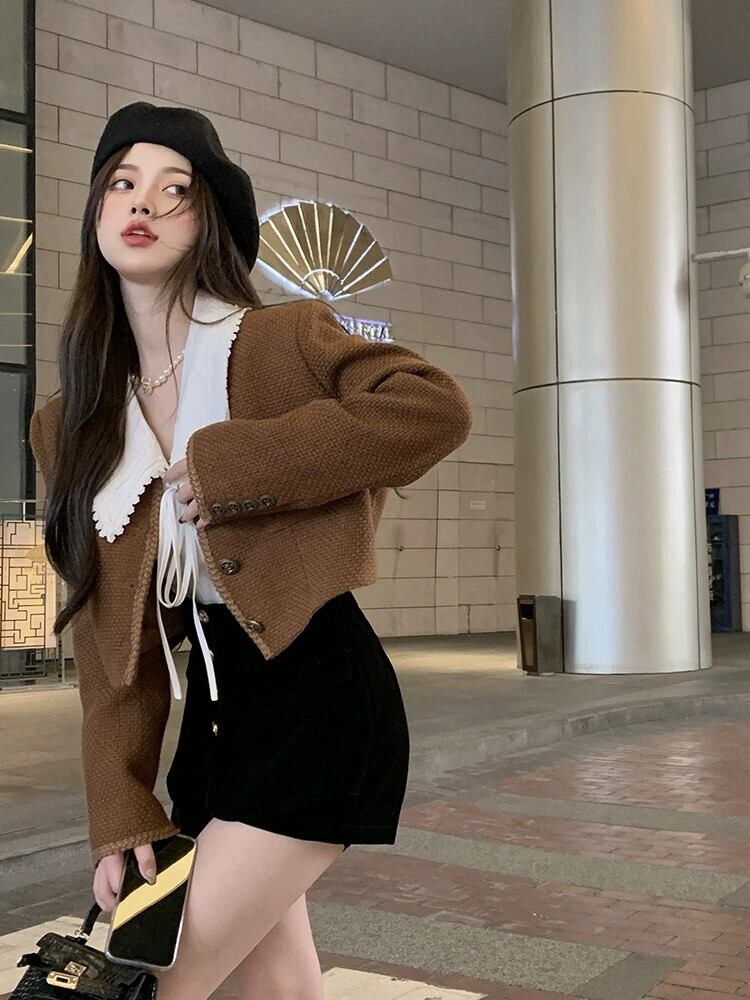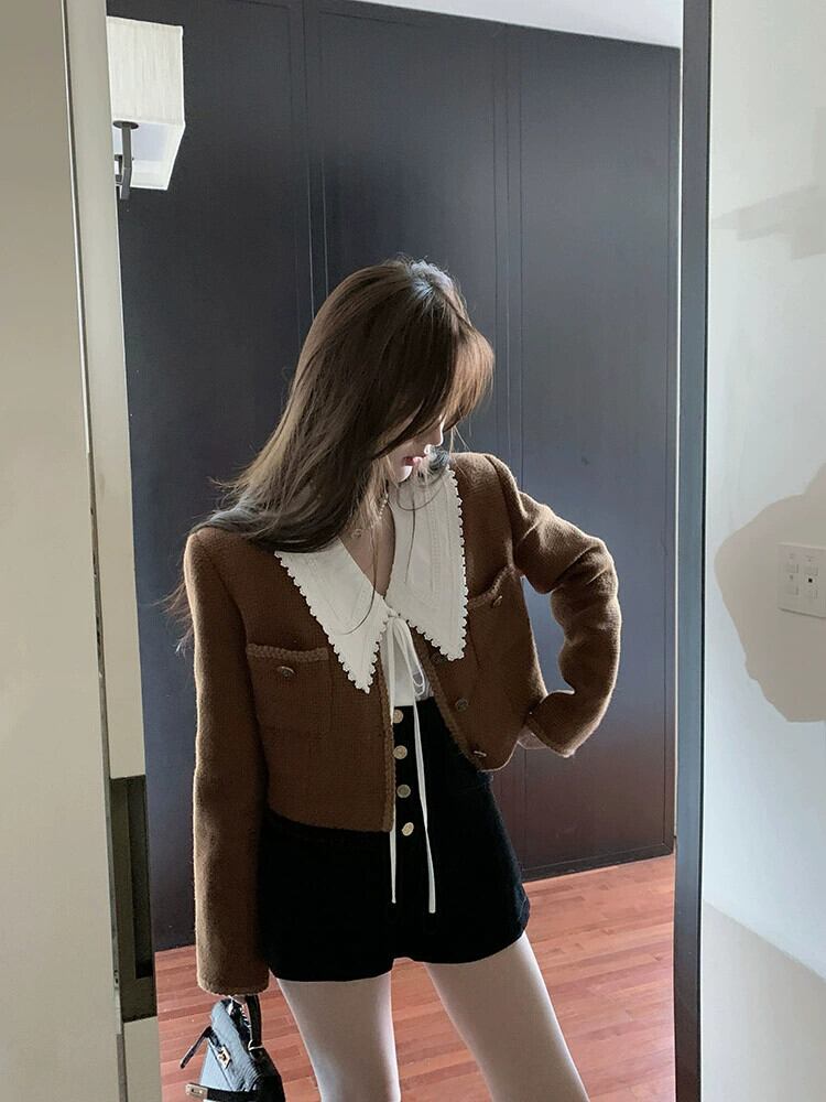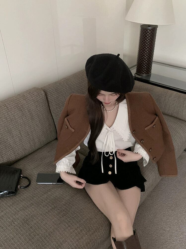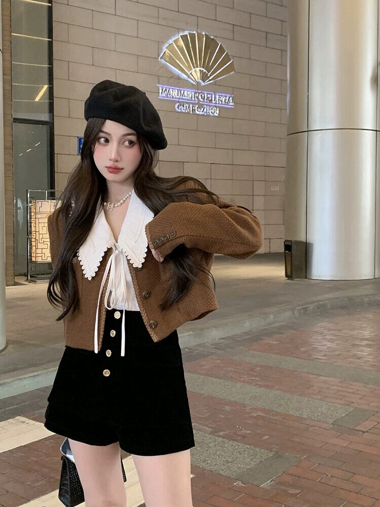 Xiaoxiangfeng 甘辛長袖コート人形襟レースアップシャツベルベットショートパンツ女性の 2024 年春の新作 3 点セット ロング 大人ガーリー スウィート キュート カジュアル スプリング 春物 ショーツ ブルマー missk808304201