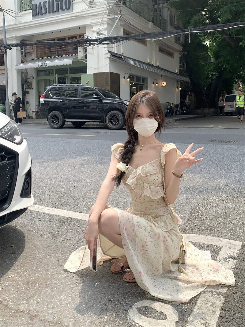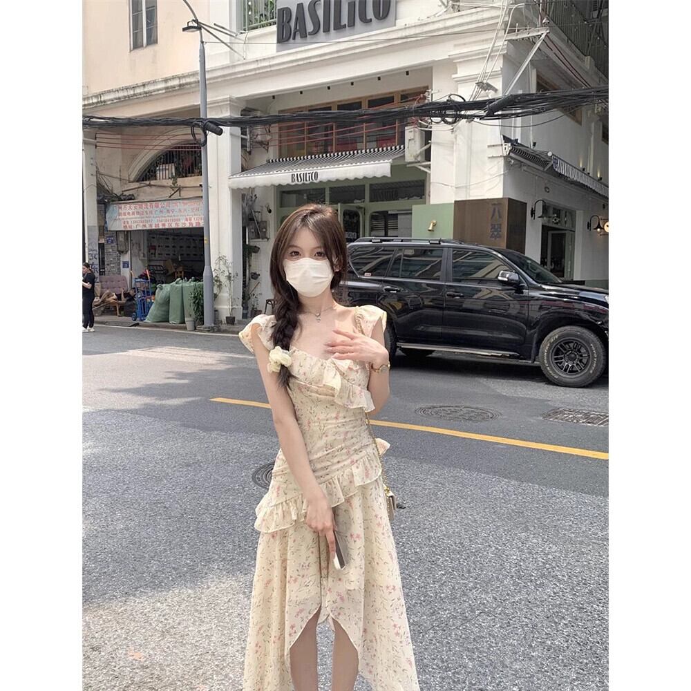フランスの花柄サスペンダードレスの女性、春のデザイン、不規則なスカート、甘い気質、ウエストを細くするロングスカート 大人ガーリー スウィート キュート カジュアル スプリング 春物 missk21652162169