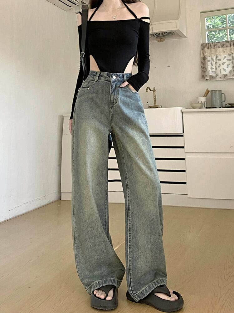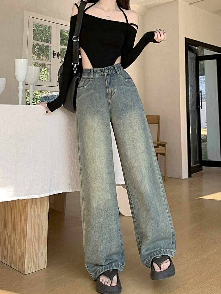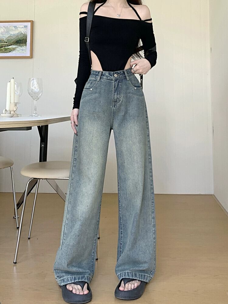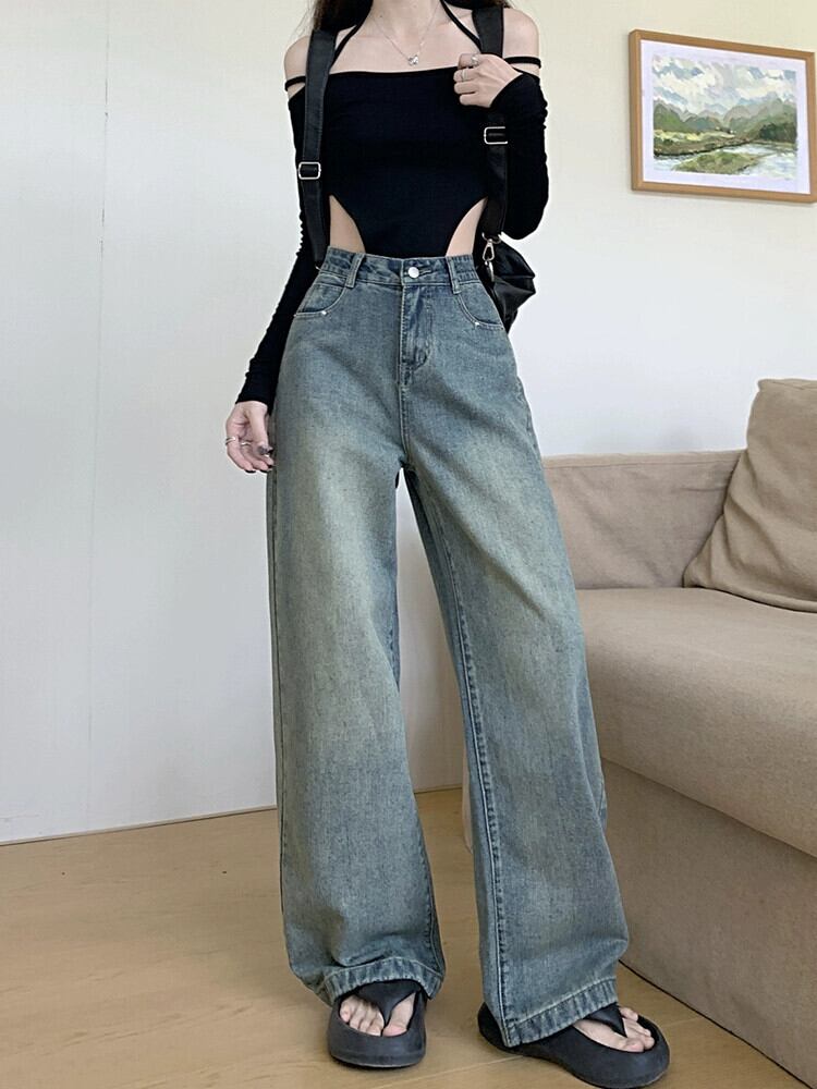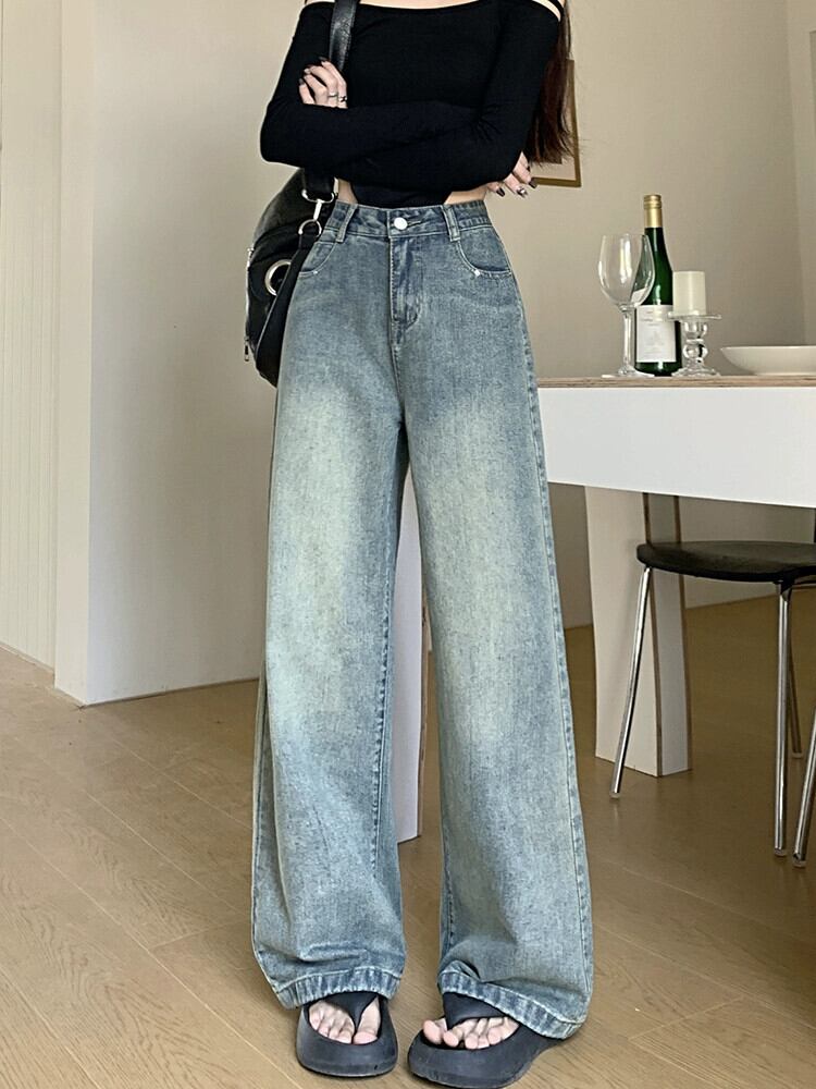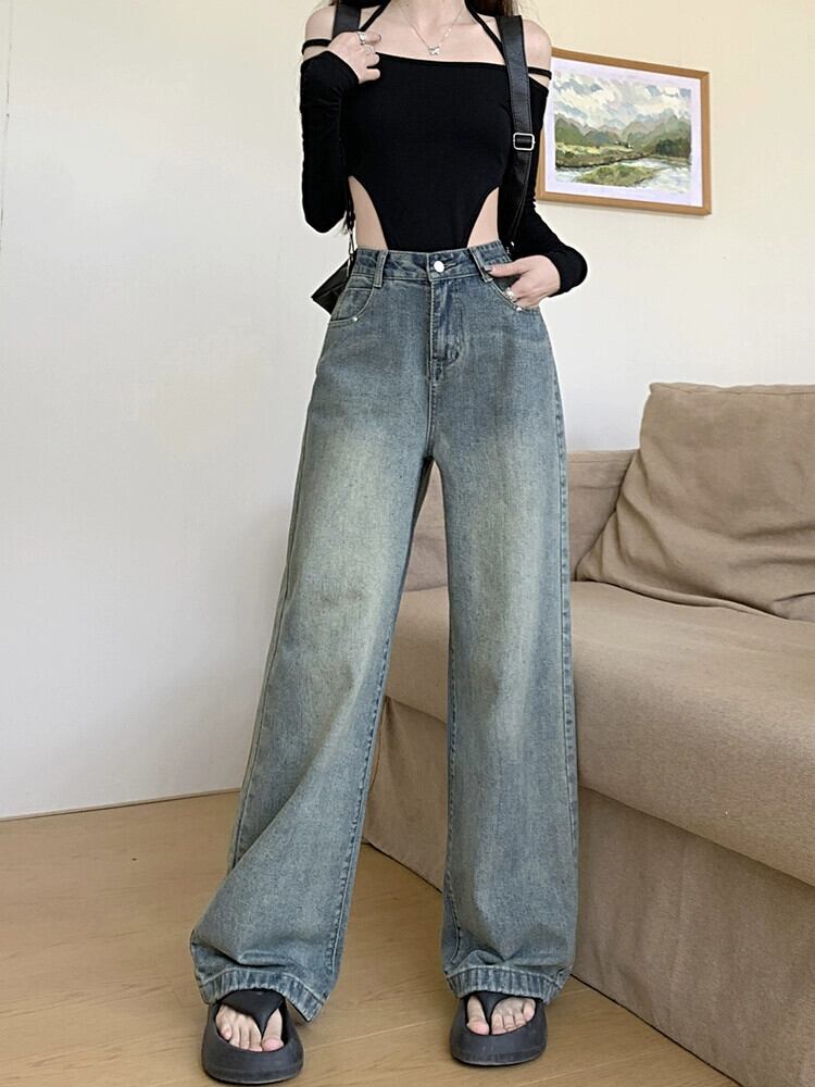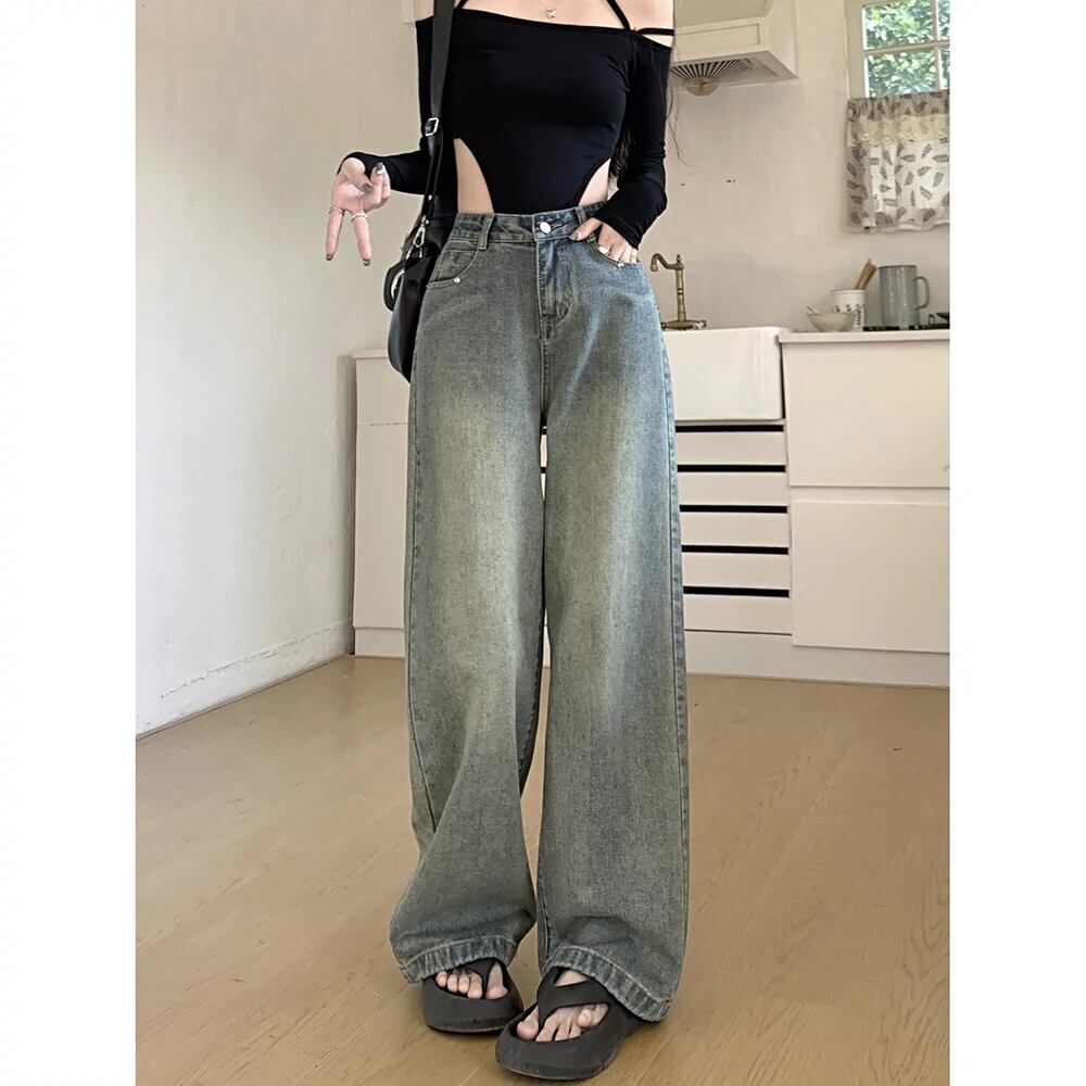 レトロウォッシュストレートジーンズ女性 2024 春の新しい多用途ハイウエストルーズワイドレッグパンツフロアレングスロングパンツ スプリング 春物 missk75864780395