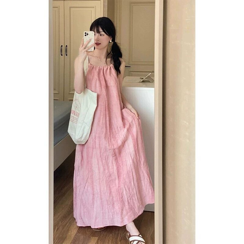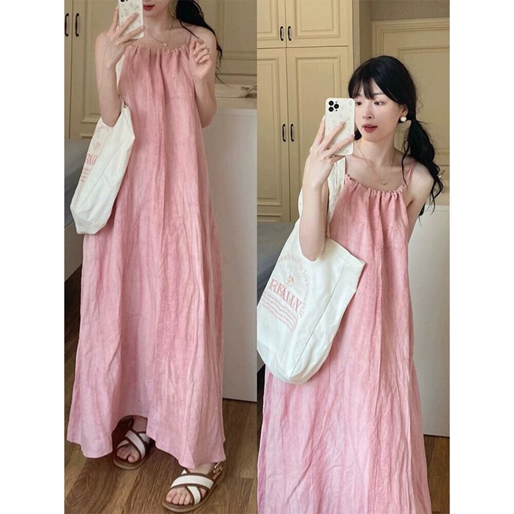 甘いピンクのホルターネックサスペンダードレス女性、春の海辺のリゾートスタイルの緩い痩身気質Aラインロングスカート 大人ガーリー スウィート キュート カジュアル スプリング 春物 missk84641243788
