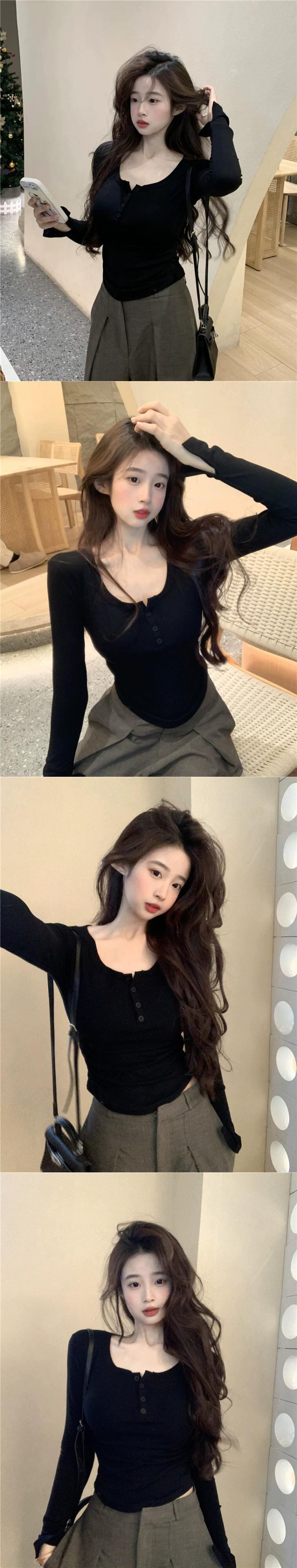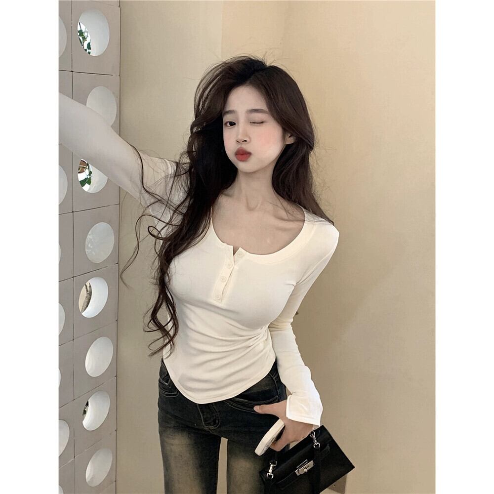 純粋な欲望 U ネック長袖 Tシャツ女性 2024 春の新しいボタンデザインスリムフィットショートインナーボトニングトップトレンディ ロング スプリング 春物 missk74319729662