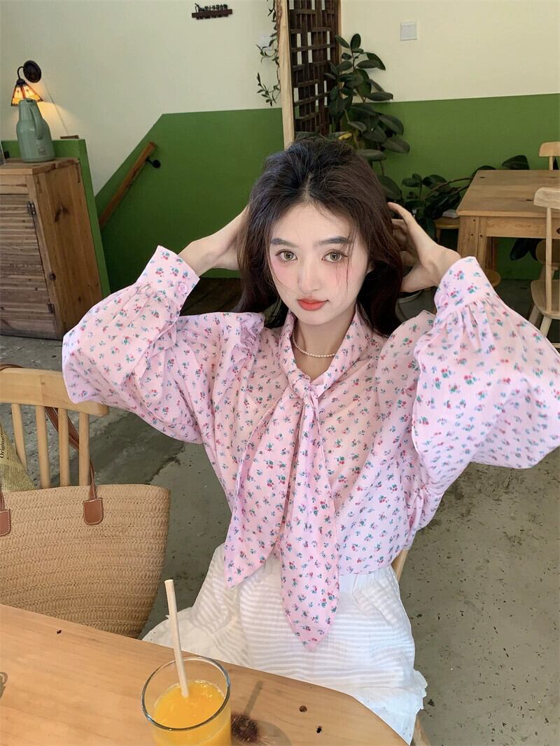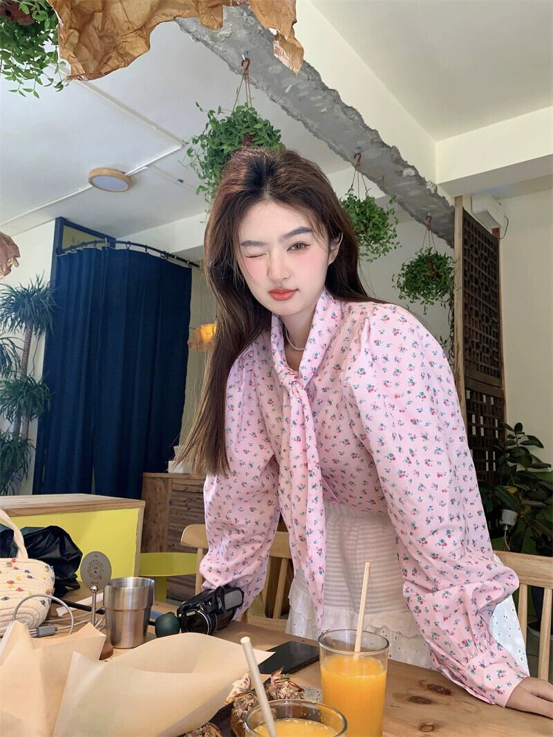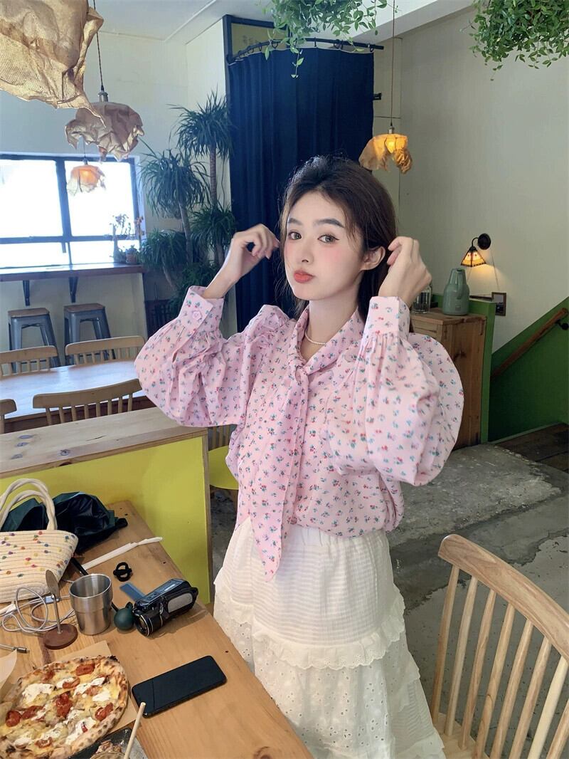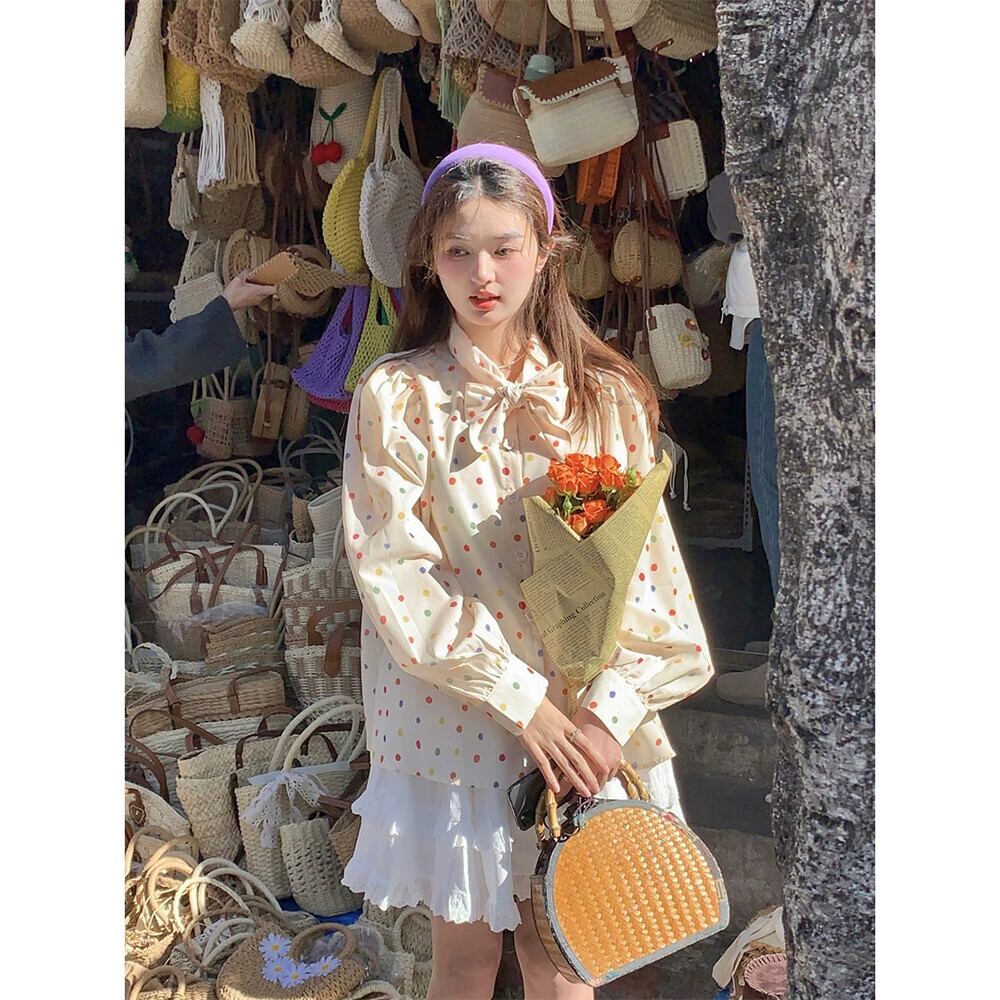 甘い水玉模様のレースアップボウシャツレディース春デザインシックなトップスルーズ長袖シャツ ロング リボン 大人ガーリー スウィート キュート カジュアル スプリング 春物 missk82286898650