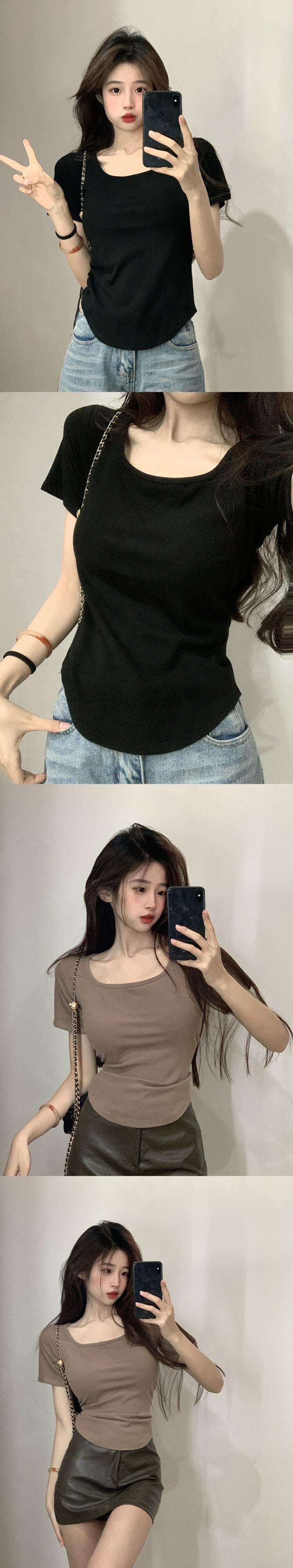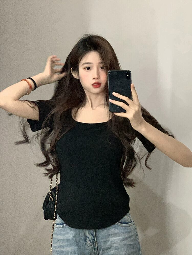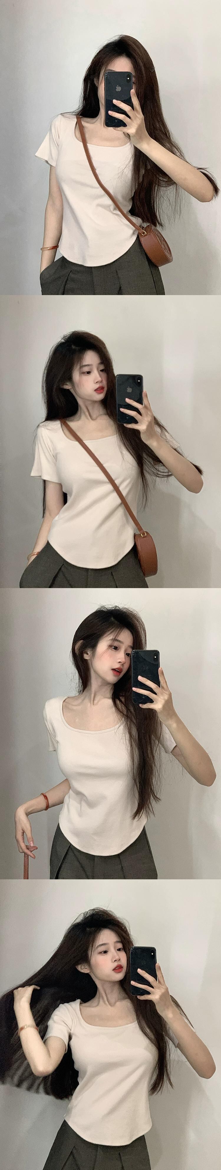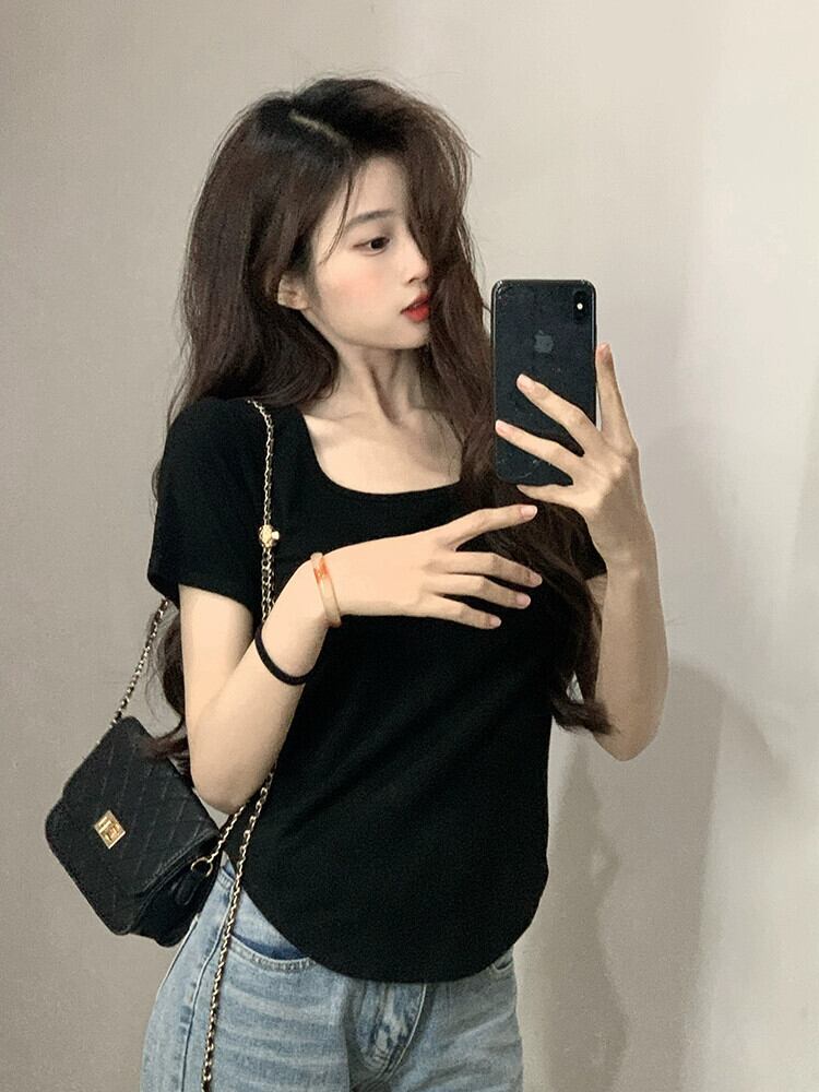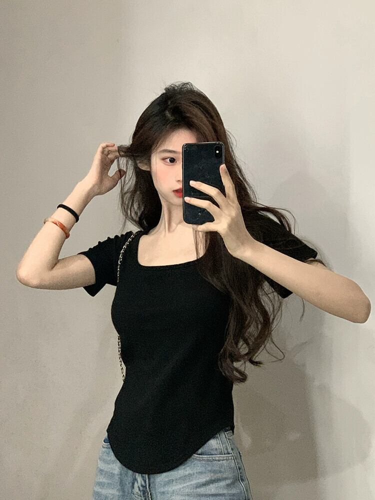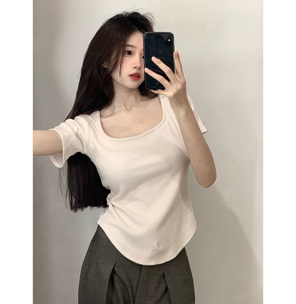 Pure lust スタイル U ネック半袖 T シャツレディース夏ニッチデザイン不規則なスリムフィットショートトップ サマー 夏物 Tシャツ missk16832820036