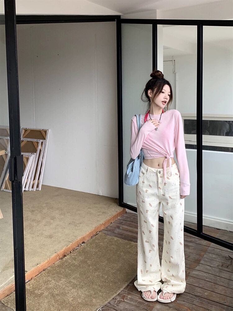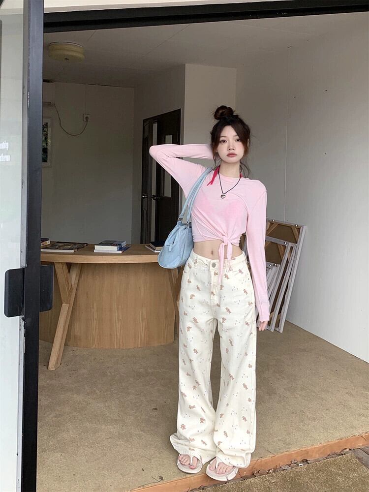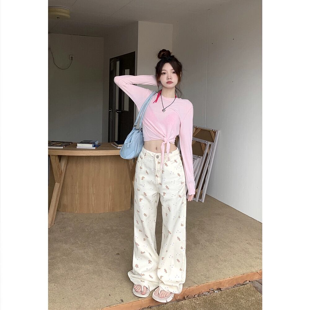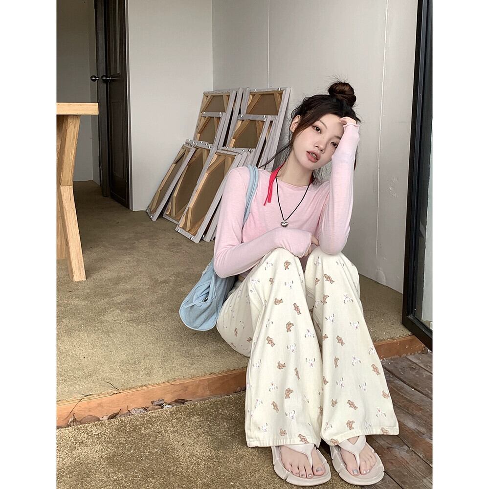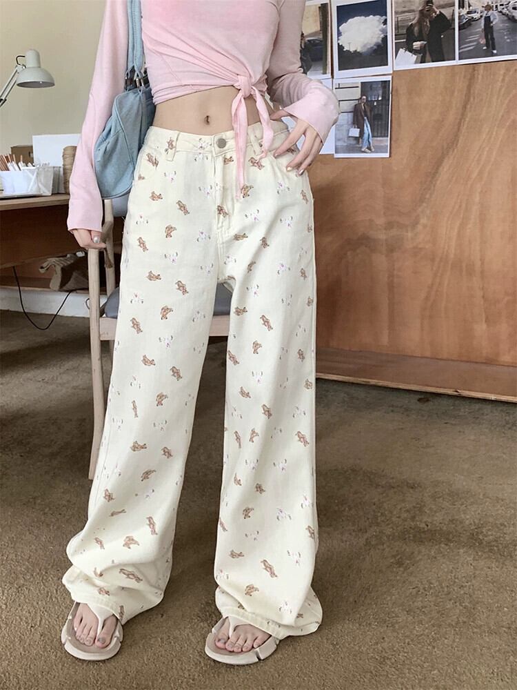 ホワイト ジーンズ レディース、春のデザイン、クマのプリント、ルーズ ワイドレッグ パンツ、ハイウエスト スリム ストレートレッグ フロアレングス パンツ スプリング 春物 missk87199482333