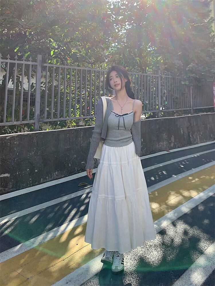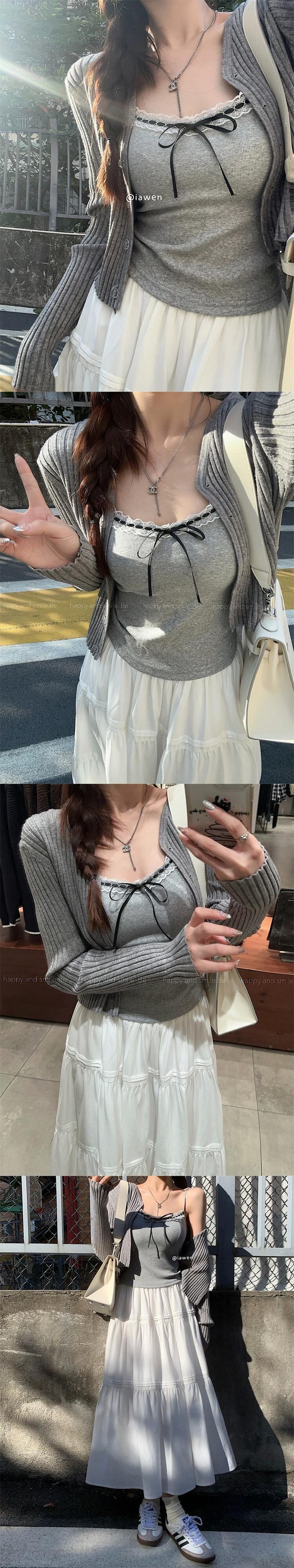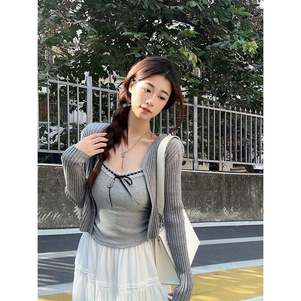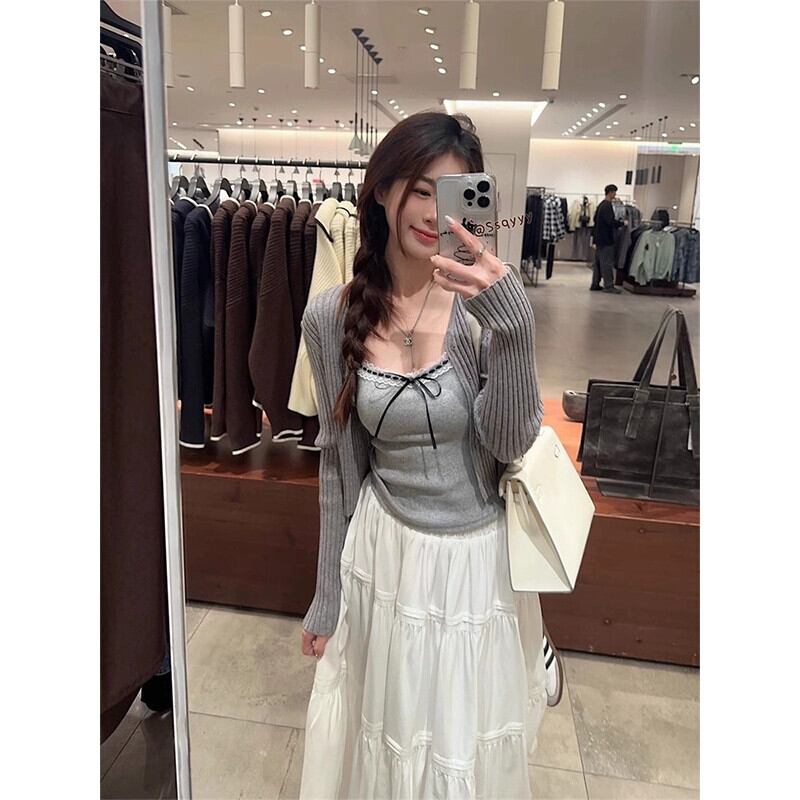 春の優しいスタイルスーツレディースグレーニットカーディガンジャケットレースキャミソールハイウエストスカート3点セット ハイウェスト スプリング 春物 missk6437491533