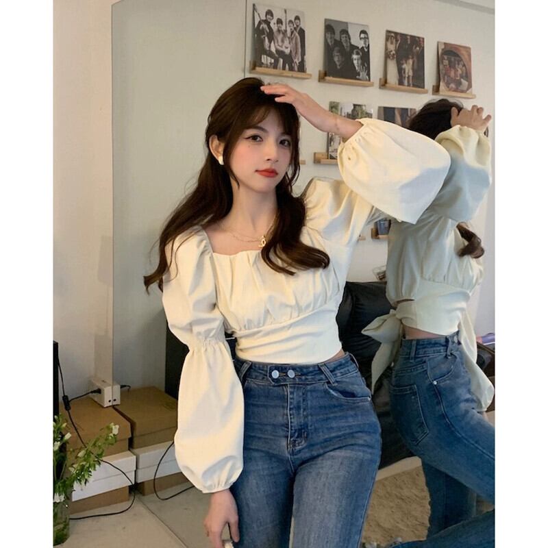 パフスリーブスクエアネックシャツレディース春新作フレンチニッチデザイン企みリボン長袖トップス ロング スプリング 春物 スクウェア missk15651817392