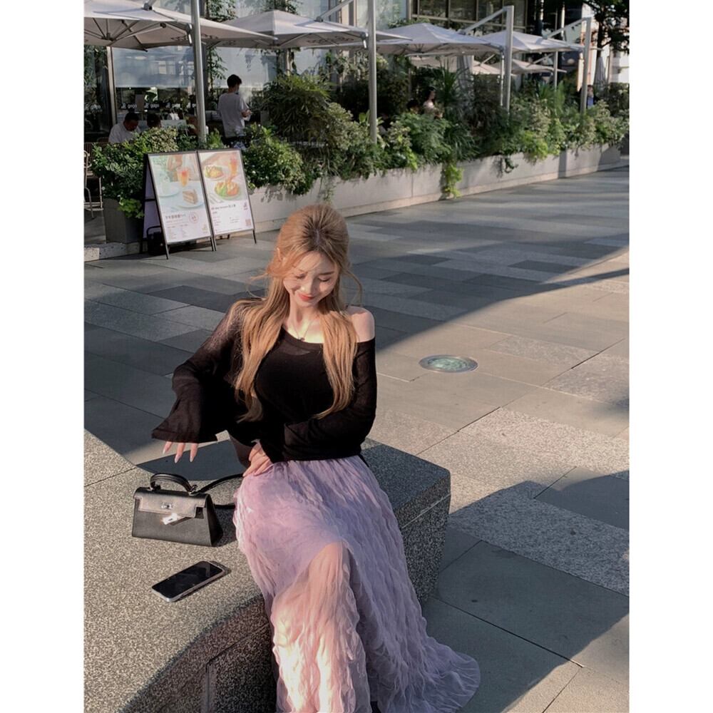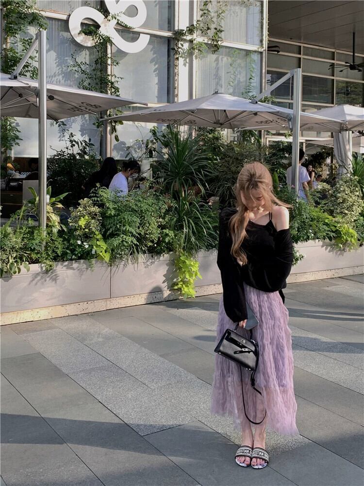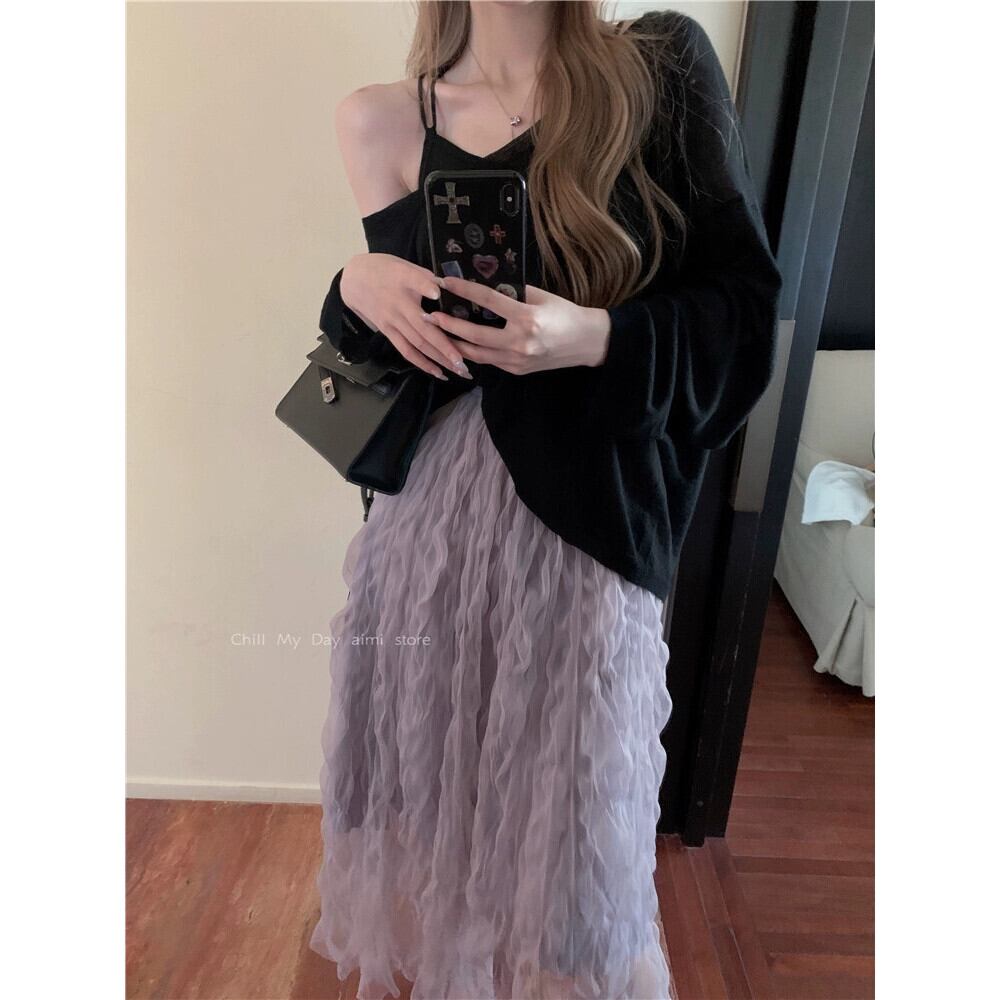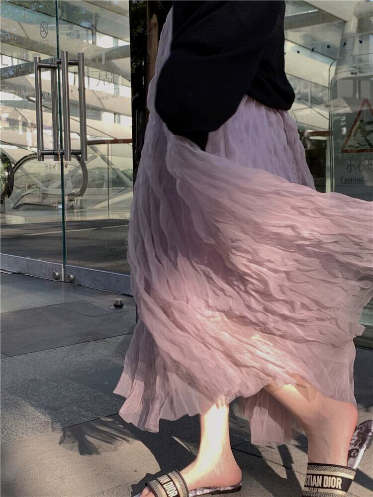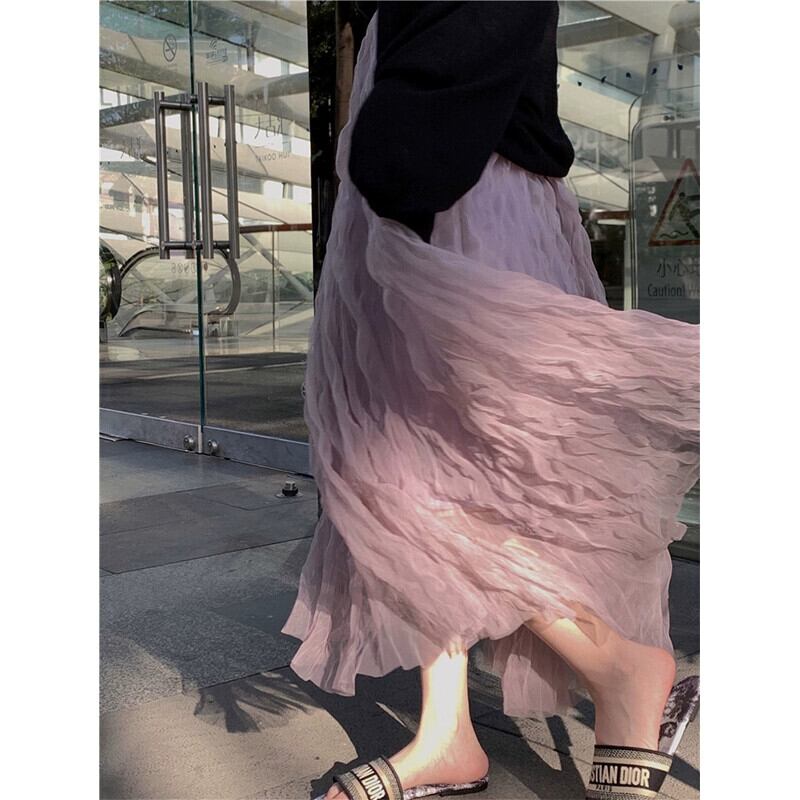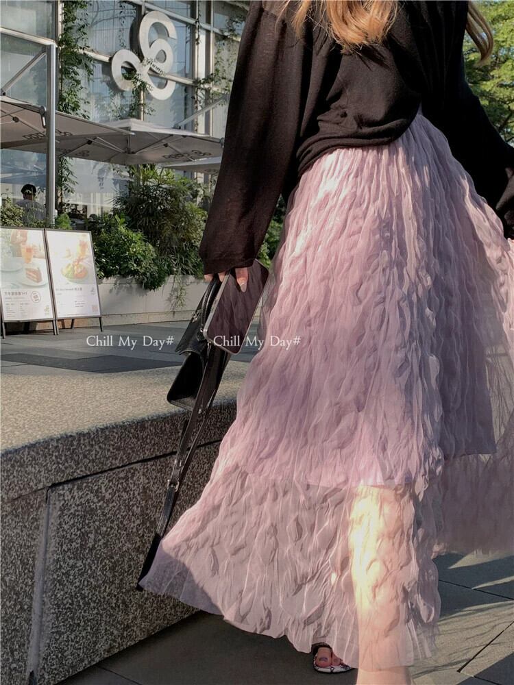 - 春のウエストスカートの女性、ハイエンド、とても素敵でエレガント、紫色のプリーツメッシュのミドル丈スカート、スリムなAラインスカート スプリング 春物 パープル missk64367053172