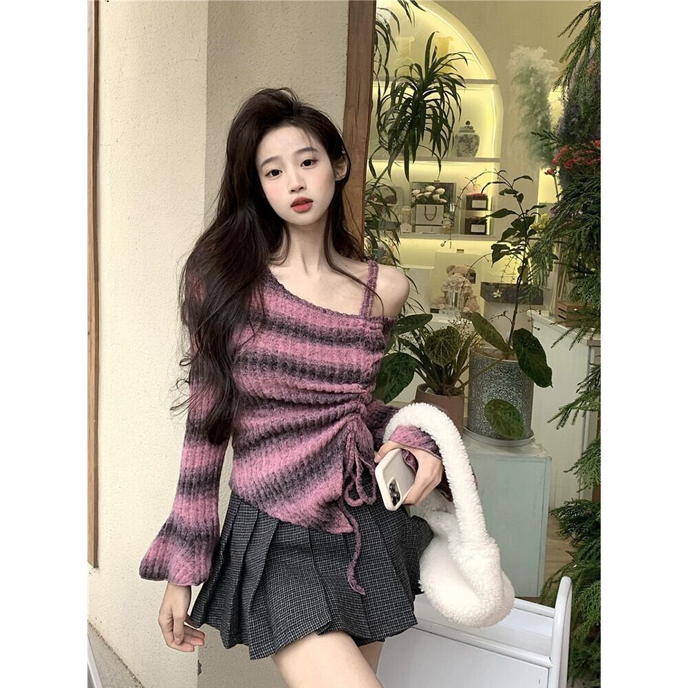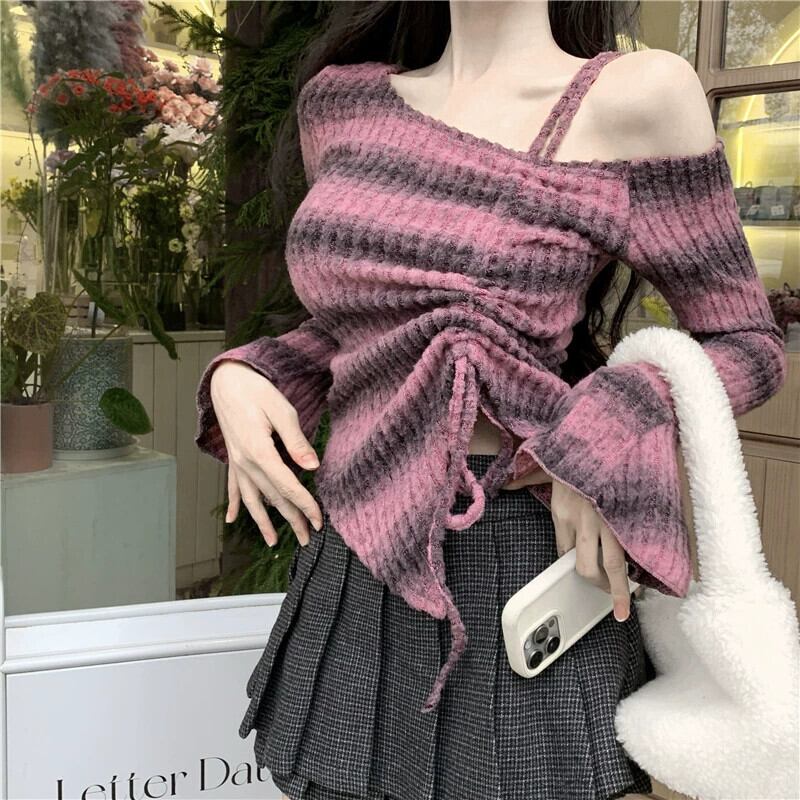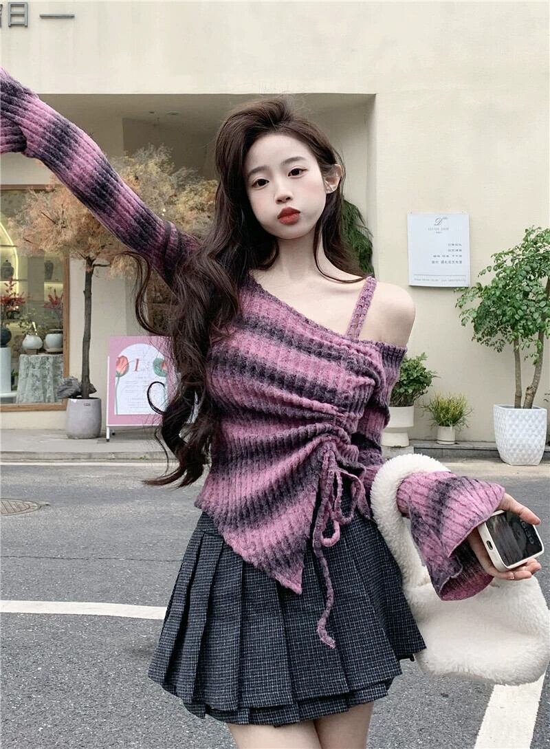 純粋な欲望巾着長袖セーター女性 2024 春の新デザインオフショルダー不規則な短い気質トップ ショート ロング スプリング 春物 missk13358423668