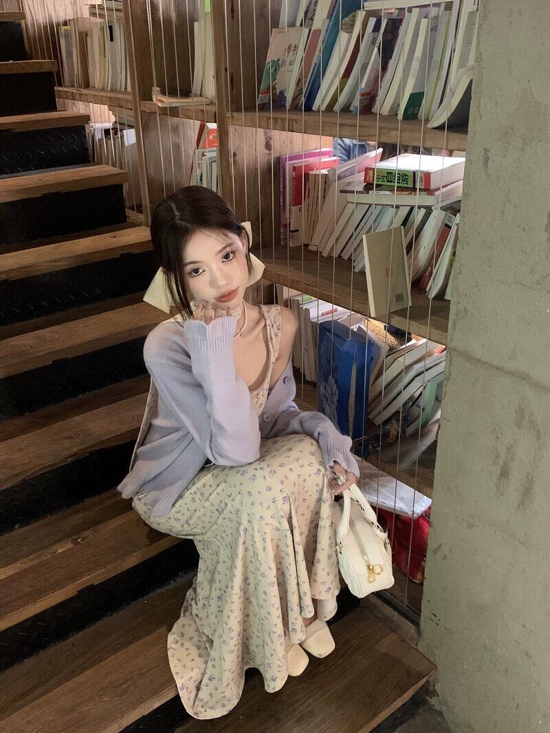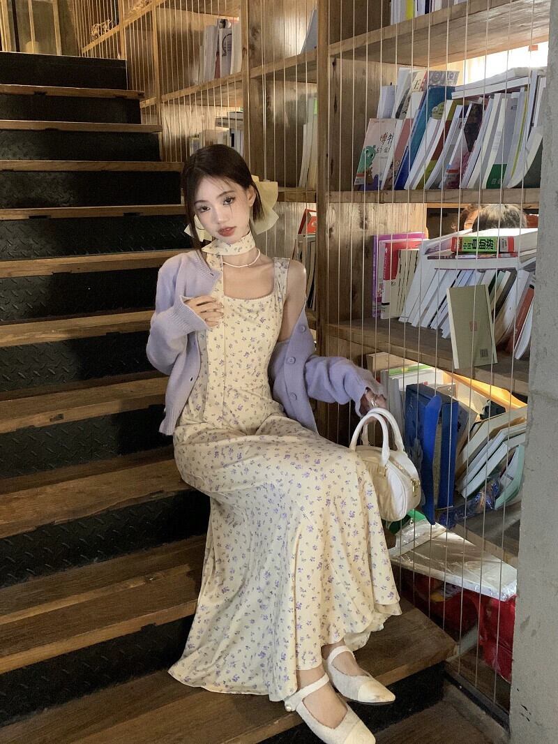 優しいスタイルの花サスペンダードレス女性春のフレンチスタイルウエスト痩身フィッシュテールスカート海辺の休暇ロングドレス スプリング 春物 花柄 missk47759984243